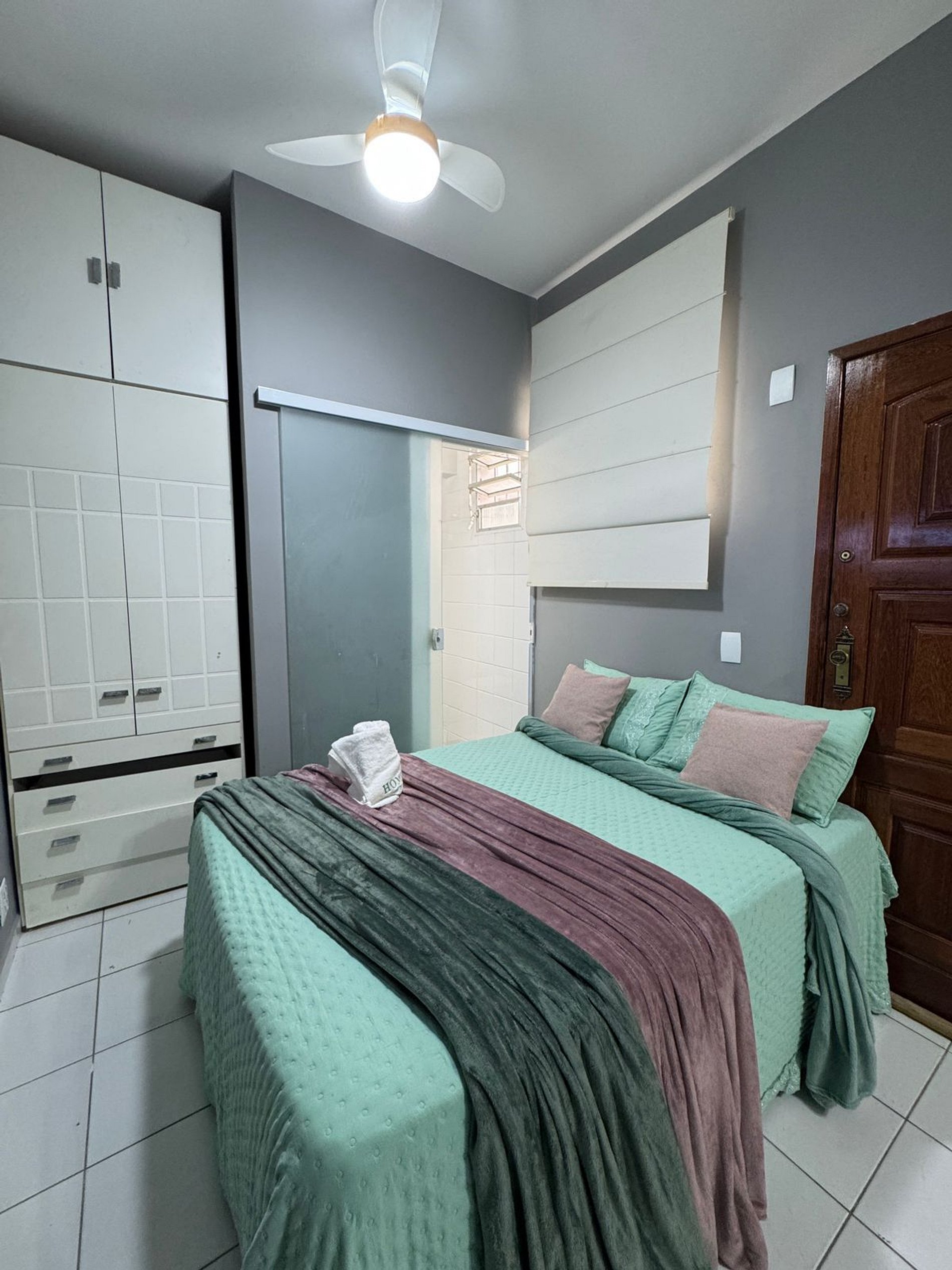 Também equipada com cama de casal, Smart TV, ventilador de teto, guarda-roupa, ferro de passar e roupas de cama, esta suíte oferece um ambiente acolhedor e funcional. Observação: este quarto não possui ar-condicionado. O banheiro privativo segue o mesmo padrão de conforto, com chuveiro a gás, secador de cabelo e toalhas disponíveis.