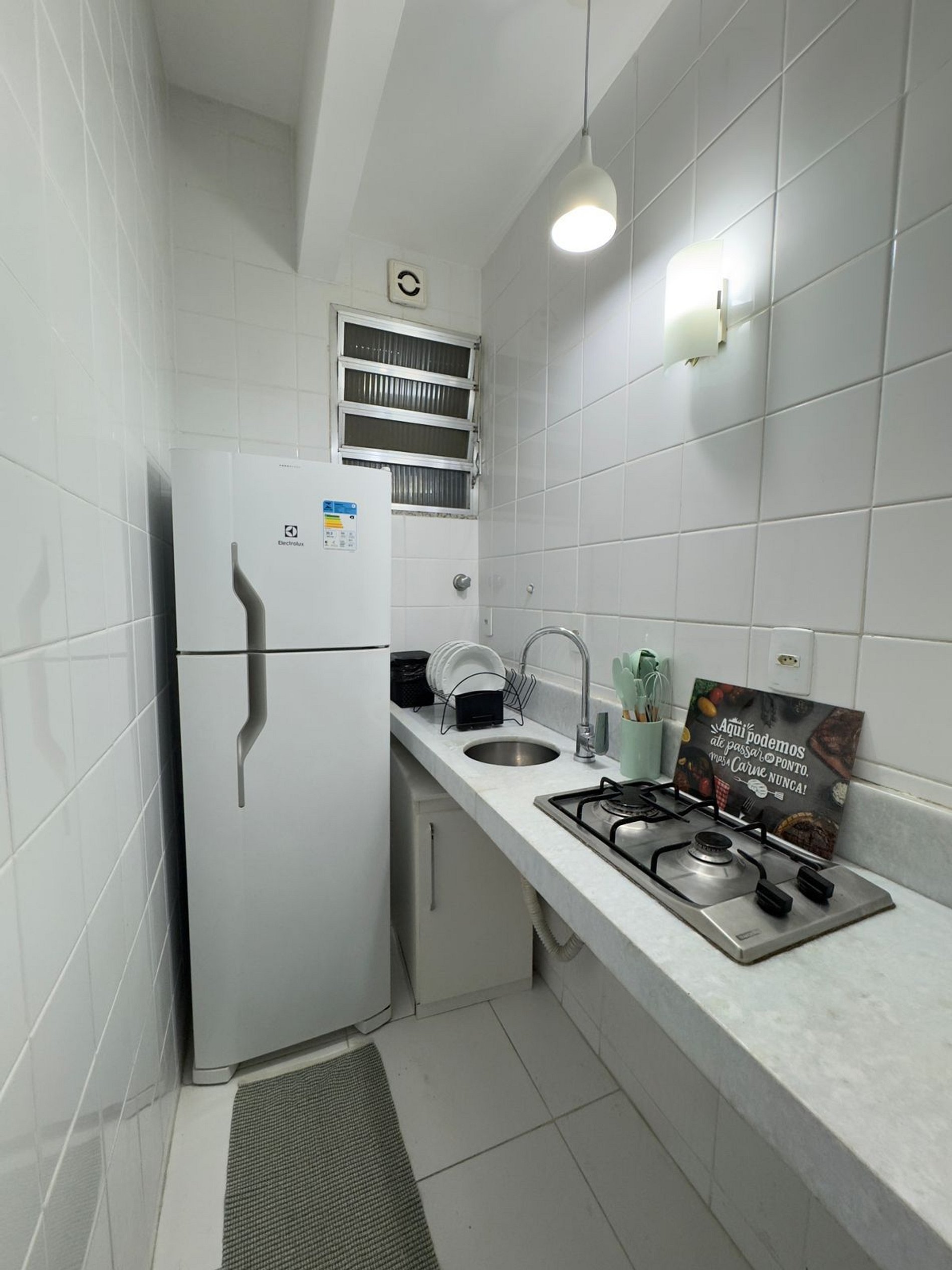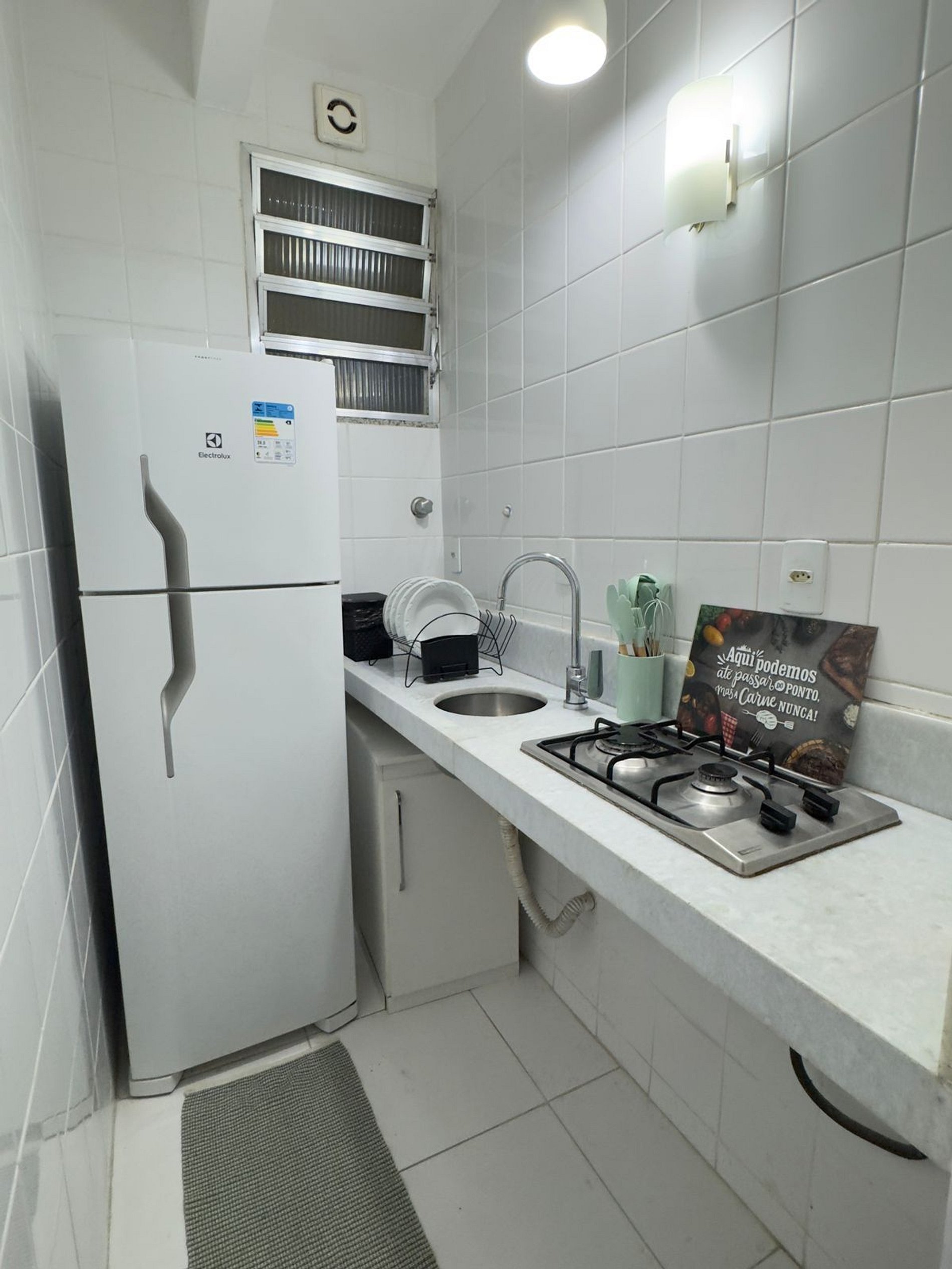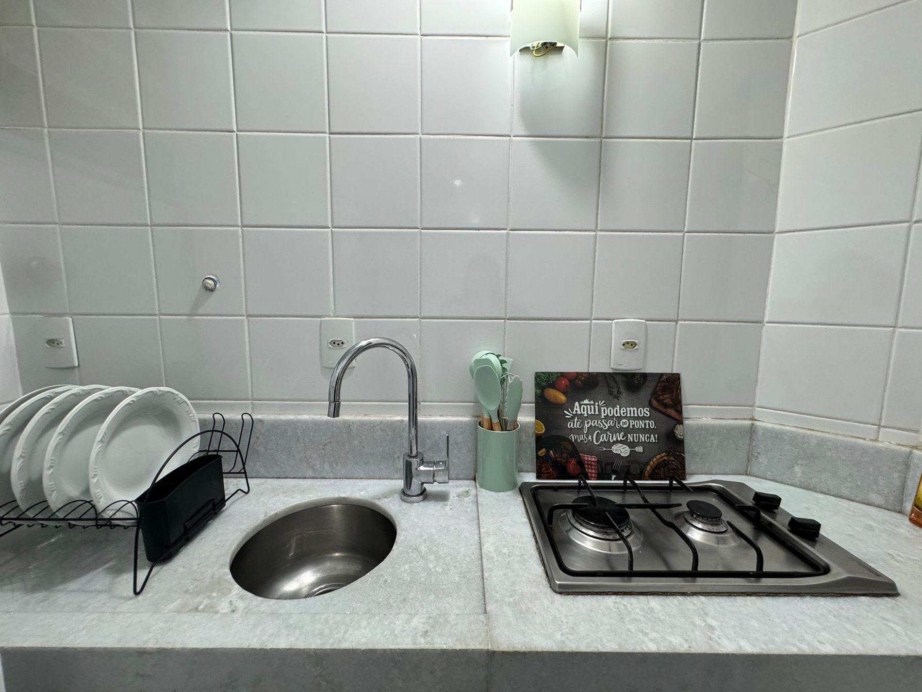 A cozinha está totalmente equipada com tudo o que você precisa para preparar suas refeições com praticidade: geladeira, fogão, micro-ondas, cafeteira e utensílios diversos para cozinhar.