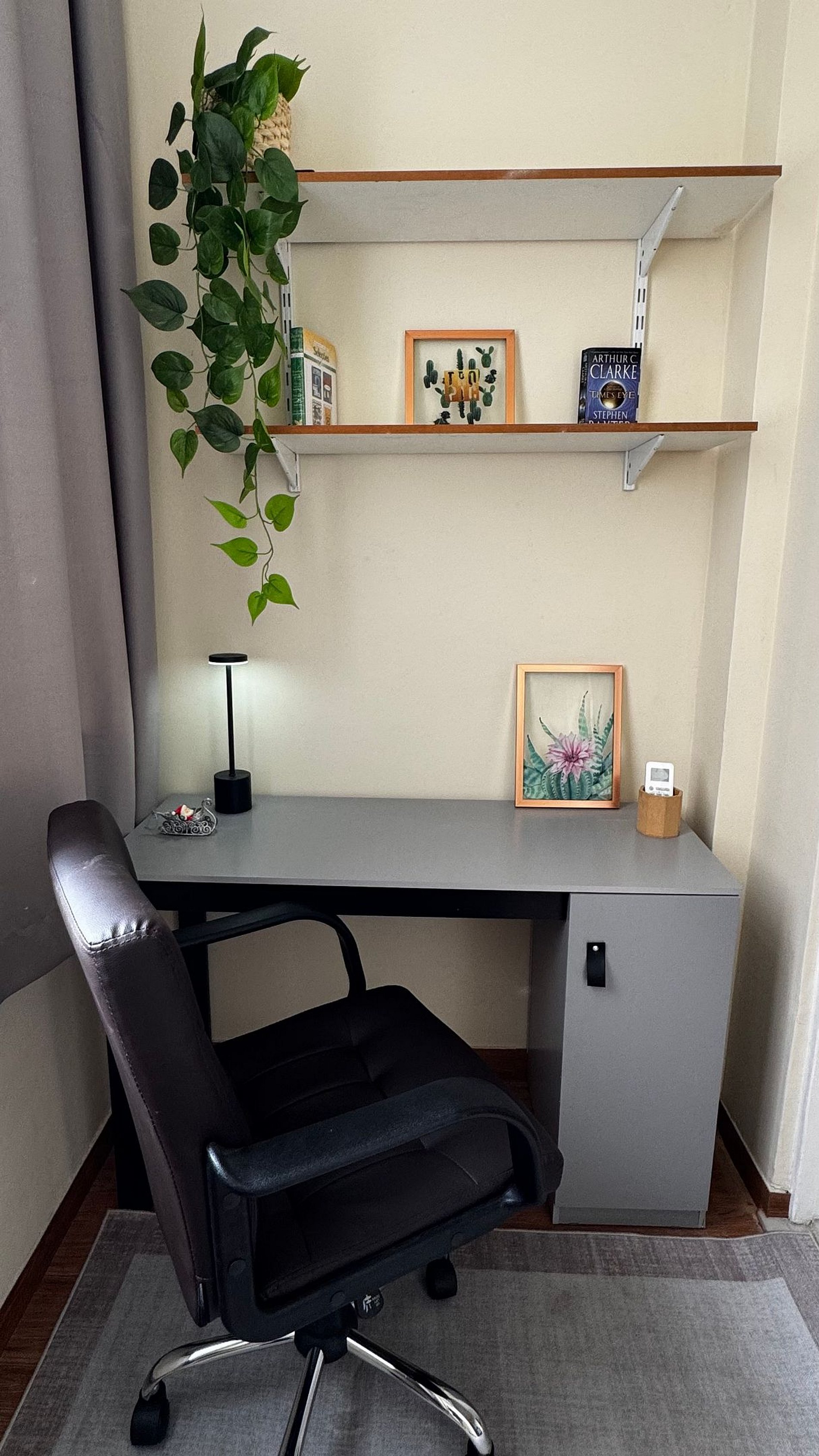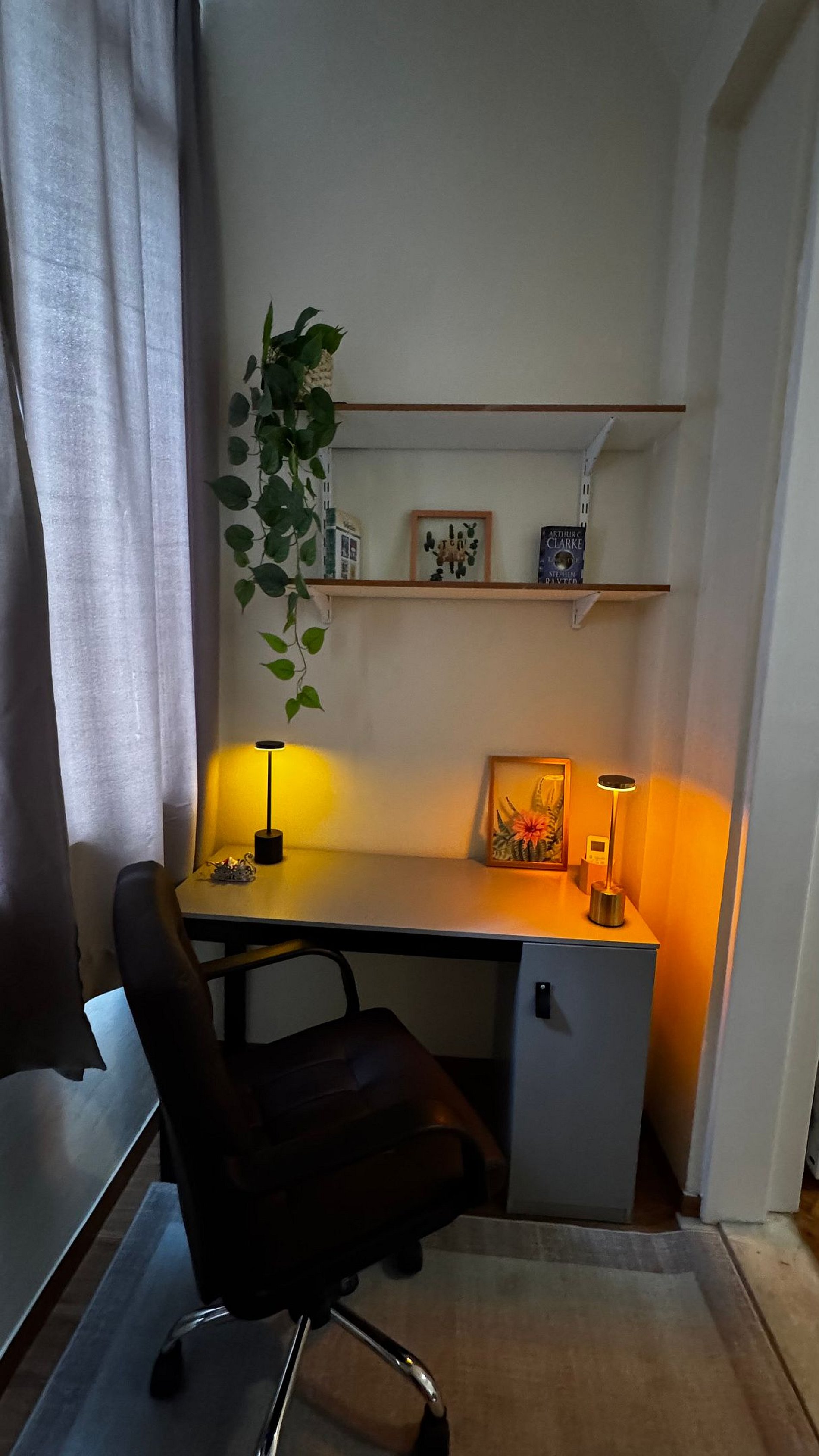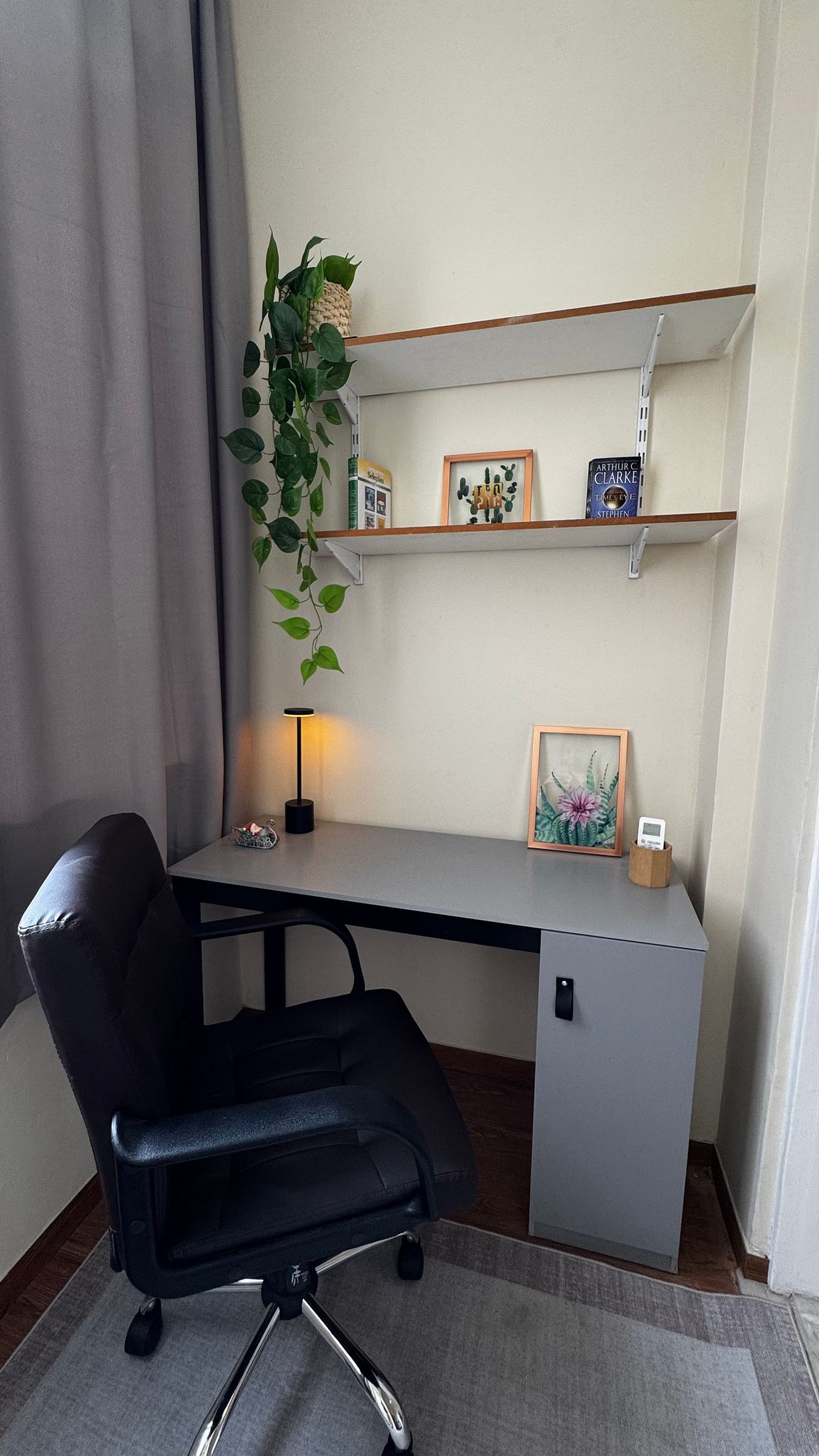 A sala é acolhedora e bem distribuída, com sofá-cama casal, mesa de jantar e um espaço de escritório ideal para trabalhar ou estudar, equipado com mesa e cadeira perfeito para quem faz home office.