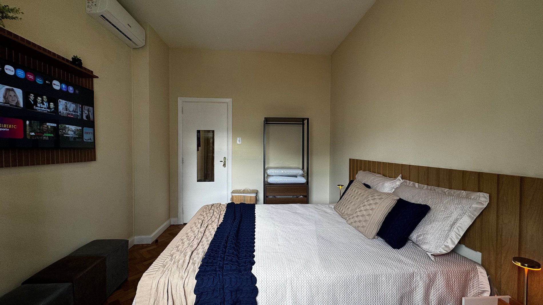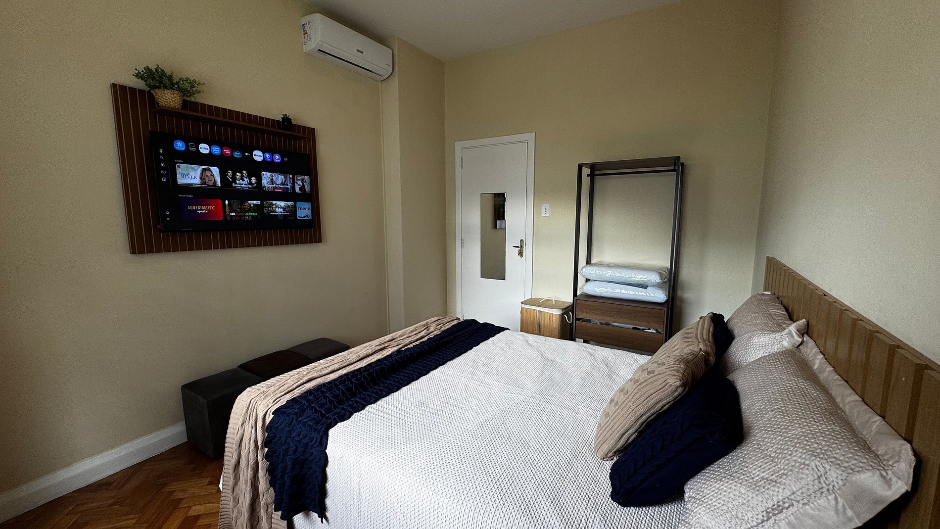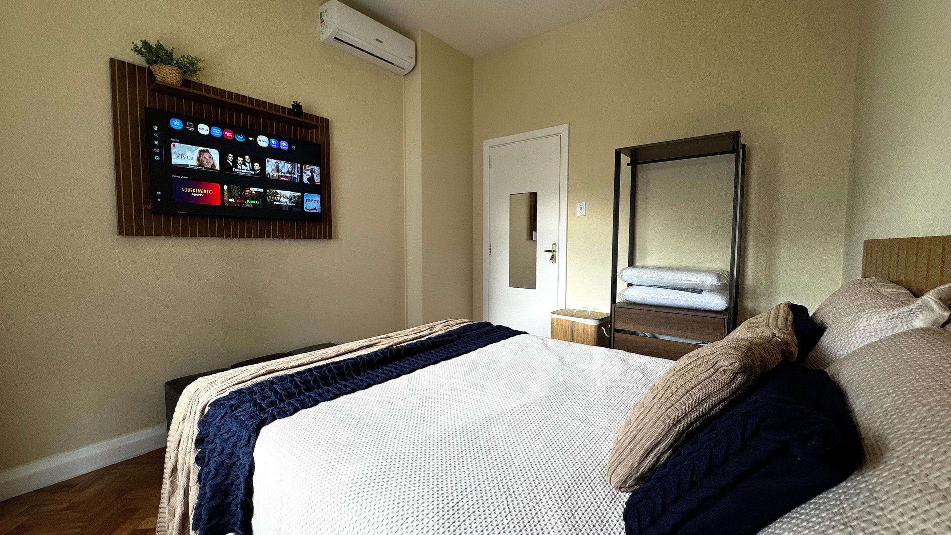 O quarto oferece uma cama de casal confortável, Smart TV, ar-condicionado, arara para roupas, roupas de cama de qualidade e ferro de passar, garantindo praticidade e descanso após um dia cheio.