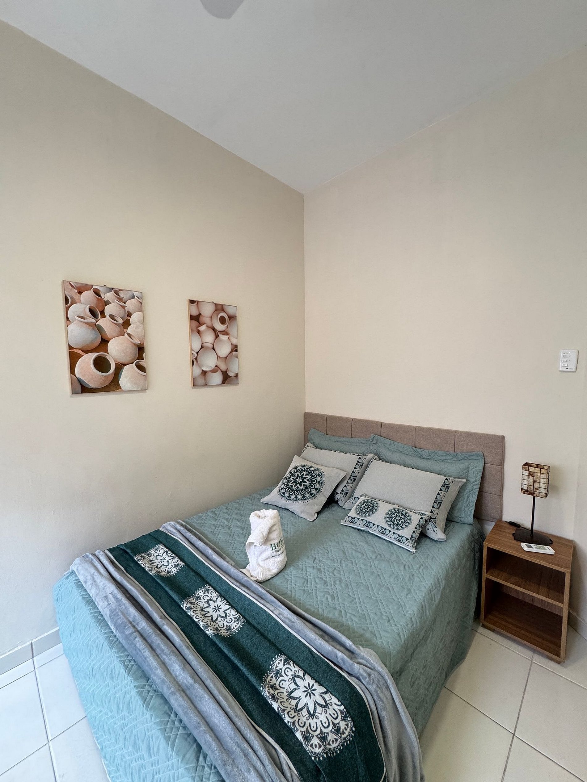 O segundo quarto também oferece uma cama de casal, ar-condicionado, guarda-roupa e enxoval completo, garantindo noites tranquilas de descanso.
