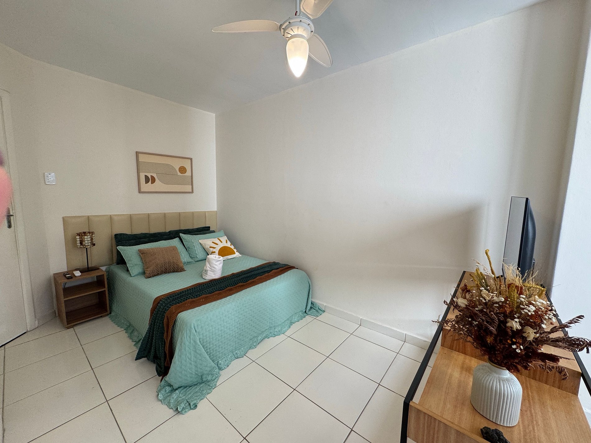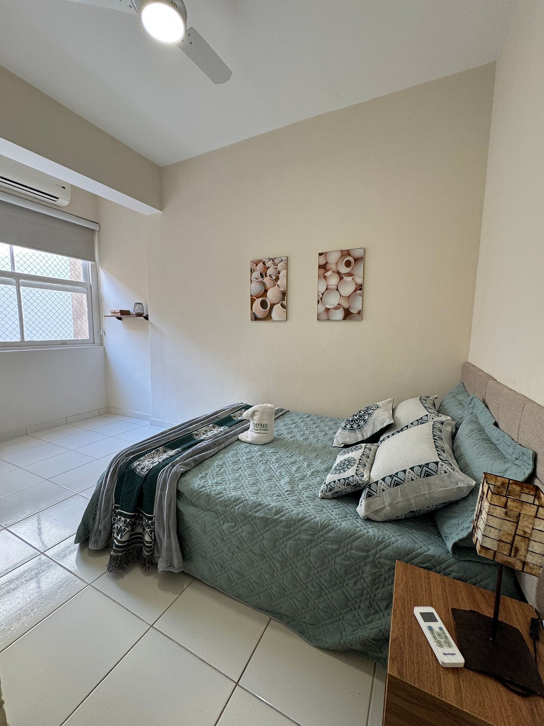 O primeiro quarto conta com uma cama de casal, ar-condicionado, Smart TV, guarda-roupa espaçoso e roupas de cama macias perfeito para relaxar após um dia de praia.