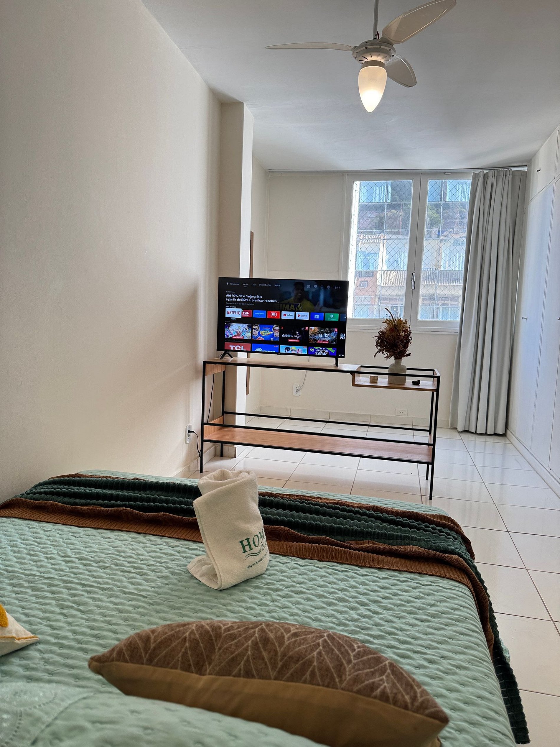 O segundo quarto também oferece uma cama de casal, ar-condicionado, guarda-roupa e enxoval completo, garantindo noites tranquilas de descanso.
