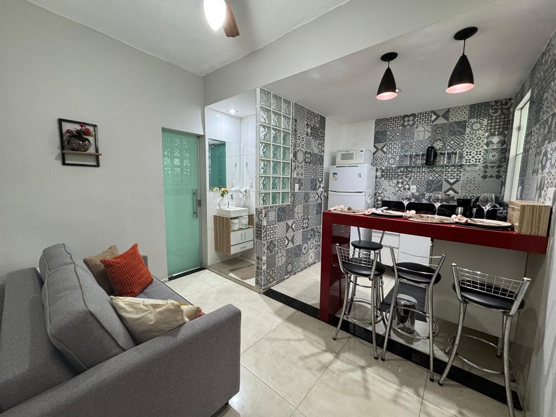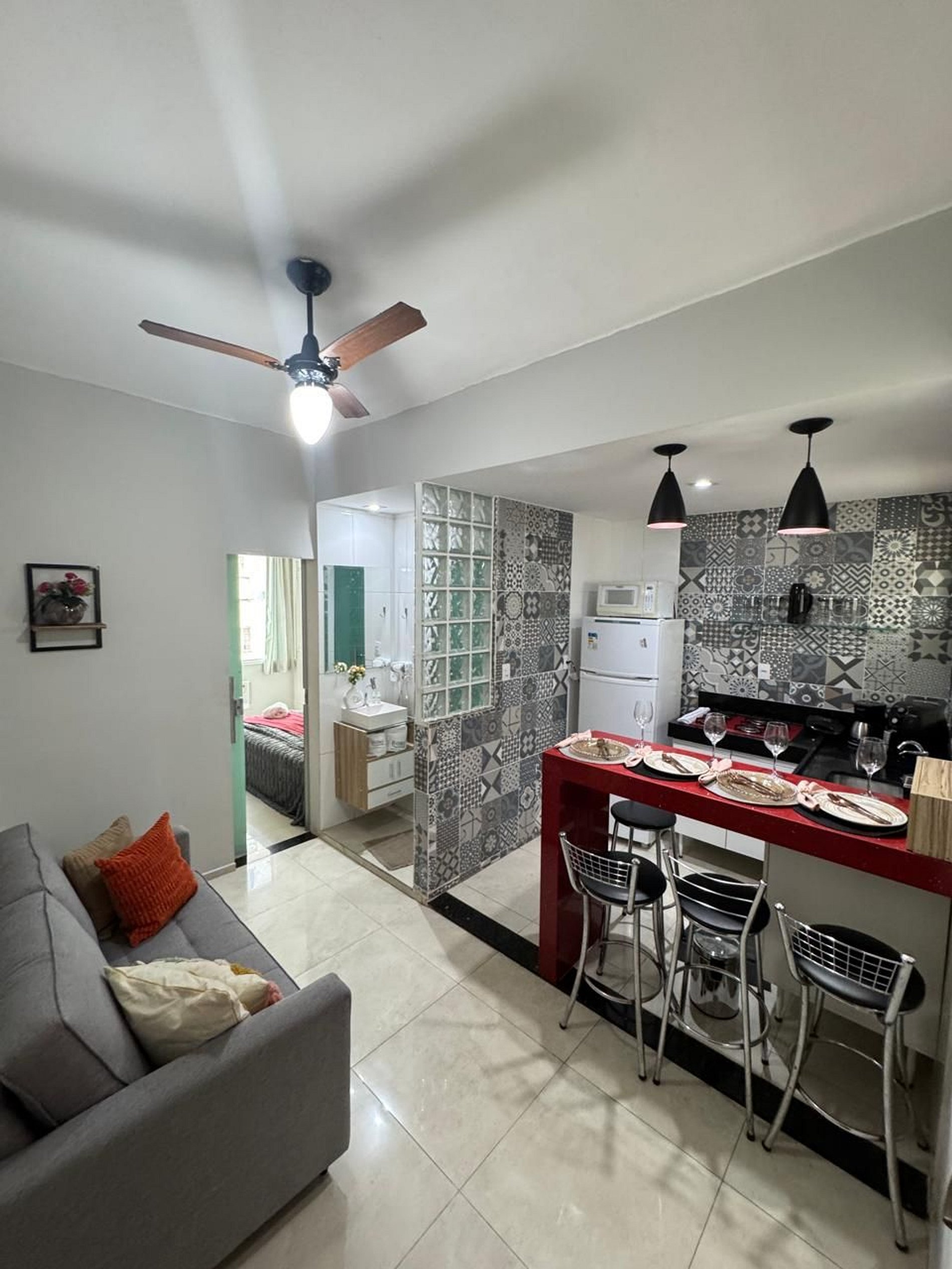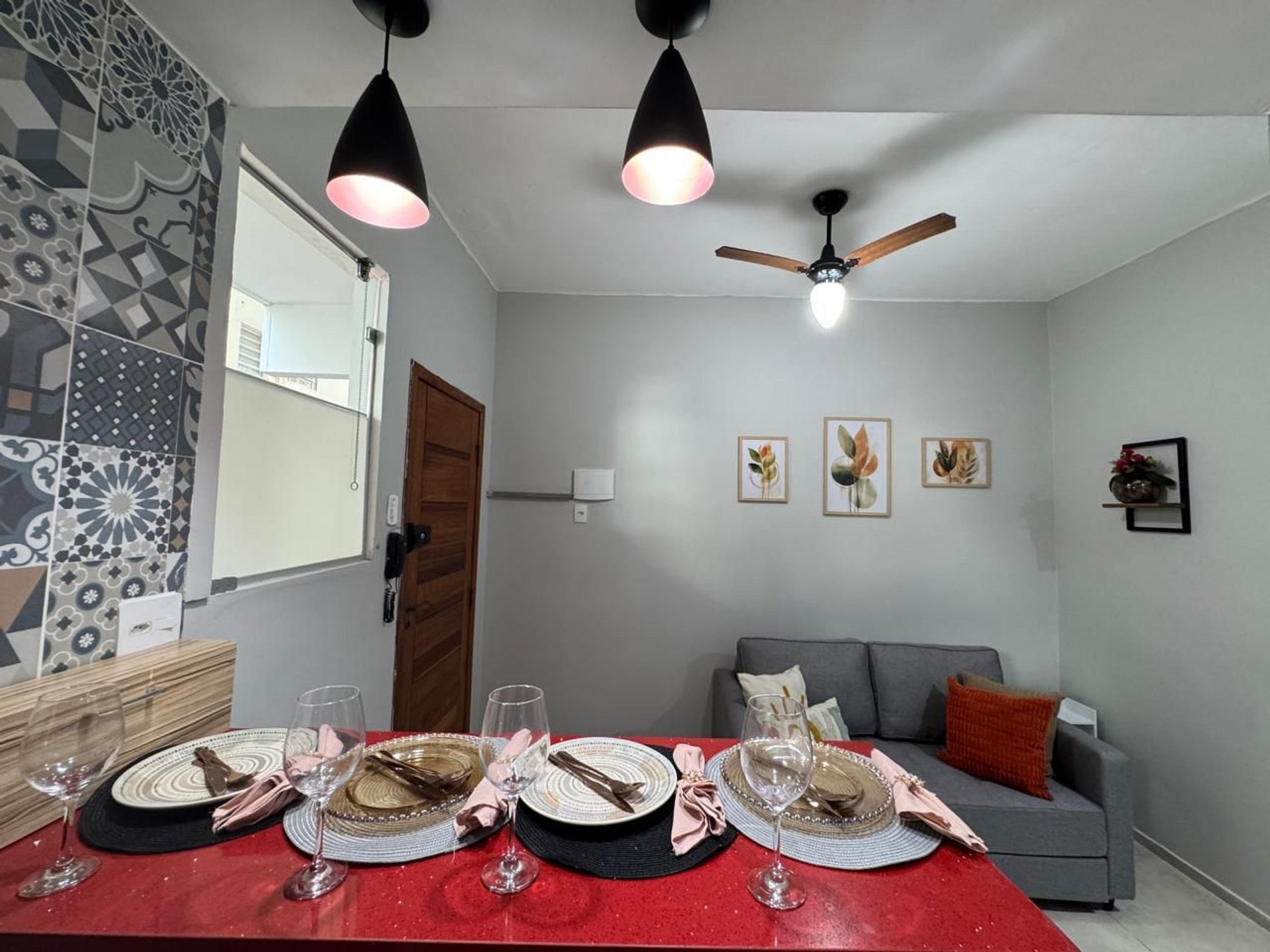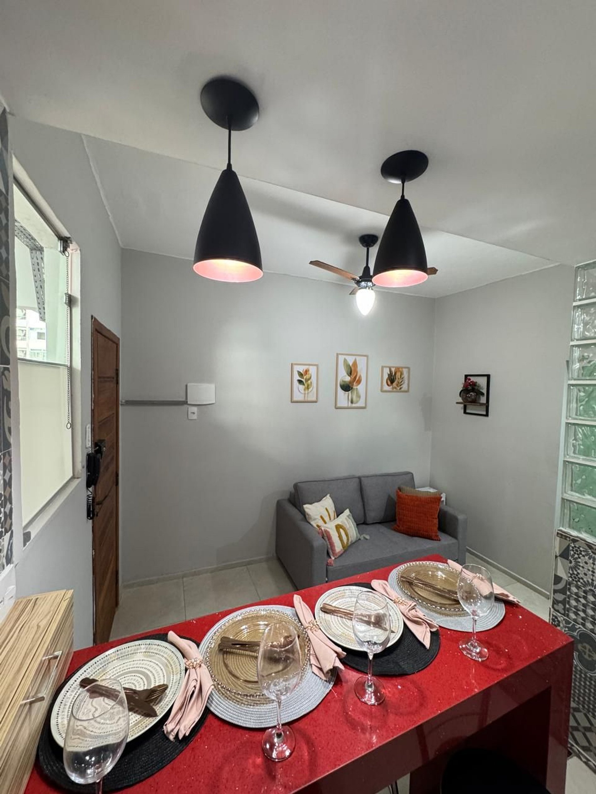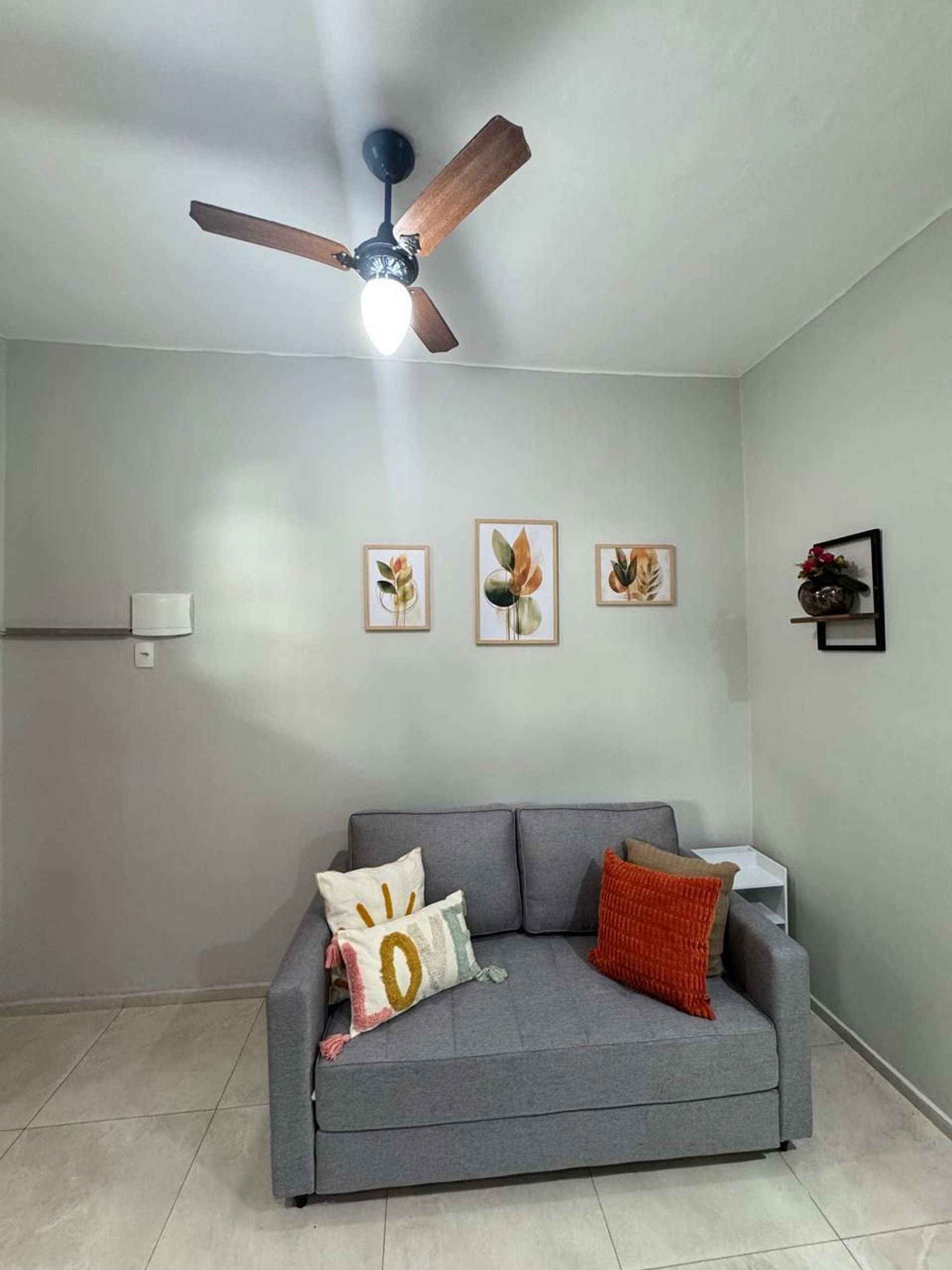 Sala de estar com sofá-cama confortável, ventilador de teto, decoração leve e agradável perfeita para relaxar após um dia de passeios.
