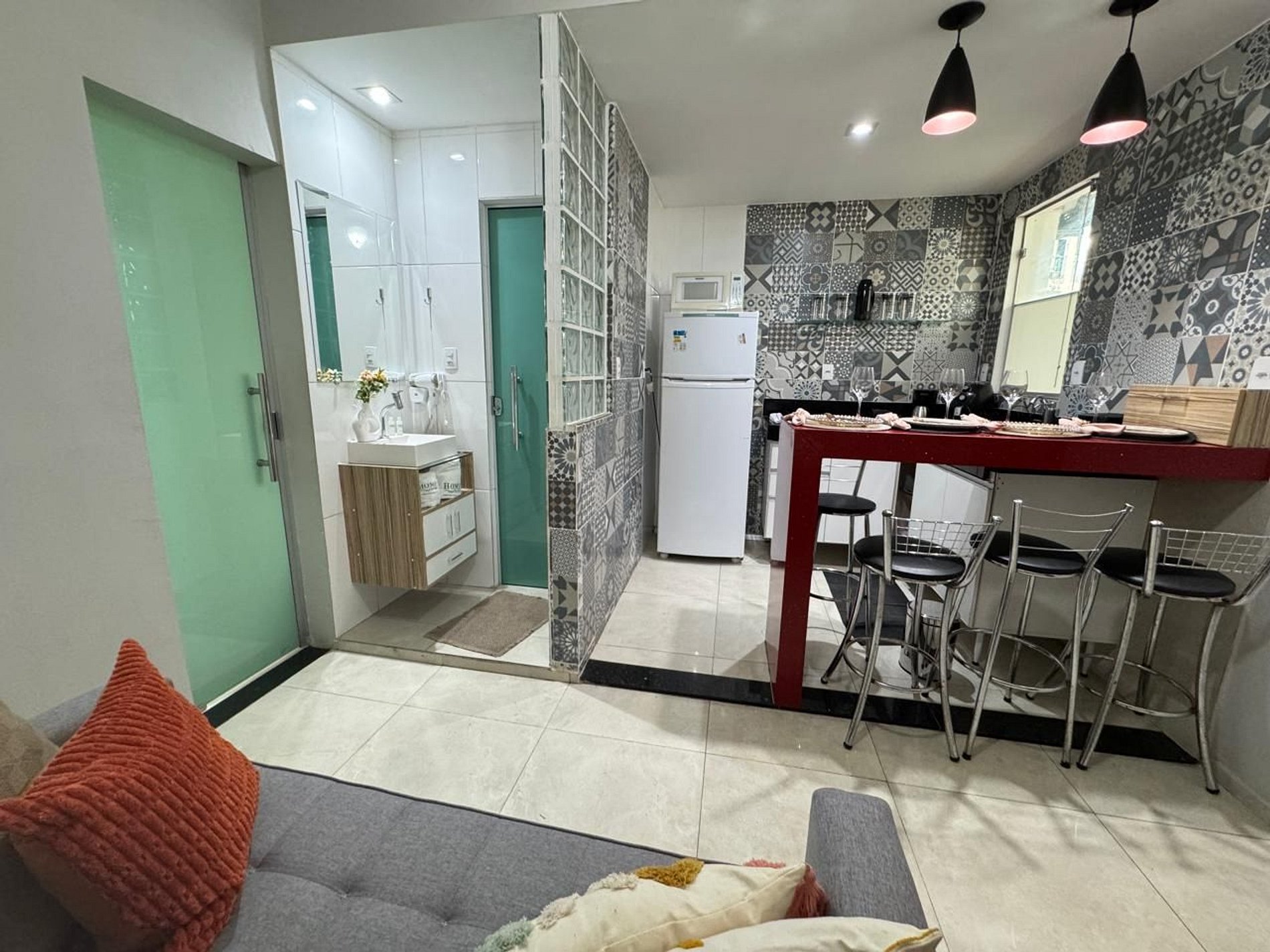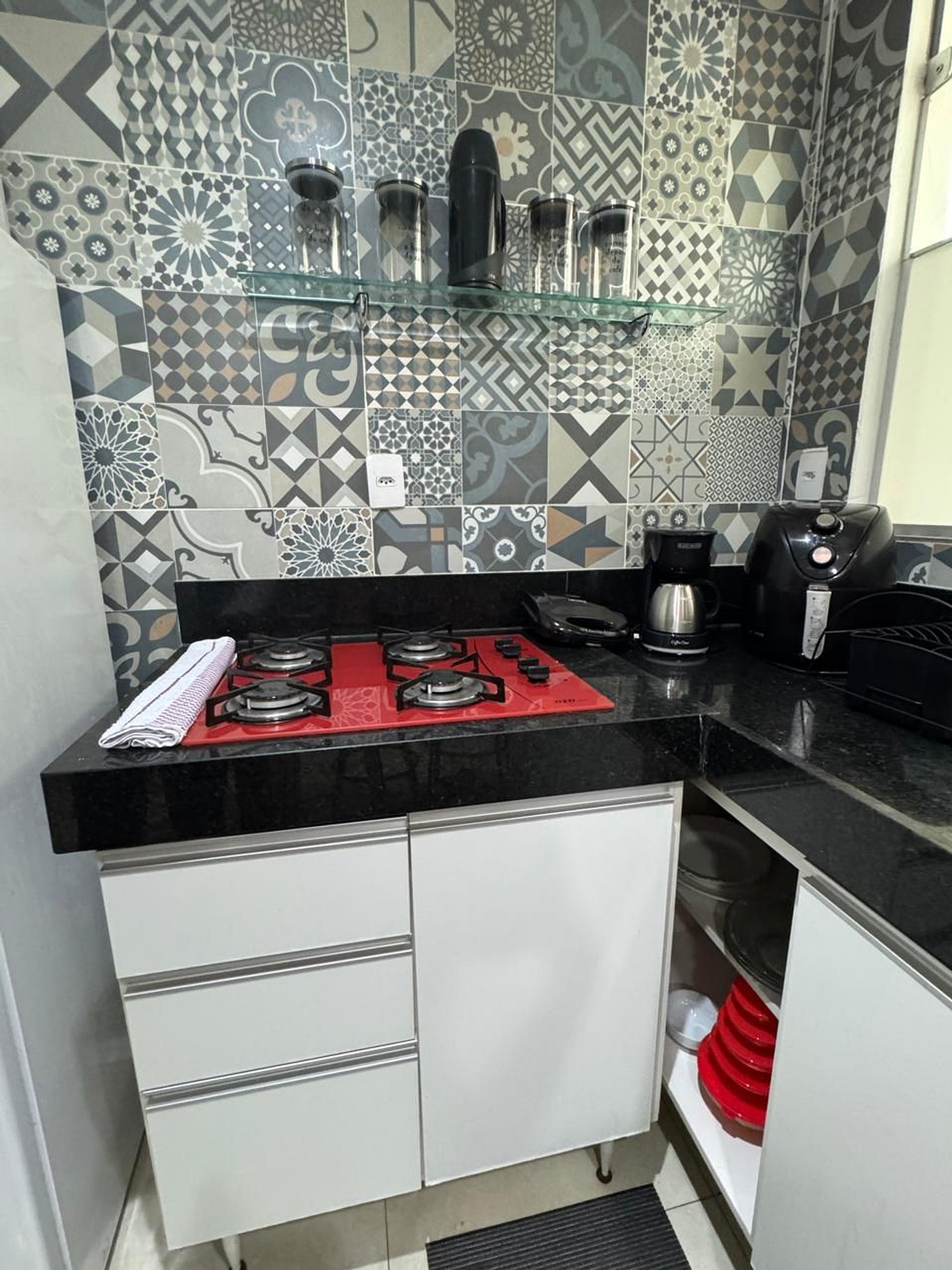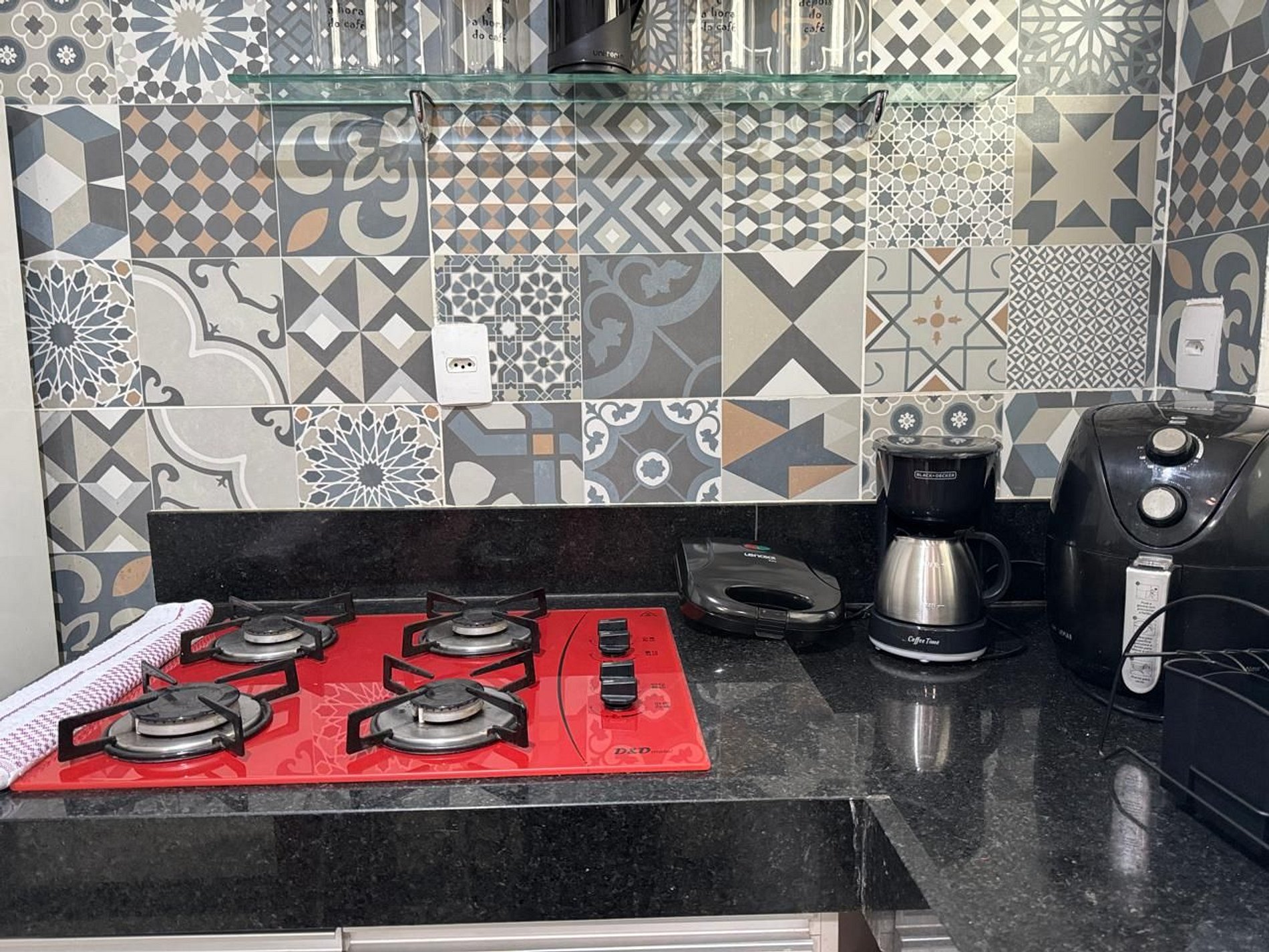 Cozinha americana equipada com tudo que você precisa: geladeira, fogão, micro-ondas, airfryer, cafeteira, sanduicheira e diversos utensílios para cozinhar com praticidade.