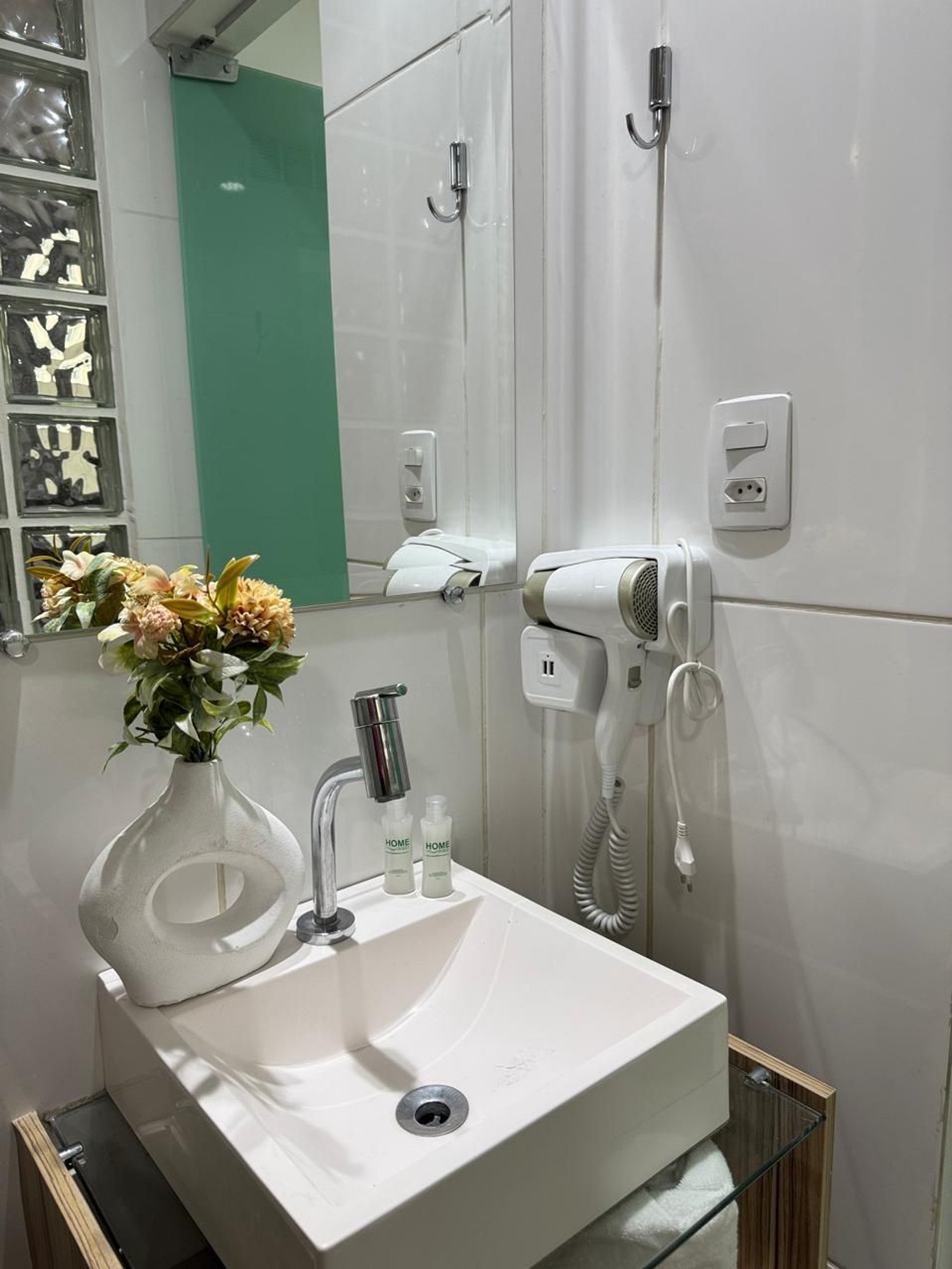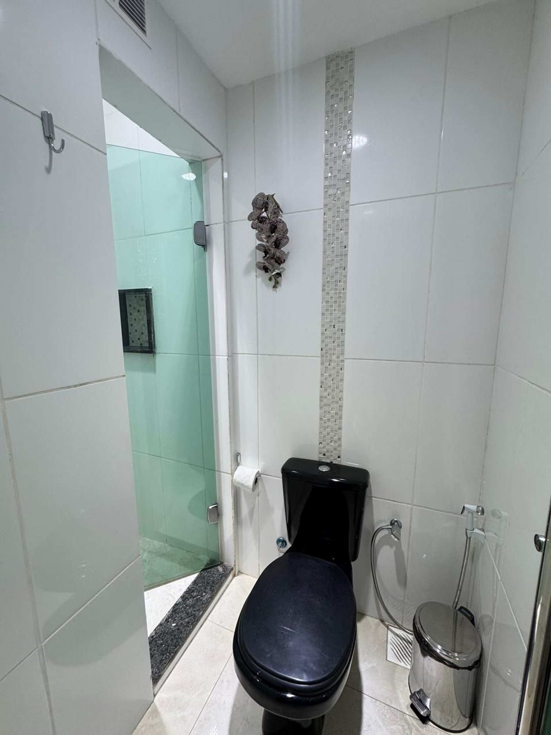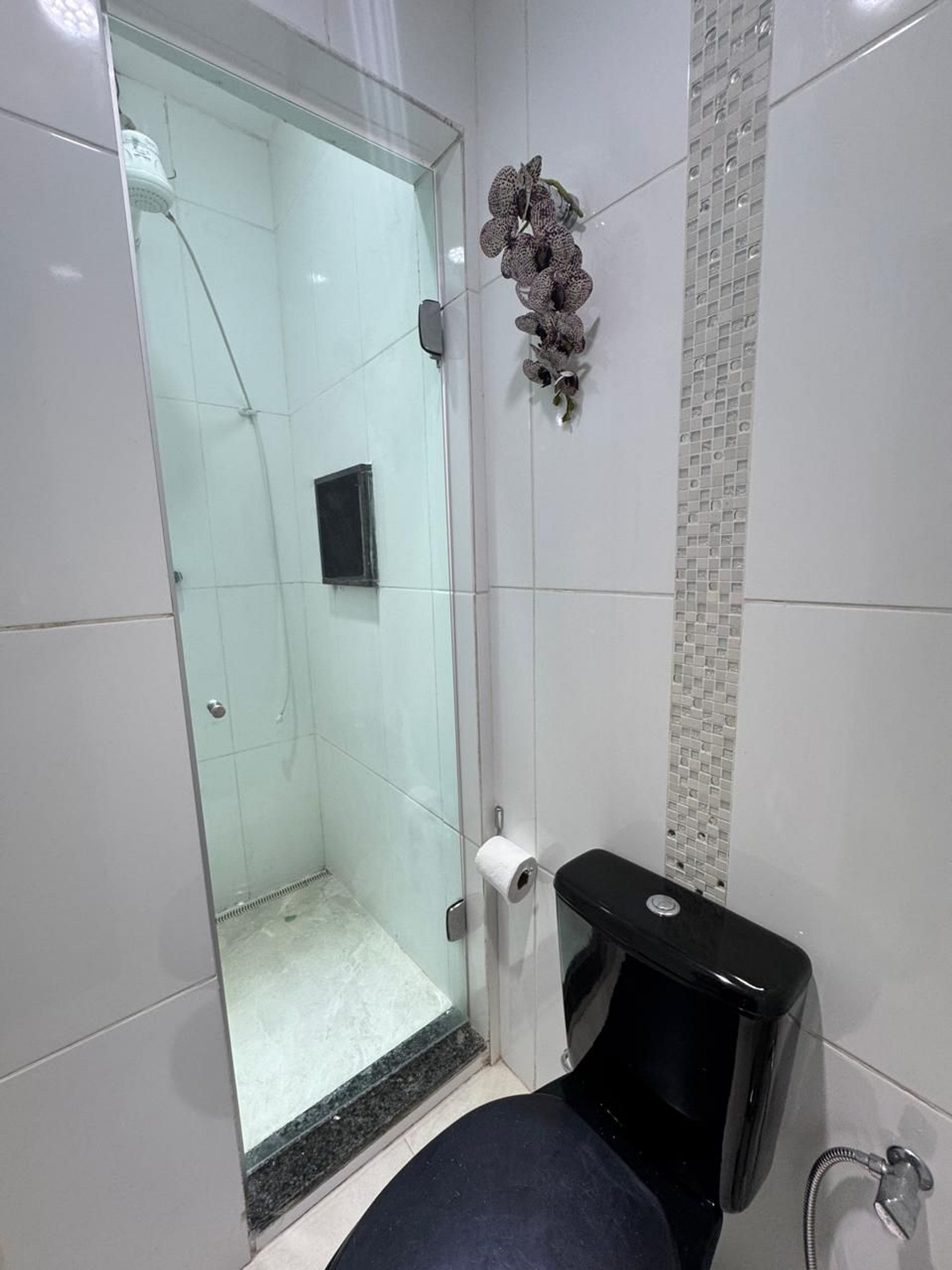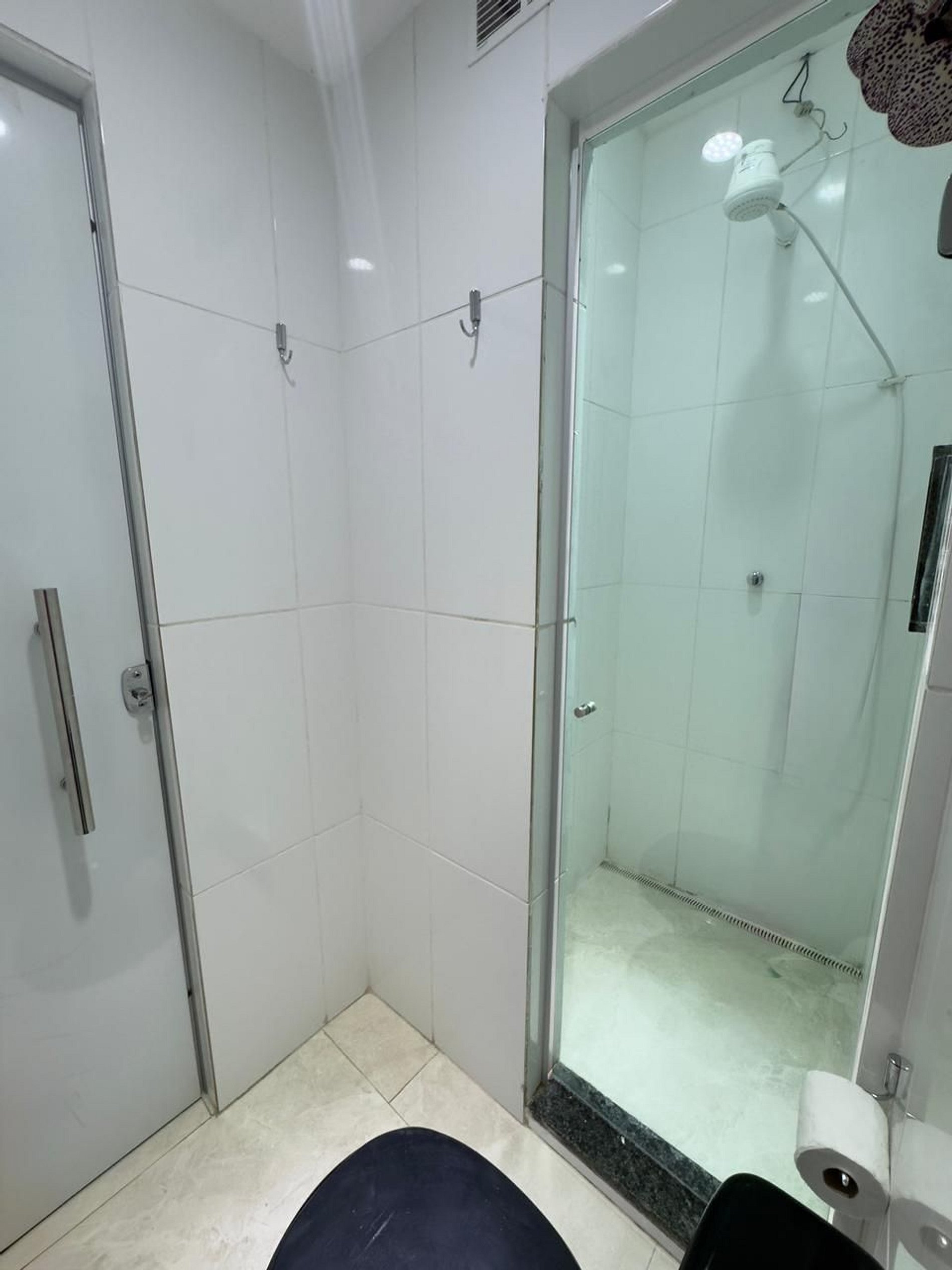 Banheiro com chuveiro elétrico, secador de cabelo, toalhas limpas e tudo o que você precisa para o seu conforto.