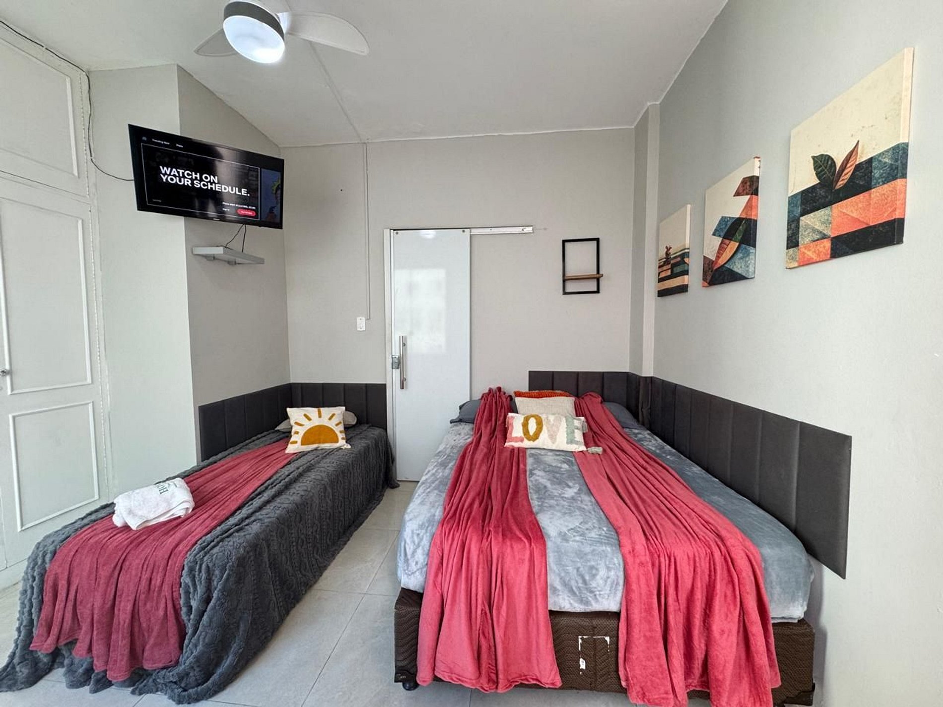 Quarto privativo com 1 cama de casal e 1 cama de solteiro, além de Smart TV, ar-condicionado, ventilador de teto, ferro de passar e roupas de cama limpas e macias.