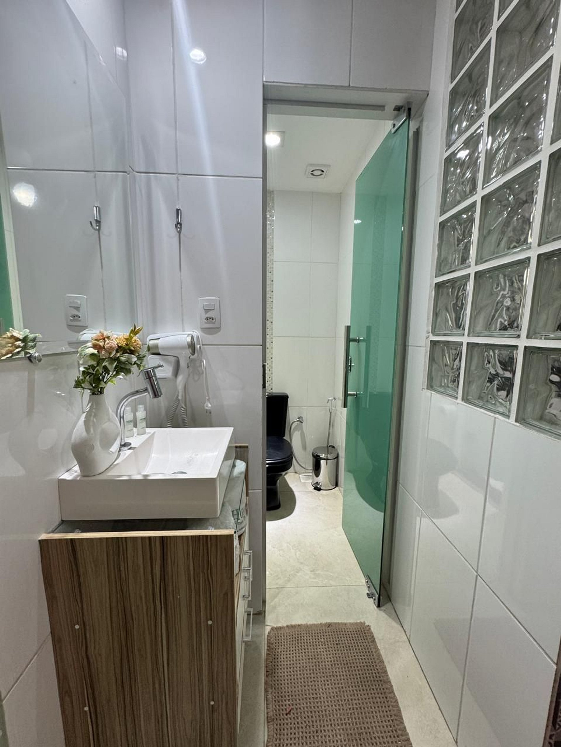 Banheiro com chuveiro elétrico, secador de cabelo, toalhas limpas e tudo o que você precisa para o seu conforto.
