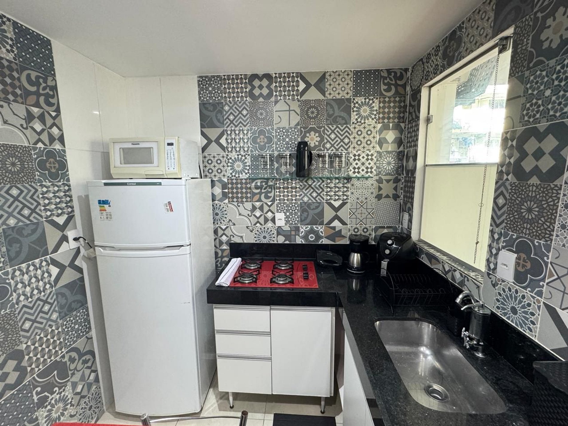 Cozinha americana equipada com tudo que você precisa: geladeira, fogão, micro-ondas, airfryer, cafeteira, sanduicheira e diversos utensílios para cozinhar com praticidade.
