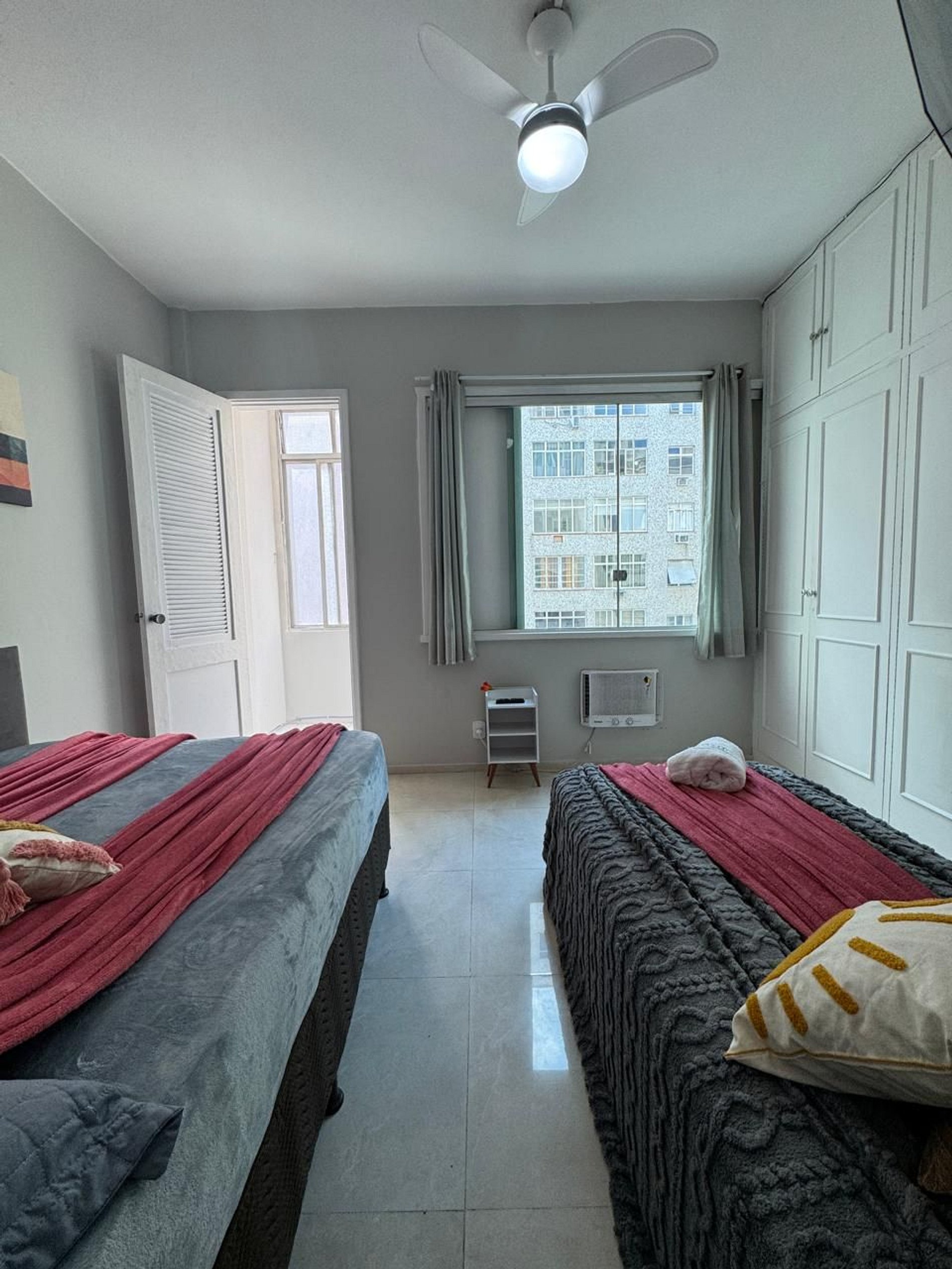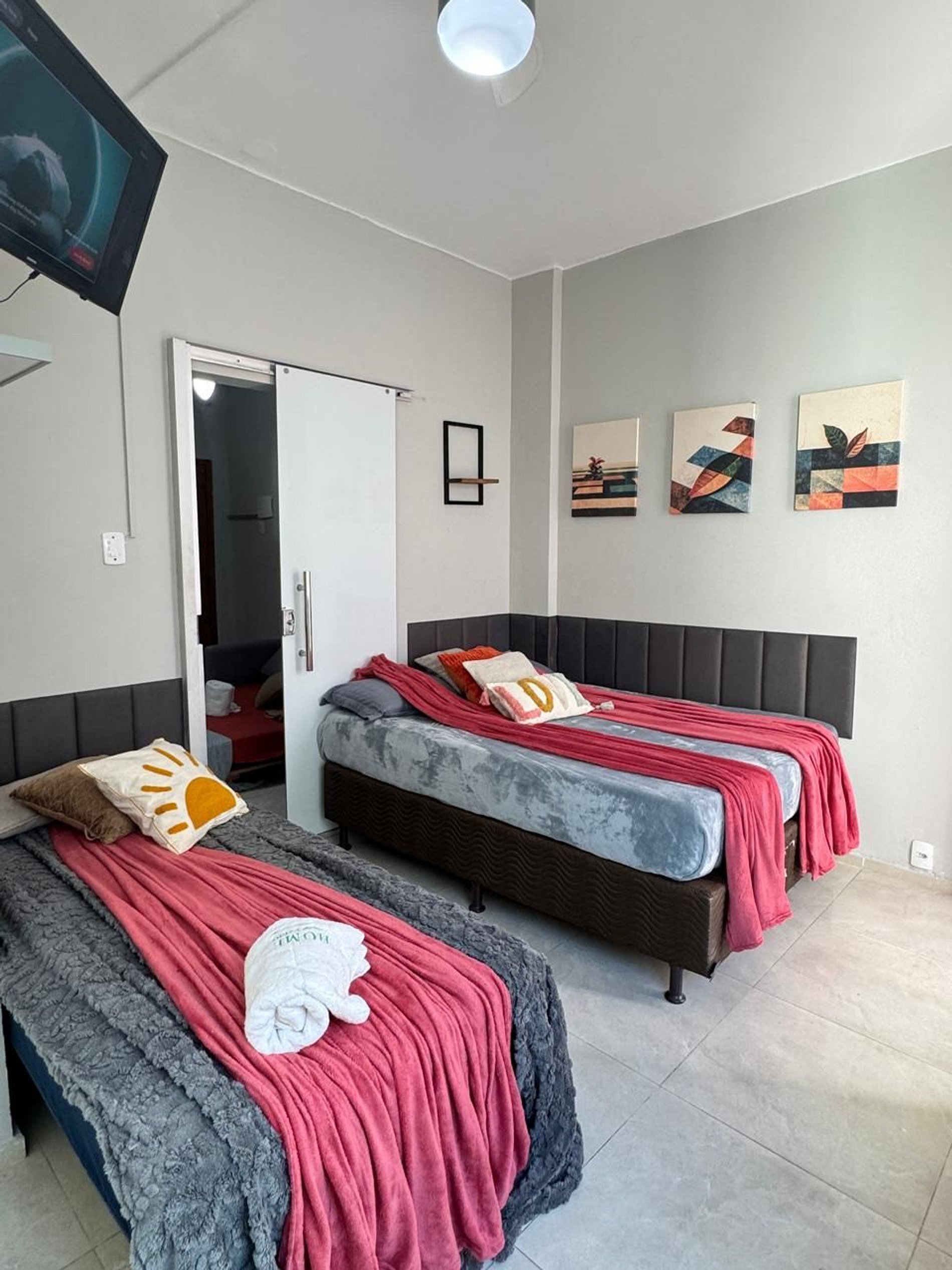Quarto privativo com 1 cama de casal e 1 cama de solteiro, além de Smart TV, ar-condicionado, ventilador de teto, ferro de passar e roupas de cama limpas e macias.