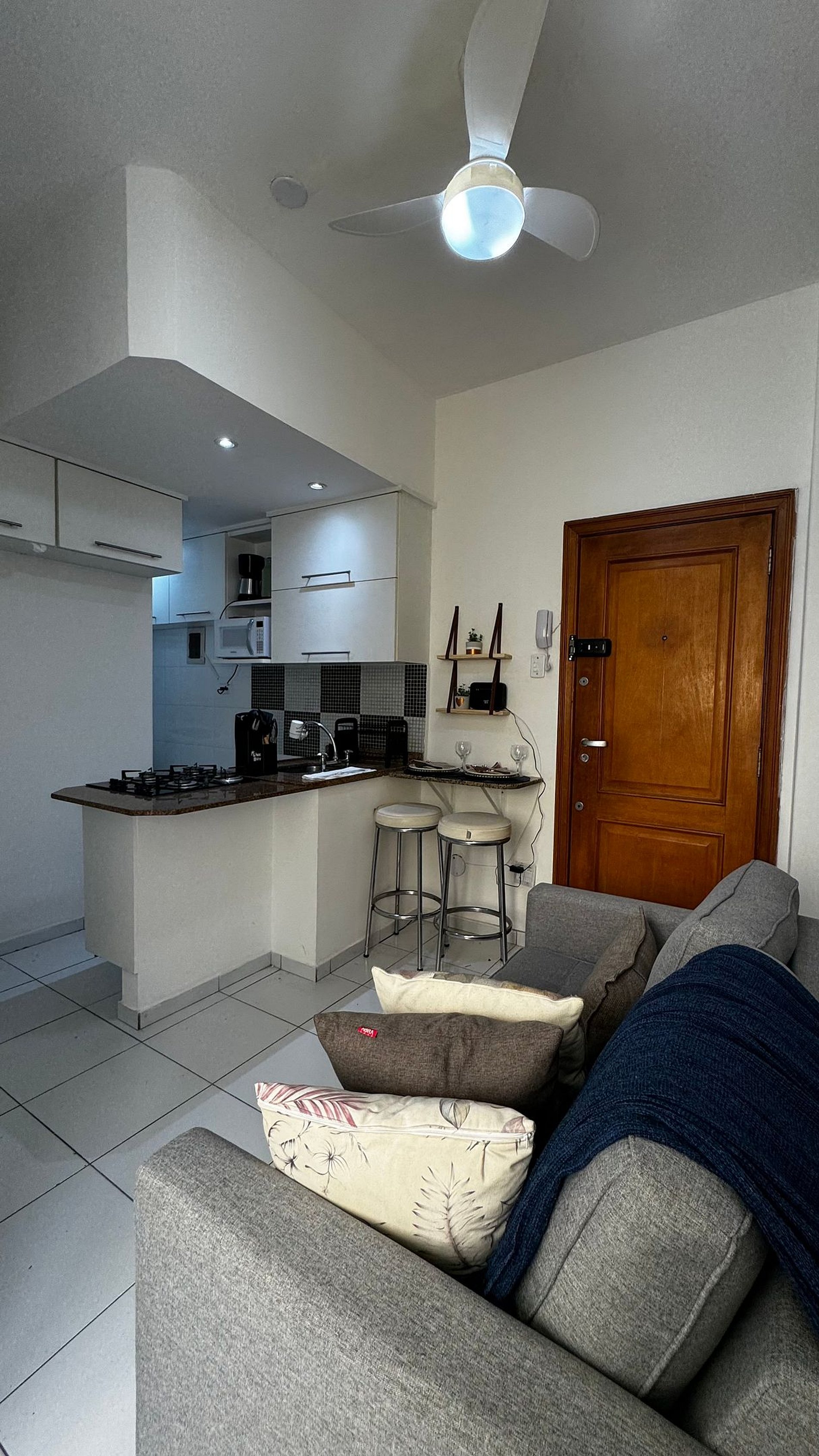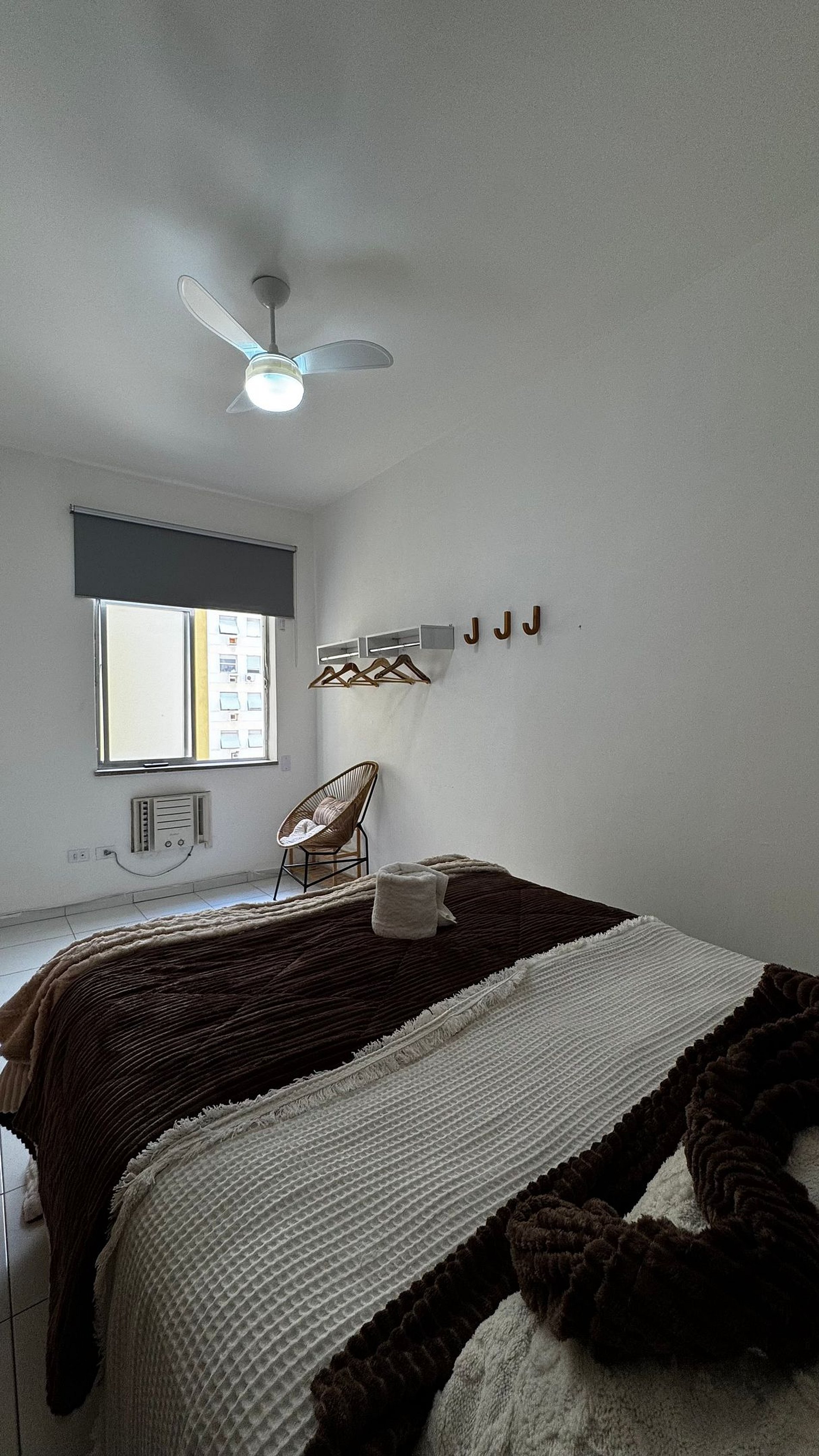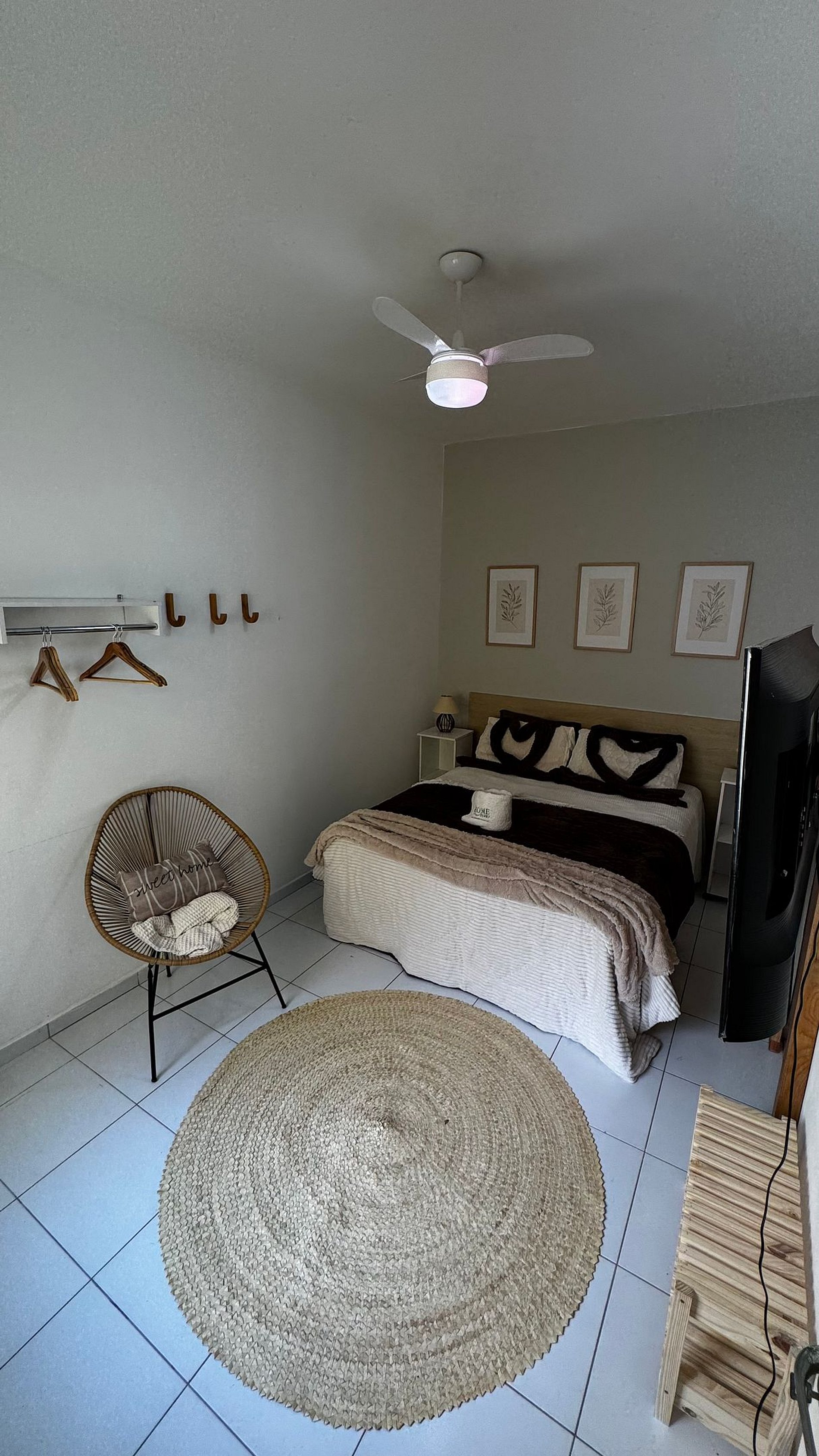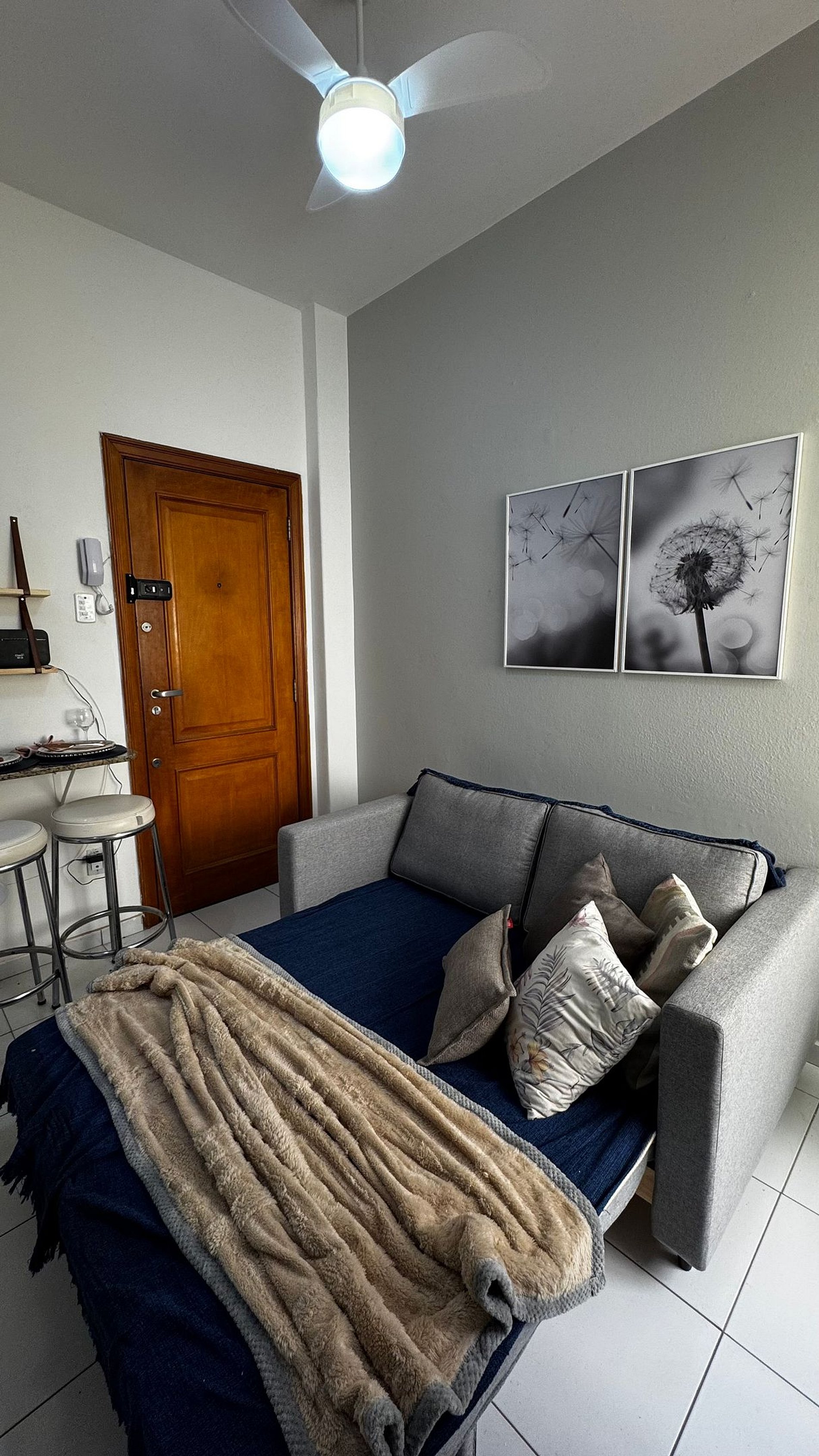 Na sala, você encontra um sofá-cama, ventilador de teto e ar-condicionado, garantindo conforto em qualquer época do ano. O apartamento também dispõe de área de lavanderia, com máquina de lavar roupas e varal.