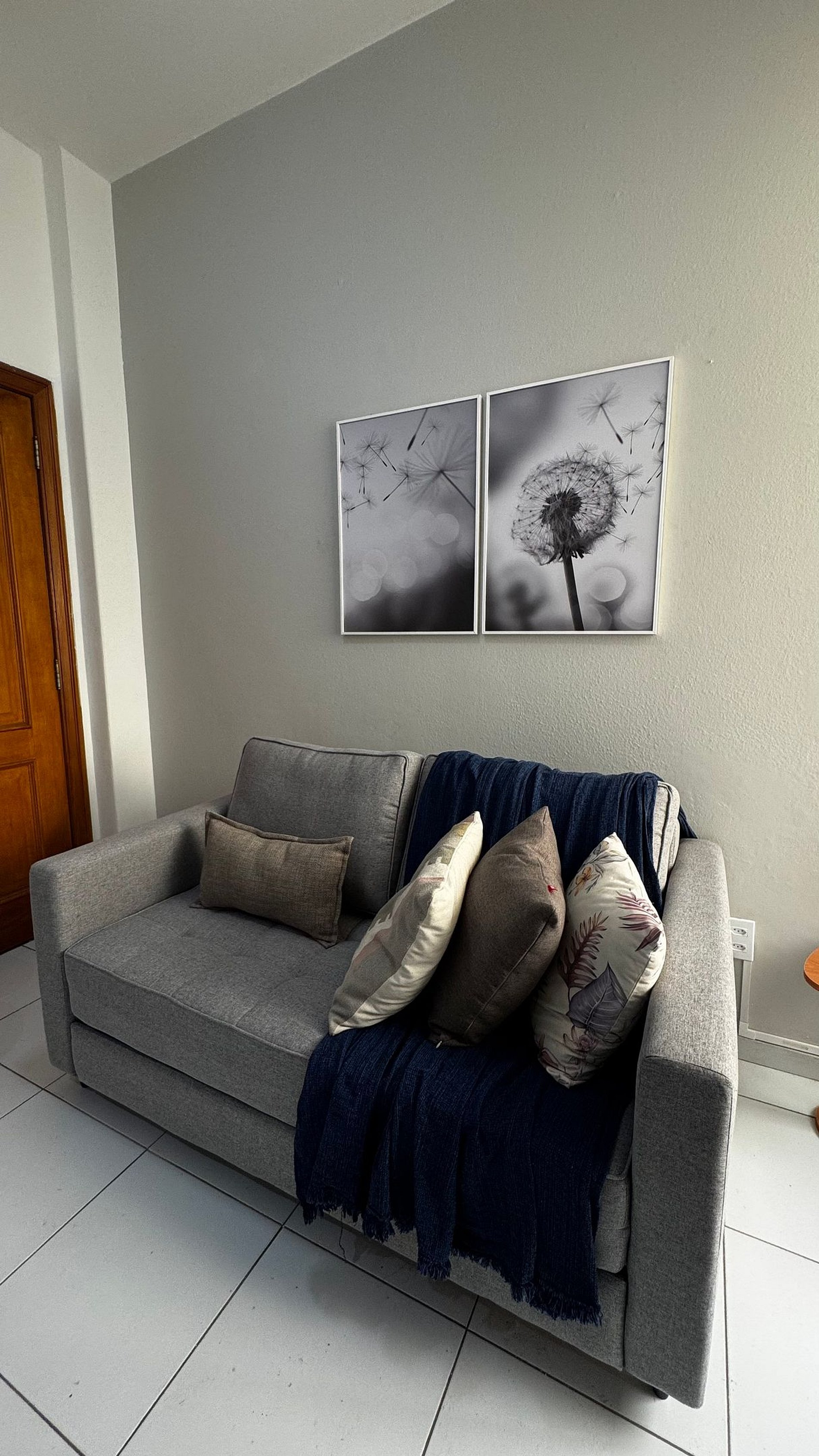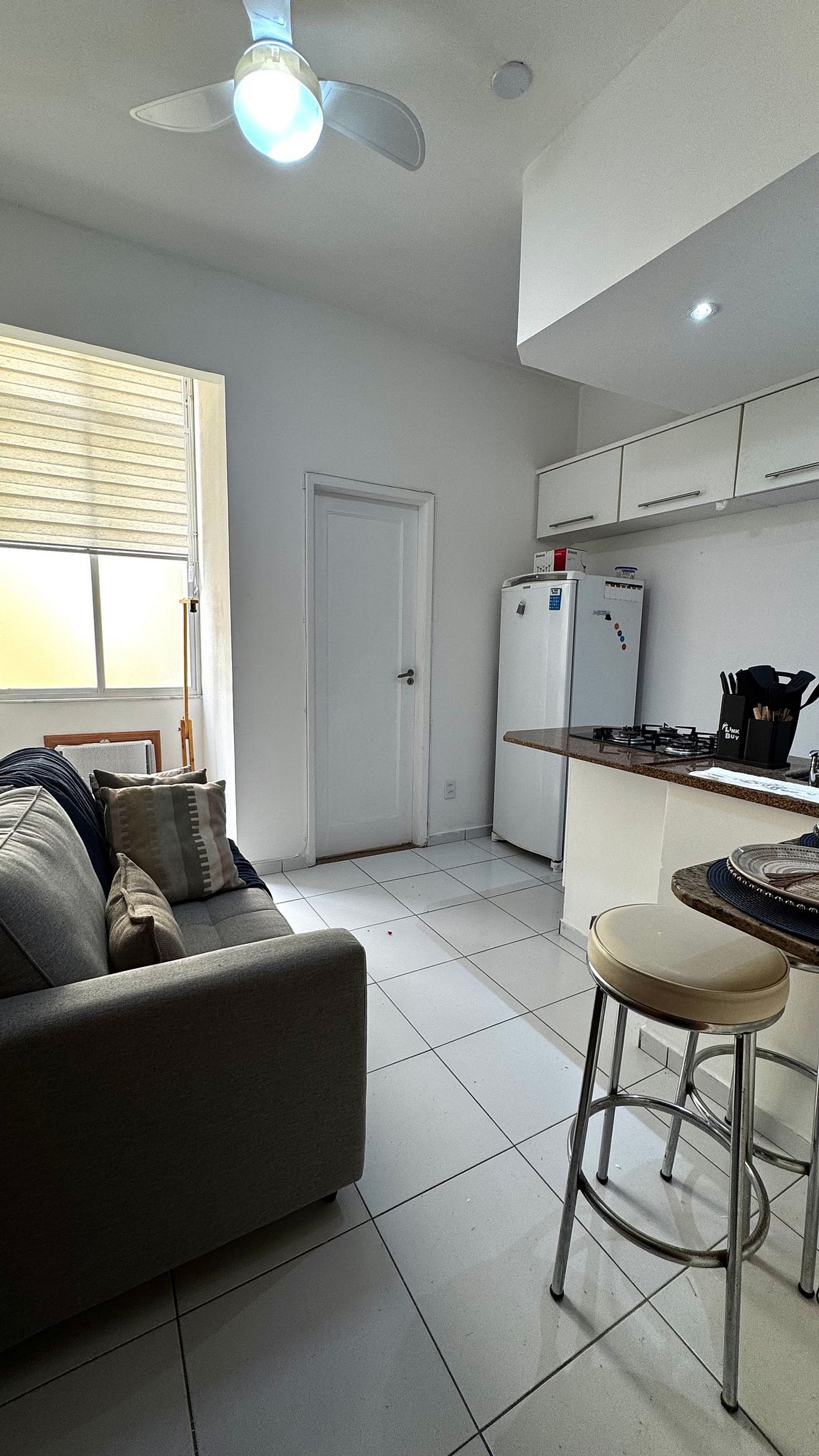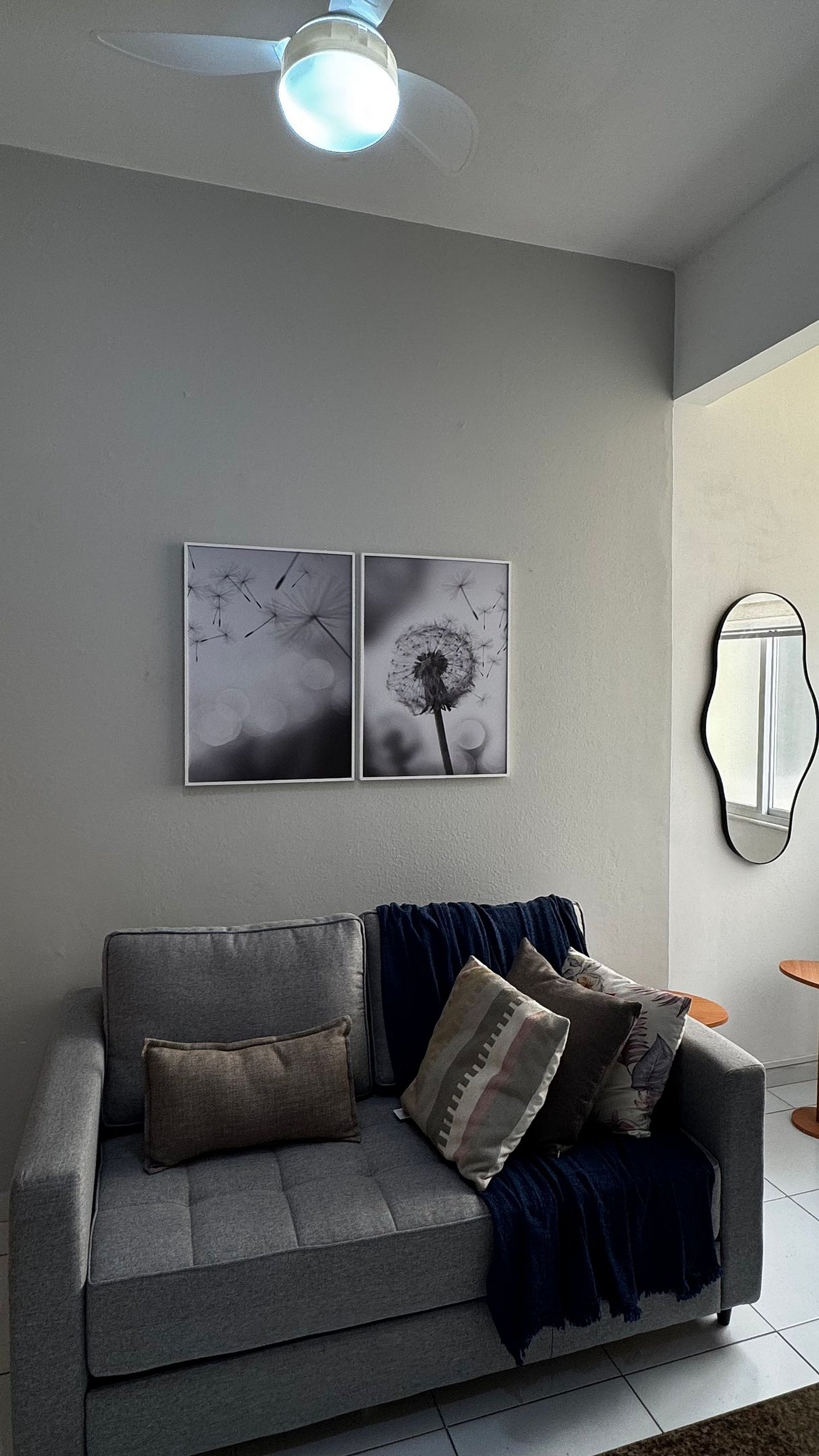 Na sala, você encontra um sofá-cama, ventilador de teto e ar-condicionado, garantindo conforto em qualquer época do ano. O apartamento também dispõe de área de lavanderia, com máquina de lavar roupas e varal.