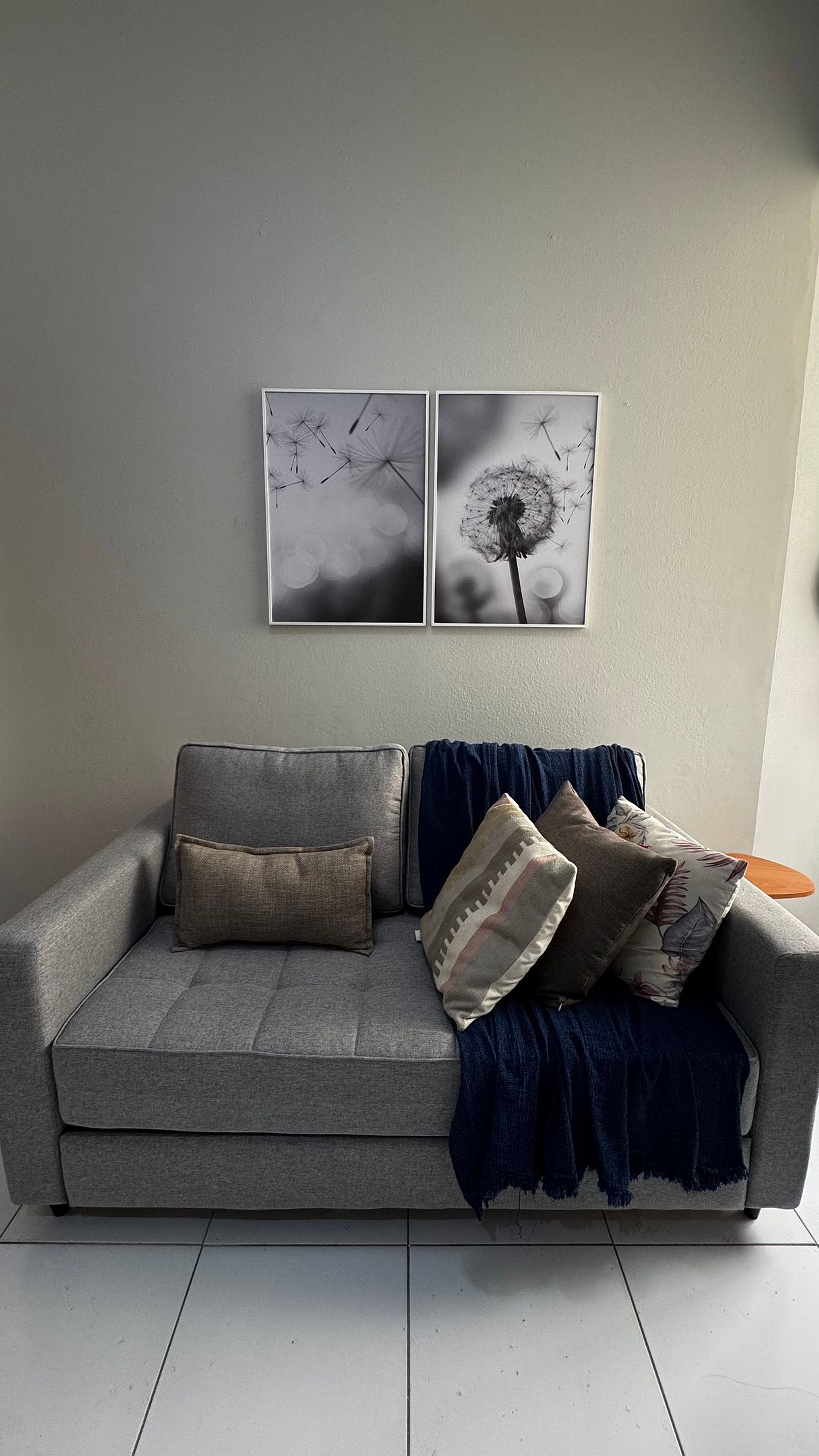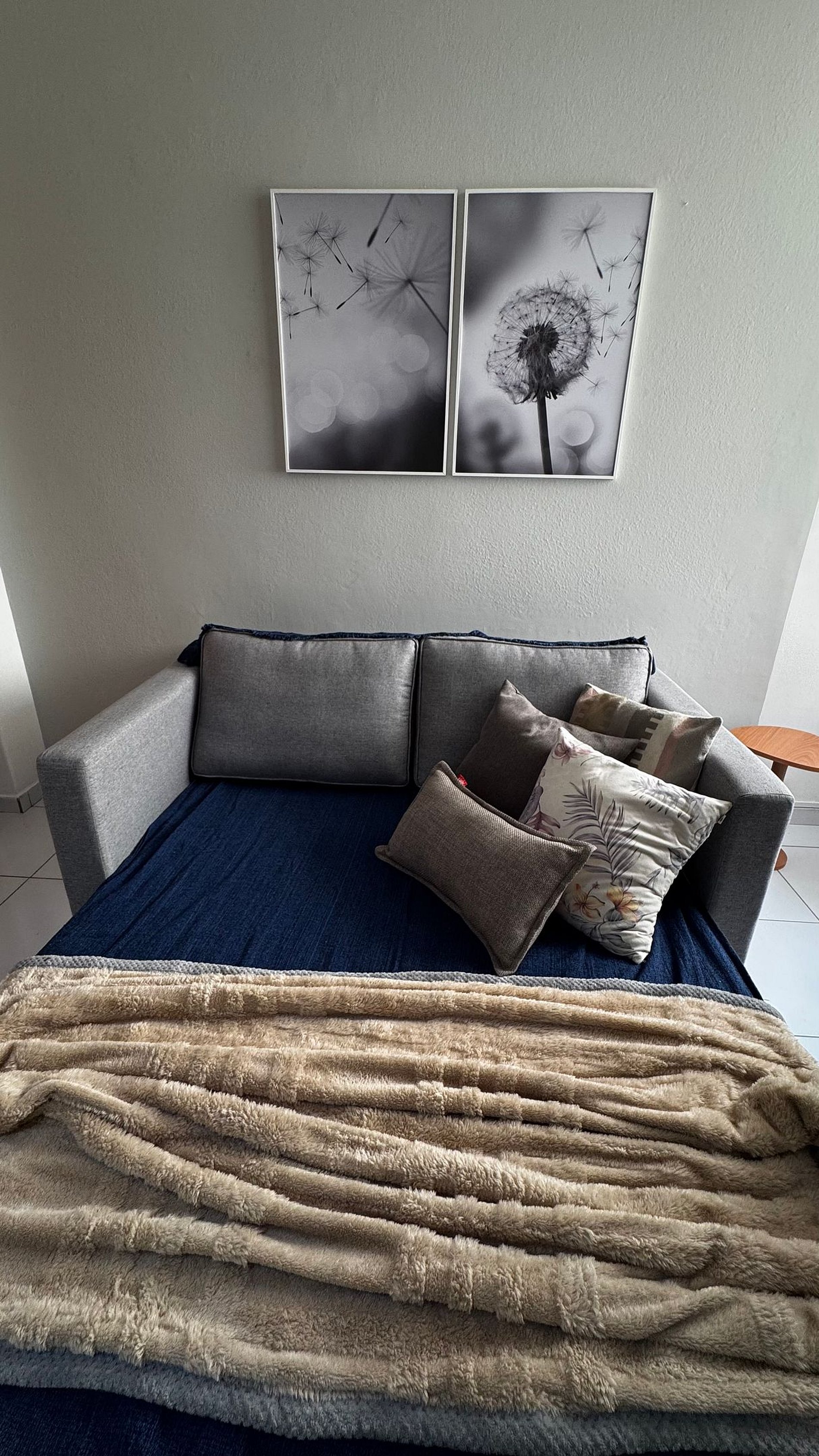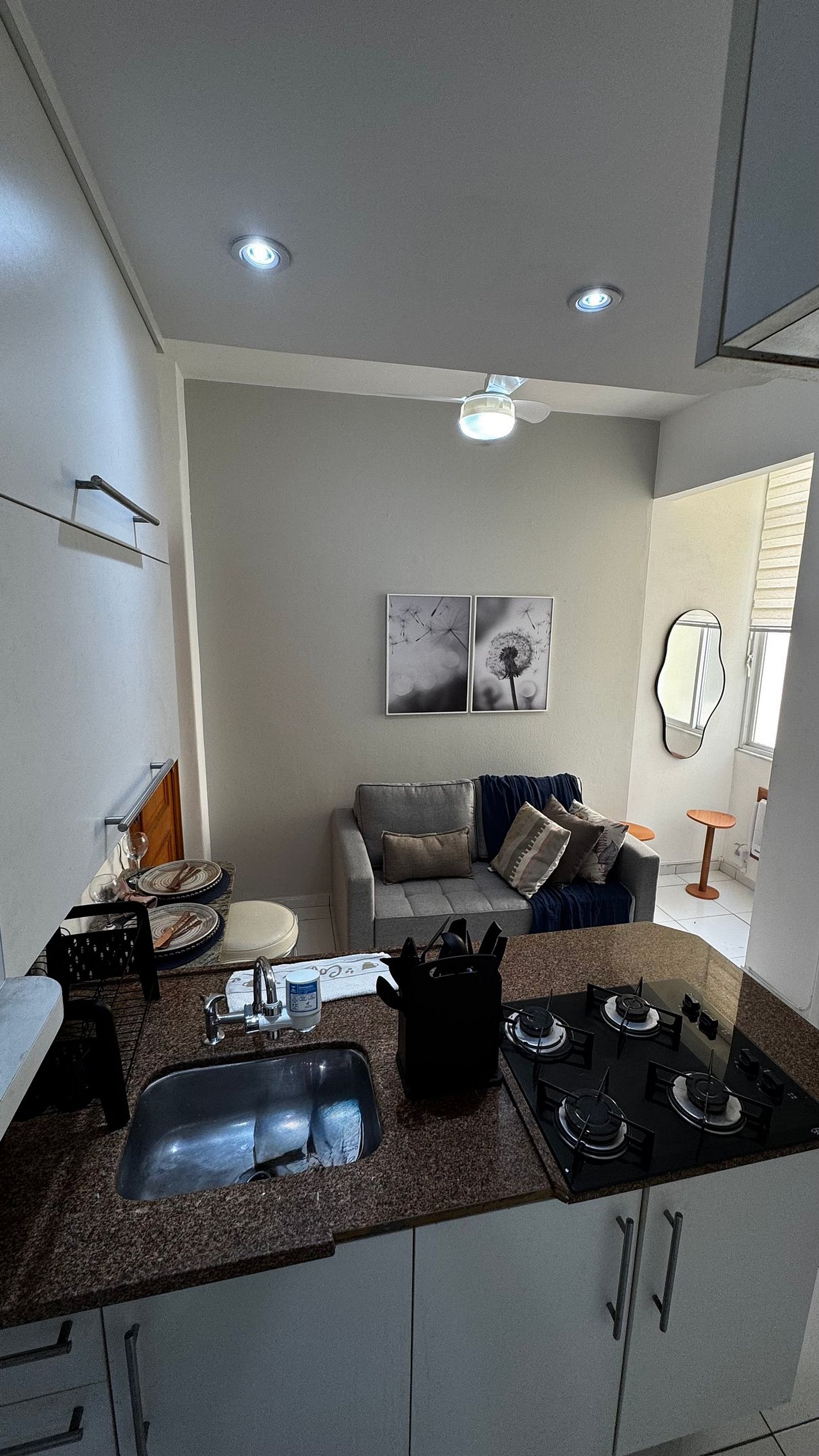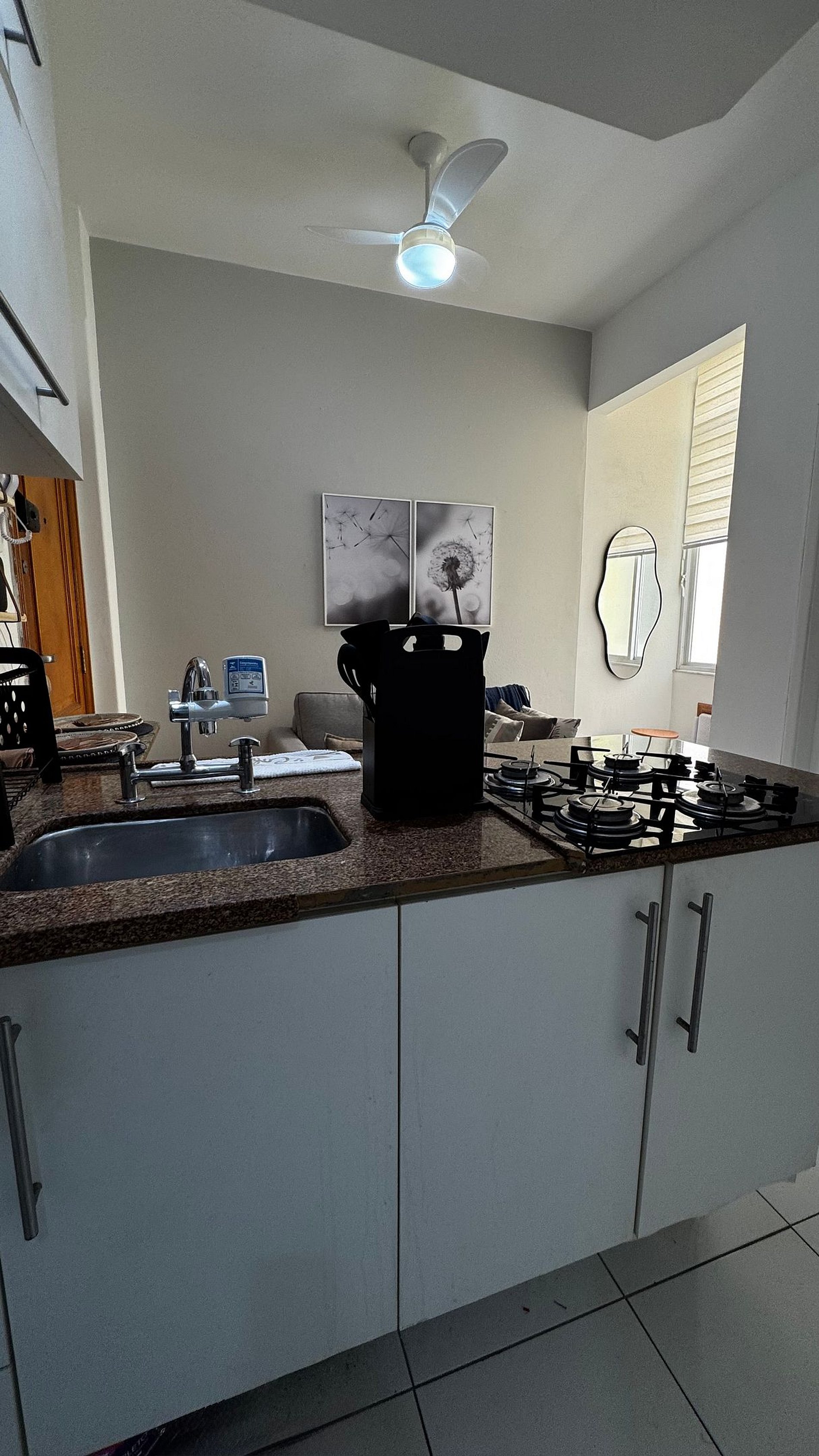 Na sala, você encontra um sofá-cama, ventilador de teto e ar-condicionado, garantindo conforto em qualquer época do ano. O apartamento também dispõe de área de lavanderia, com máquina de lavar roupas e varal.