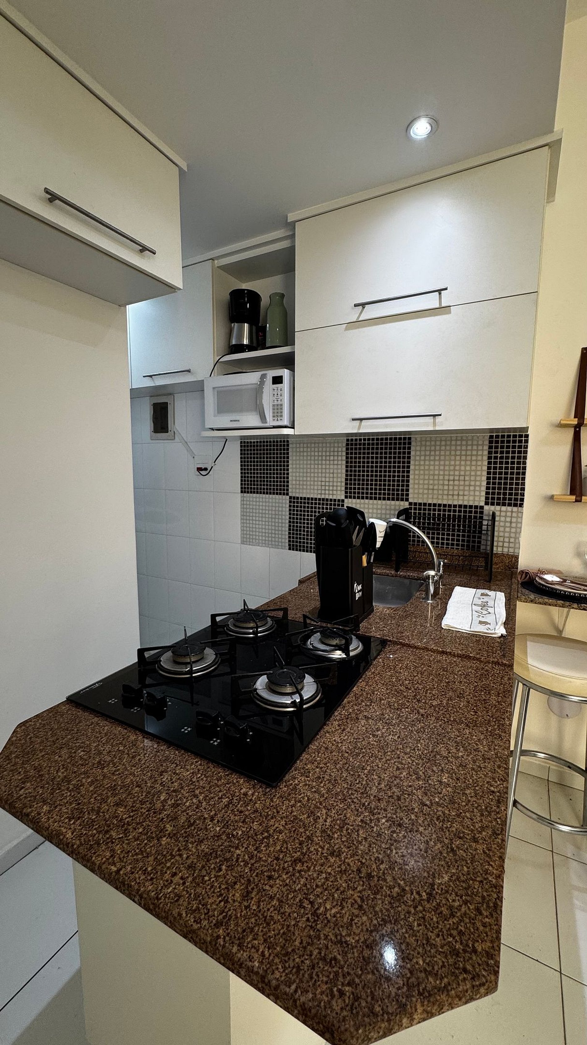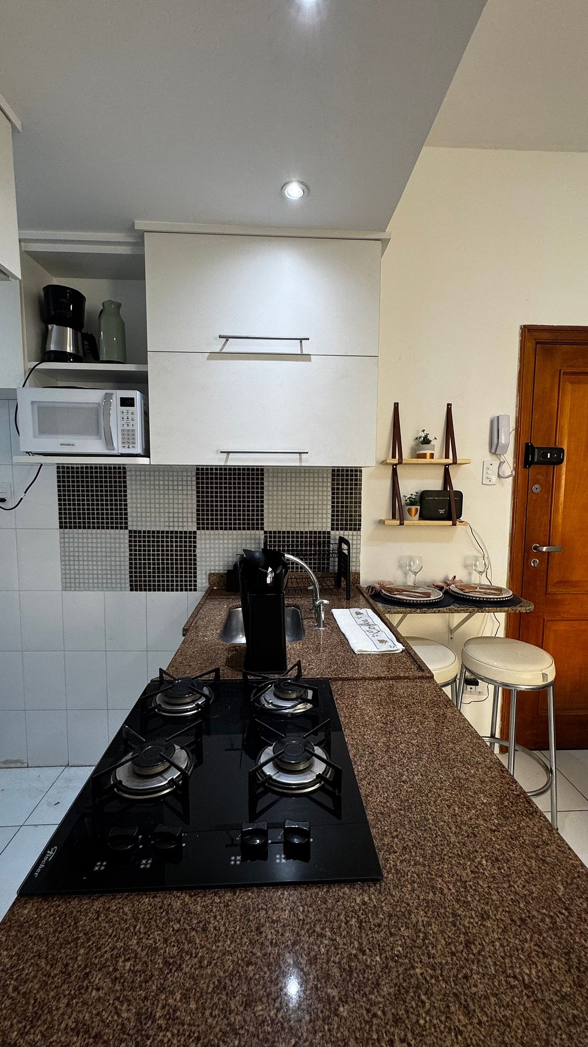A cozinha americana é funcional e bem equipada, com fogão, micro-ondas, cafeteira e utensílios completos para cozinhar, perfeita para preparar suas refeições.