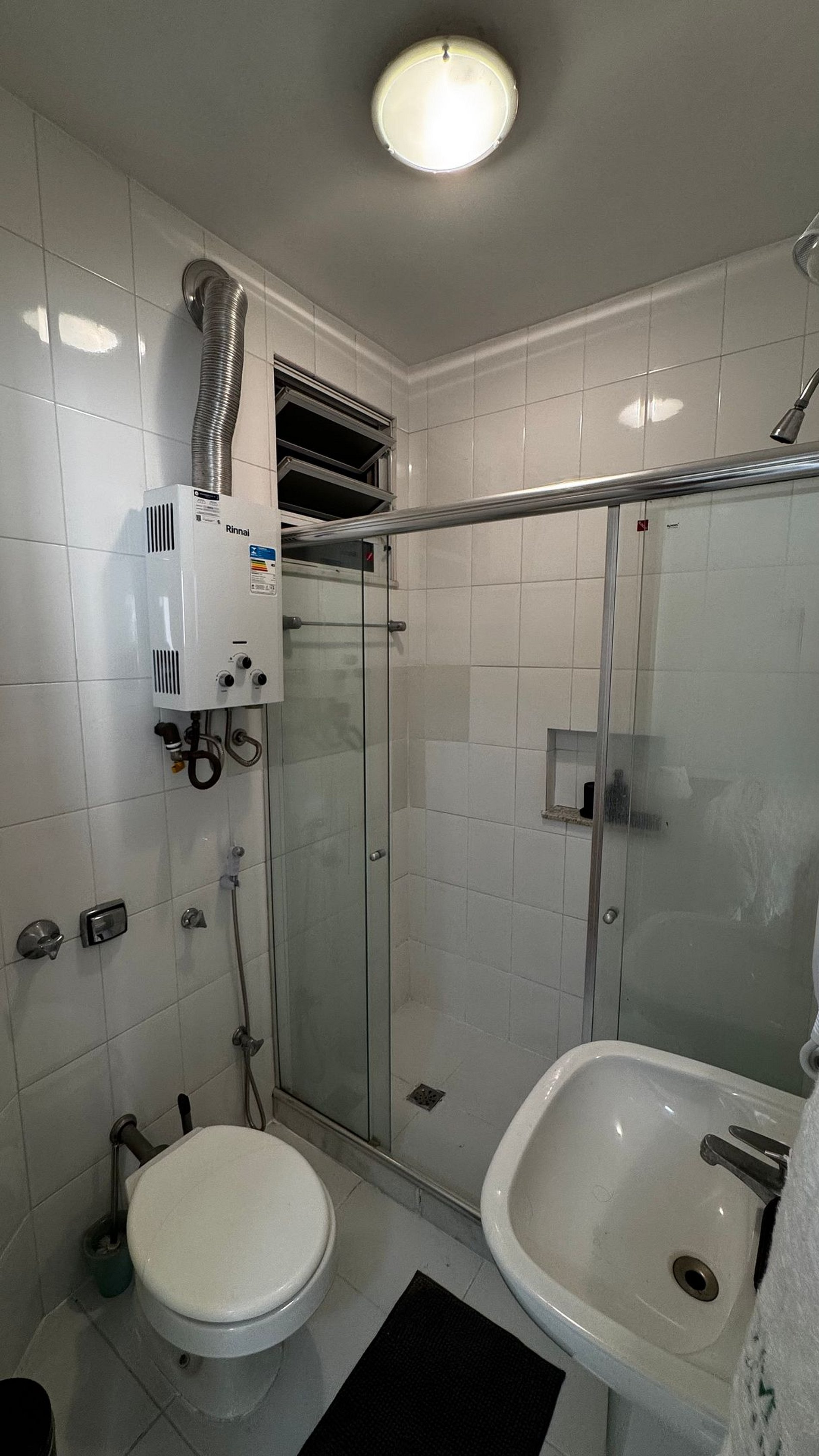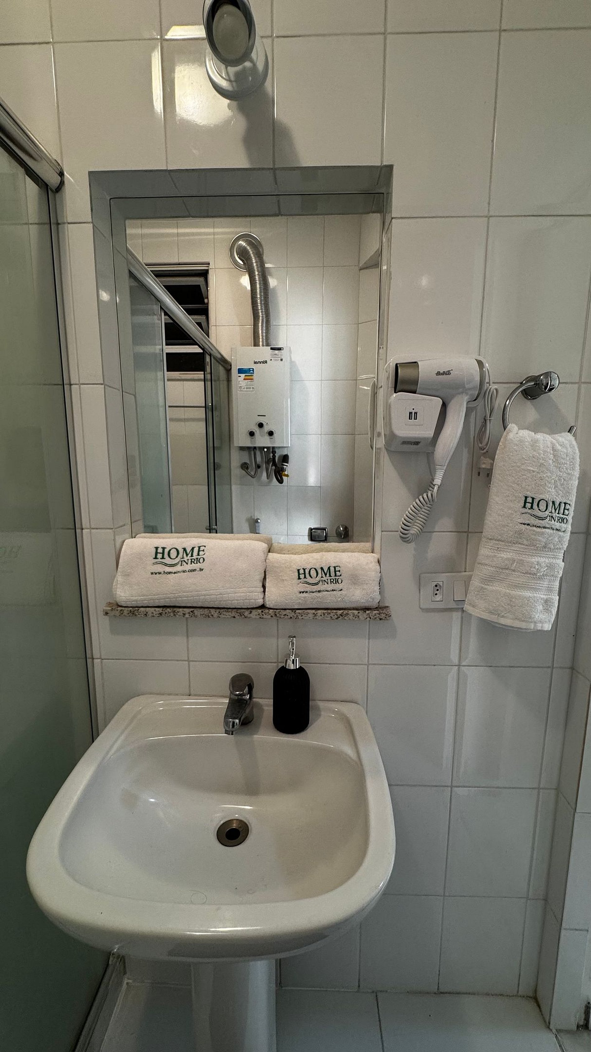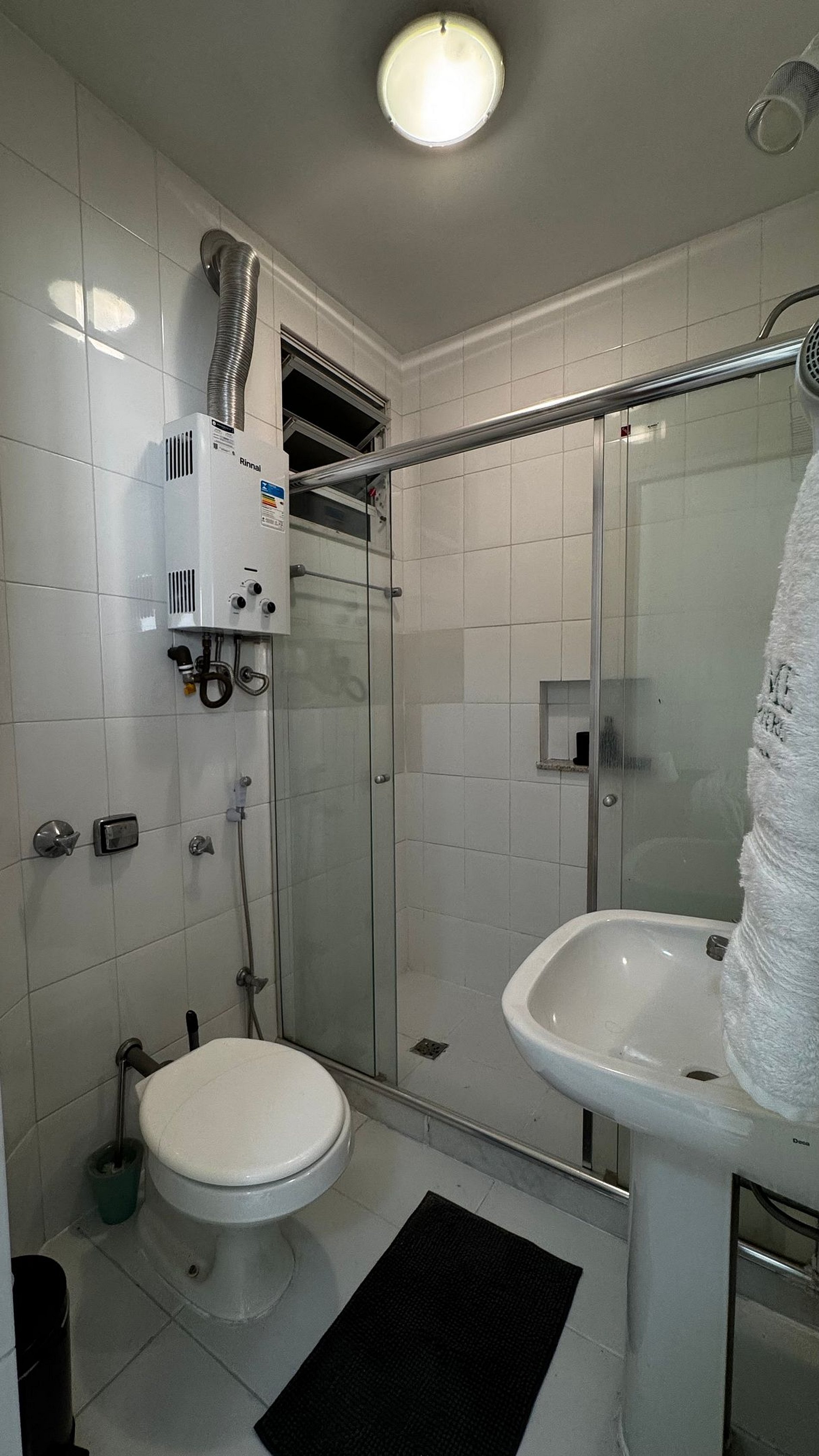 O banheiro da suíte possui água quente com aquecedor a gás, além de secador de cabelo e toalhas para sua comodidade.