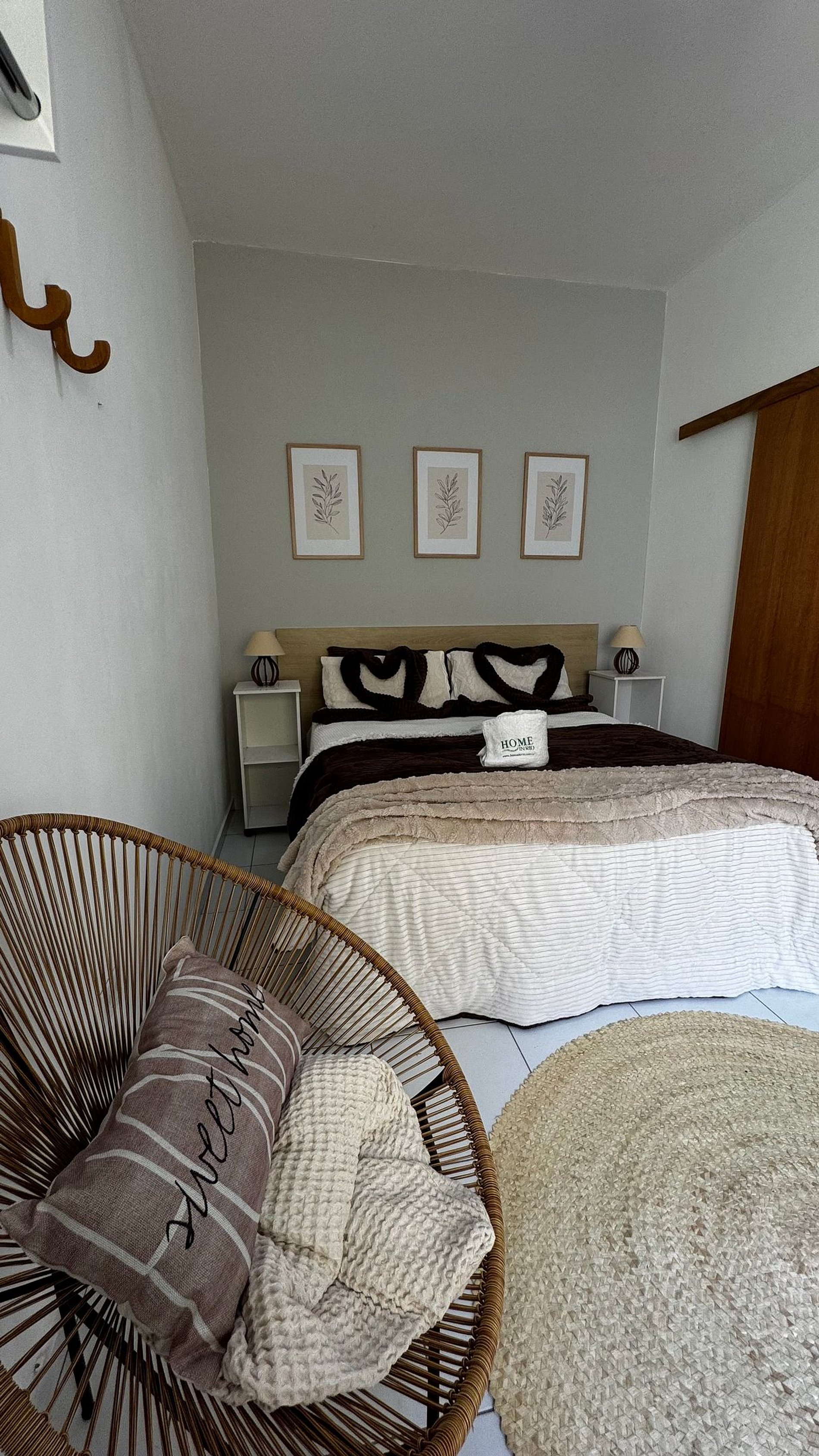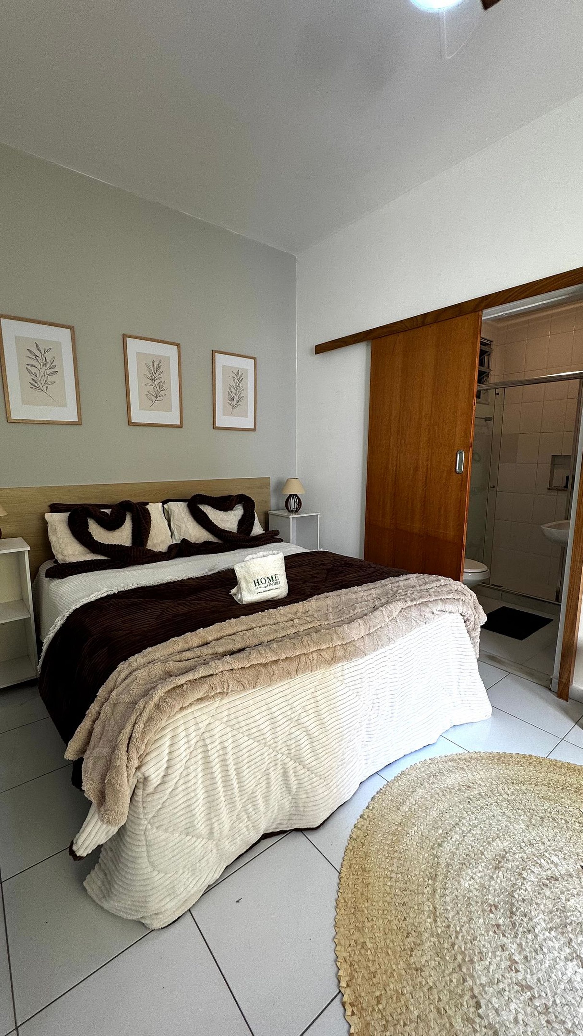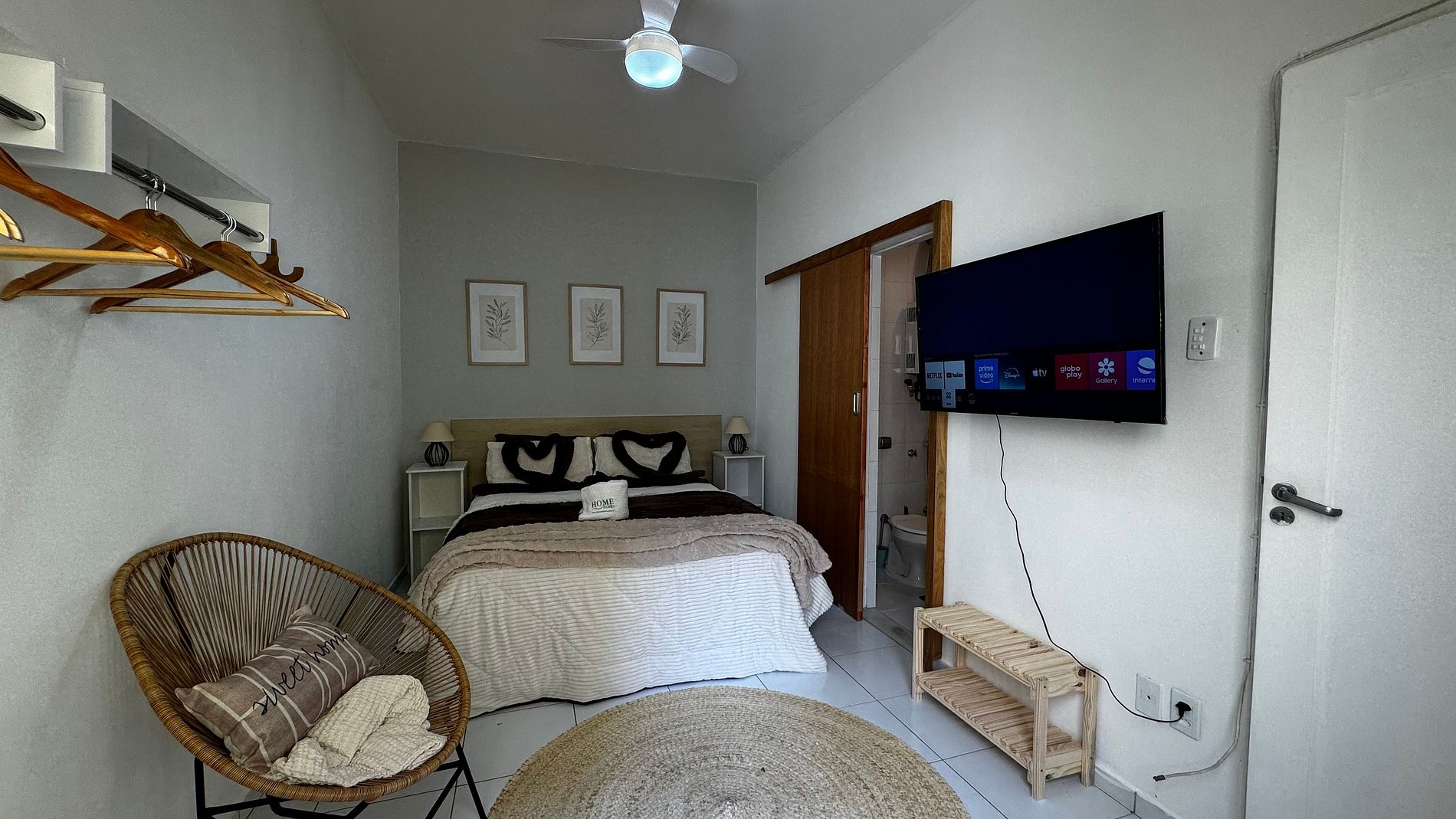 O espaço conta com 1 quarto suíte equipado com cama de Queen, ar-condicionado, ventilador de teto, araras para roupas, Smart TV, ferro de passar e roupas de cama de qualidade.