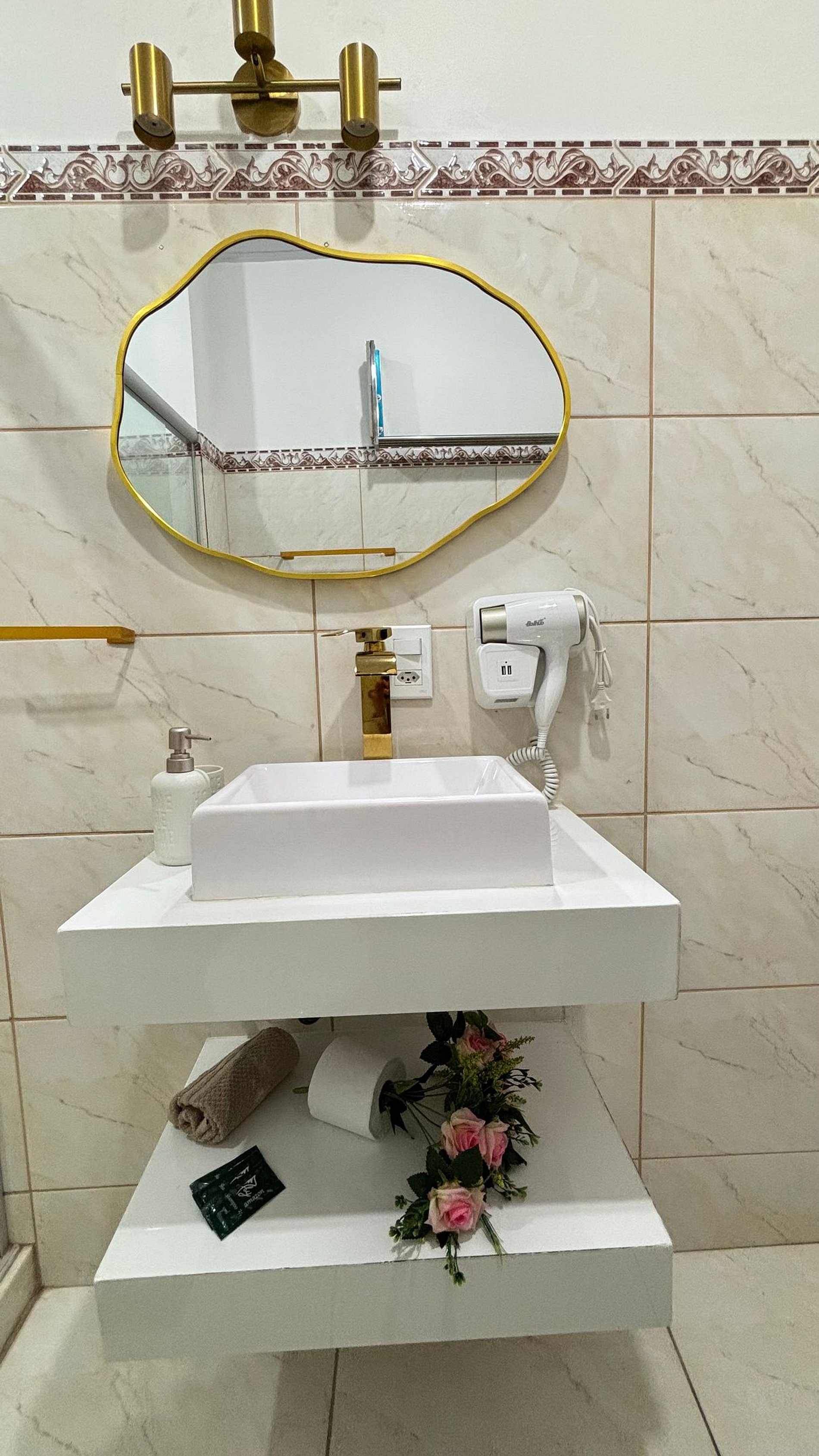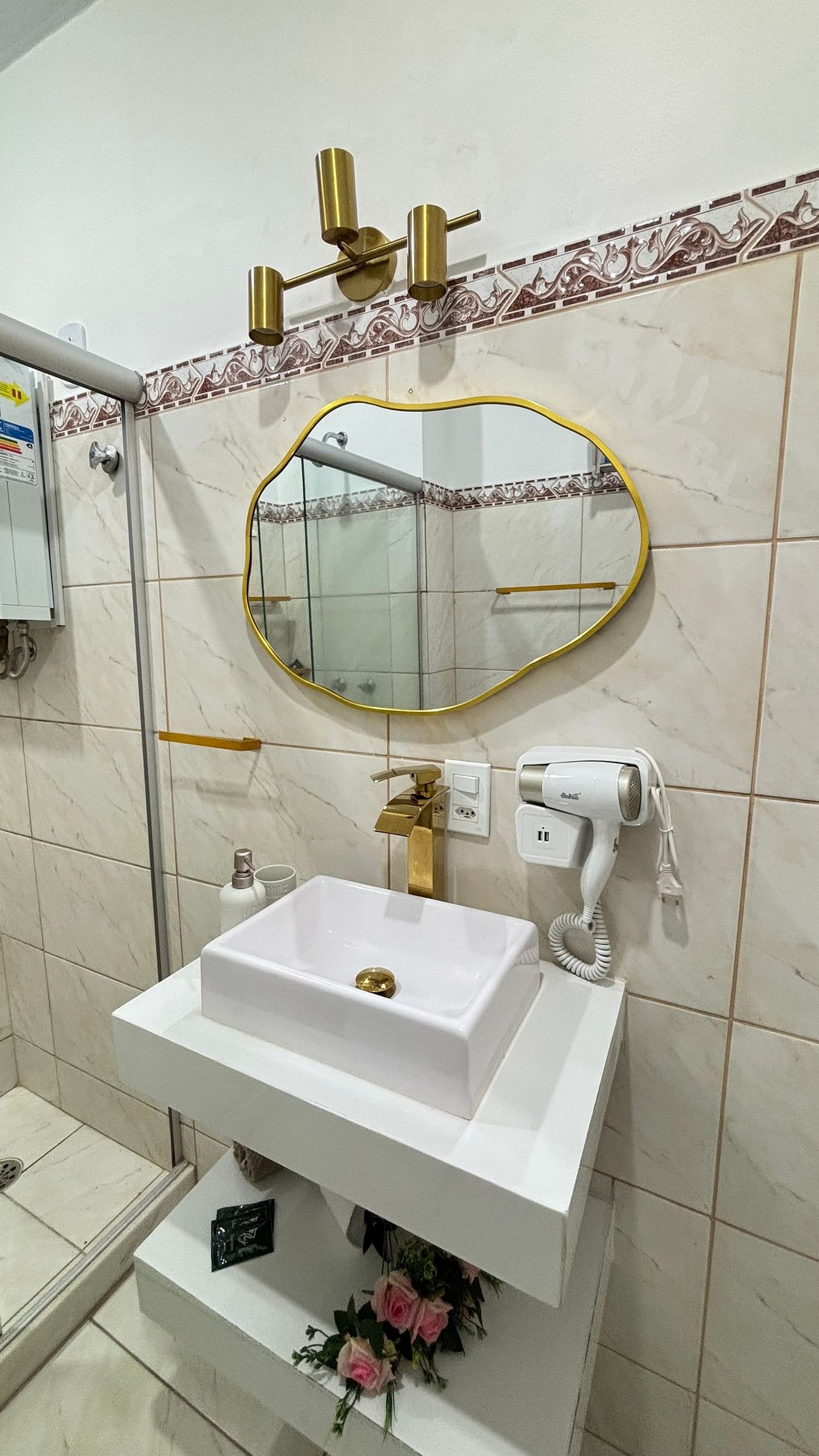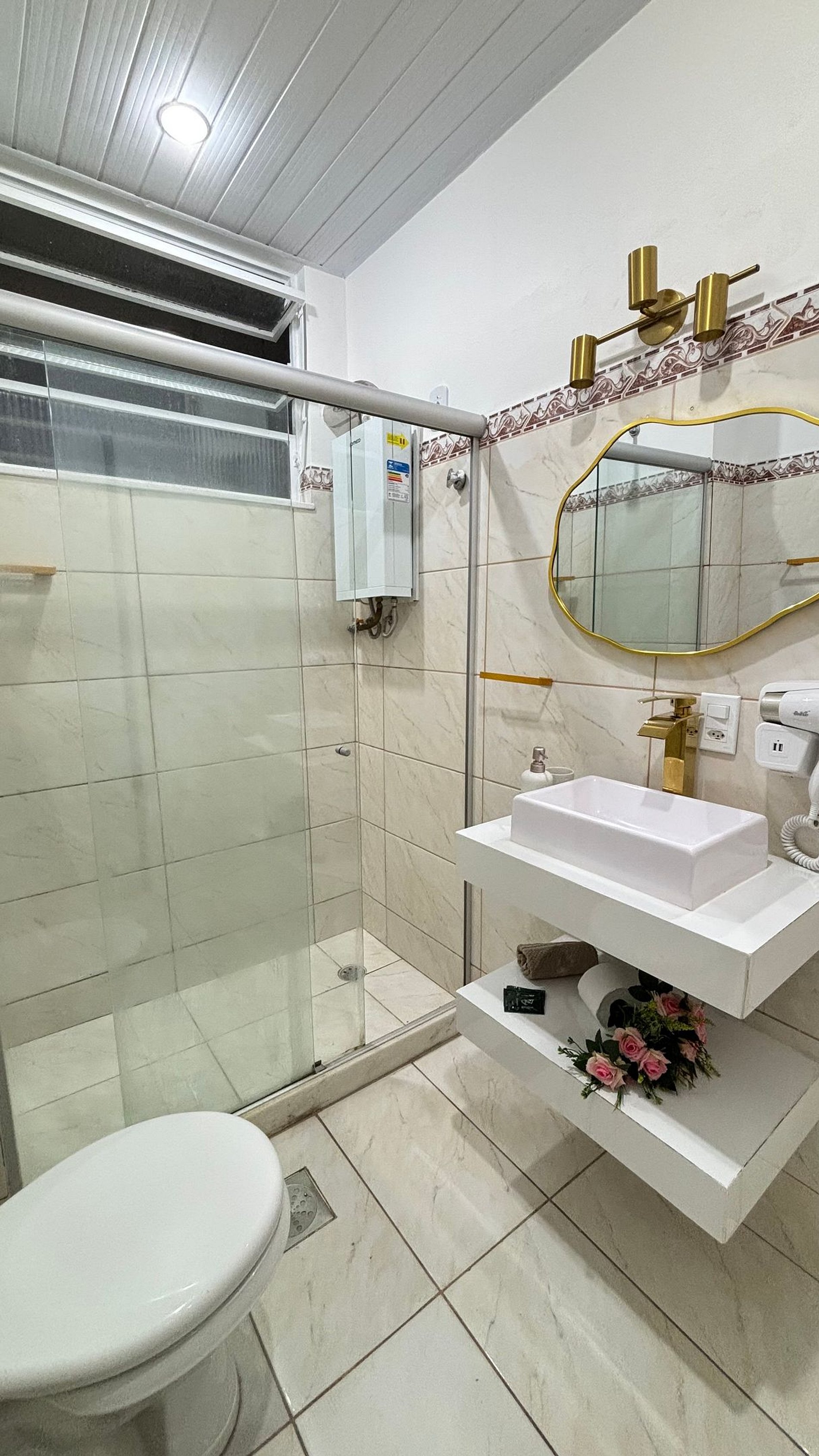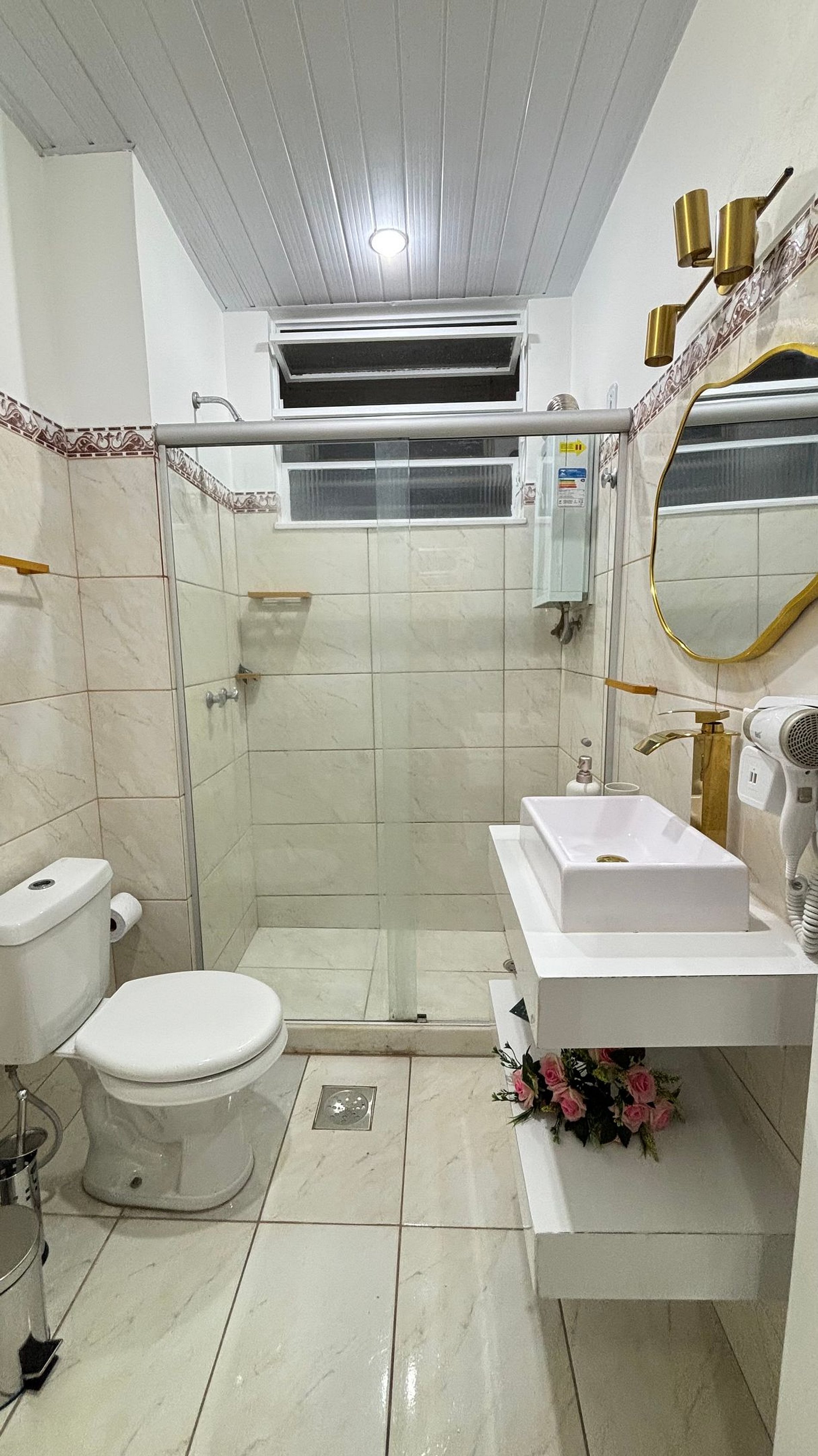 O banheiro conta com água quente, toalhas macias, secador de cabelo e itens de banho, proporcionando praticidade e conforto durante toda a sua estadia.
