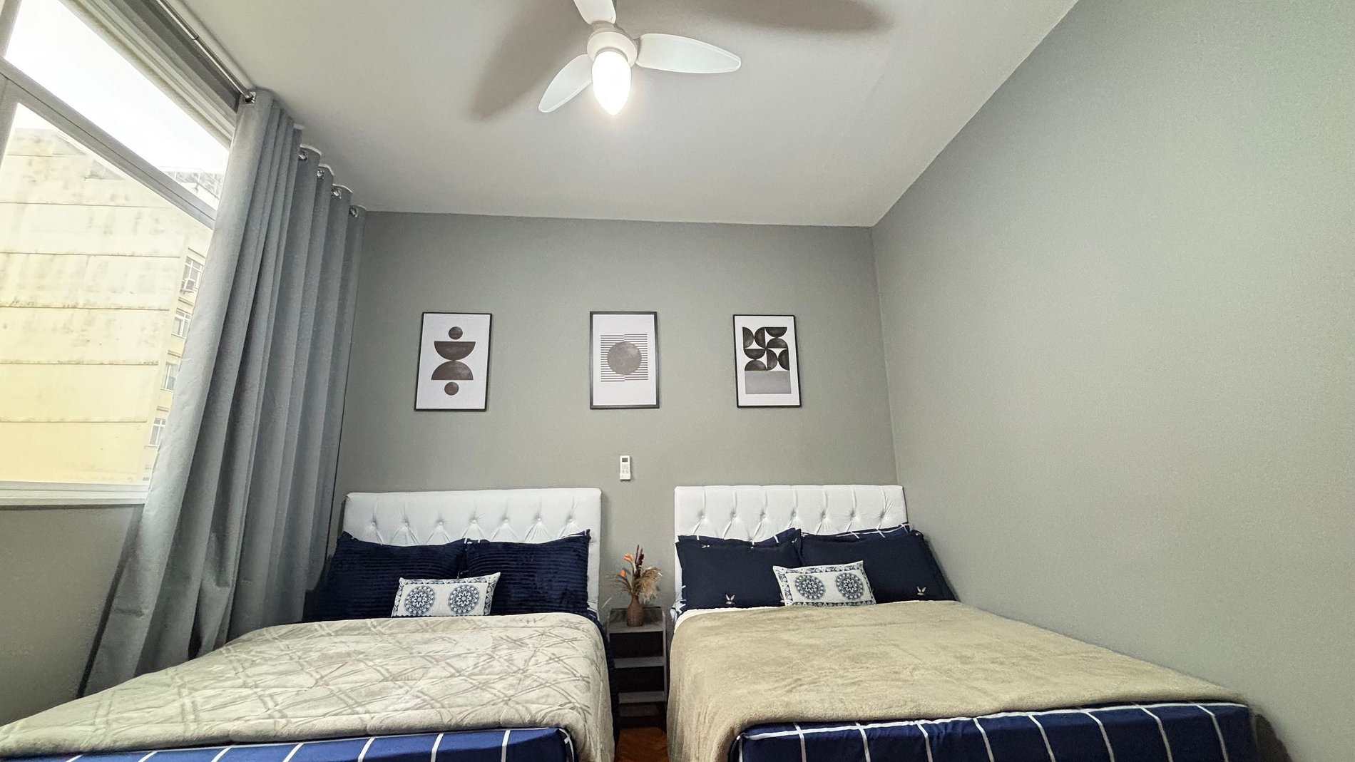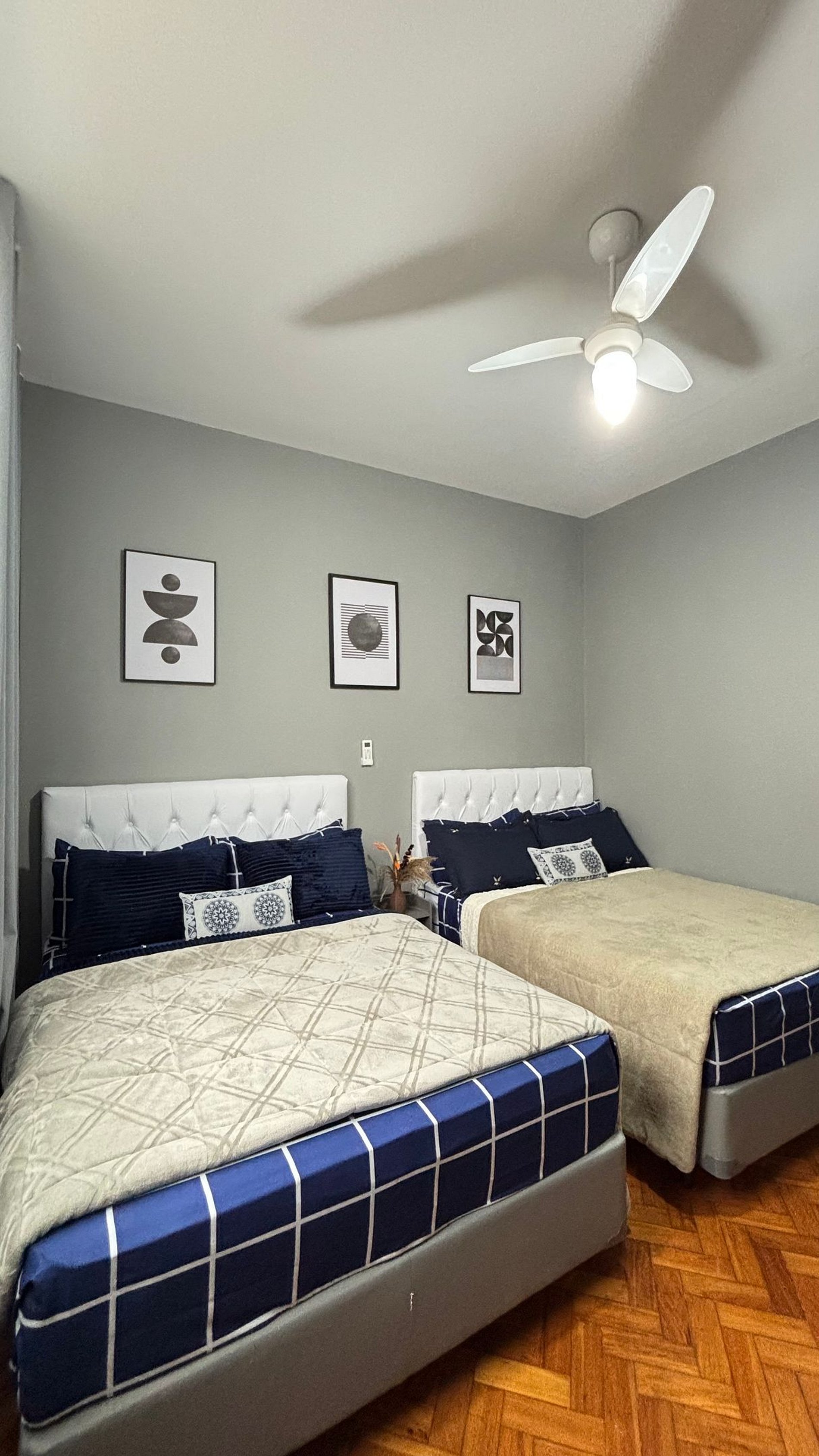 O quarto conta com duas camas de casal, perfeito para acomodar famílias ou grupos com conforto. O ambiente é climatizado com ar-condicionado e ventilador de teto, garantindo noites tranquilas em qualquer estação. Também oferecemos roupas de cama de qualidade, Smart TV para seus momentos de descanso e arara para roupas, facilitando a organização durante a estadia.