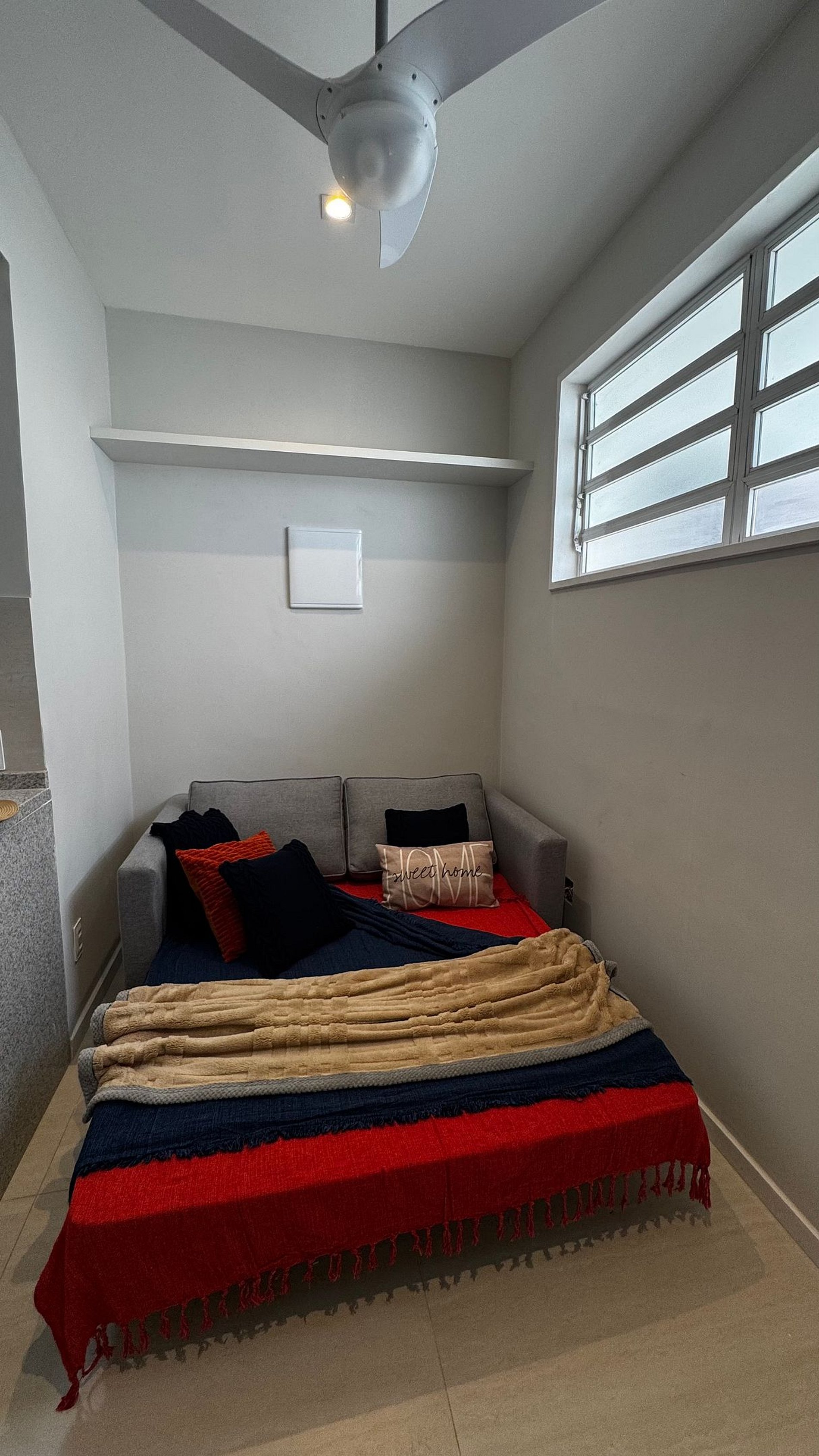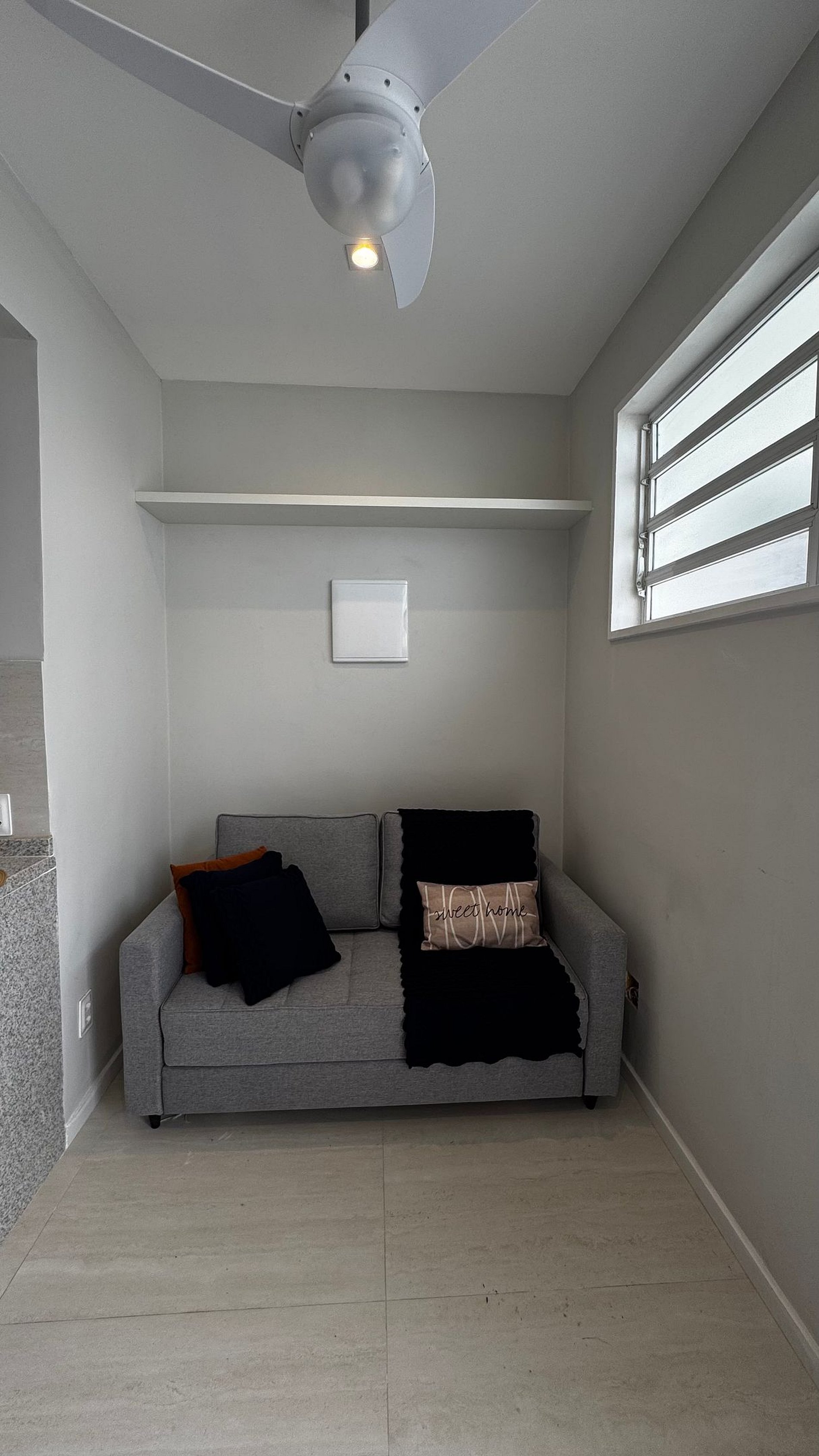 A sala conta com sofá-cama confortável, ventilador de teto e mesa para refeições perfeita para compartilhar momentos, descansar ou até acomodar hóspedes extras com comodidade.