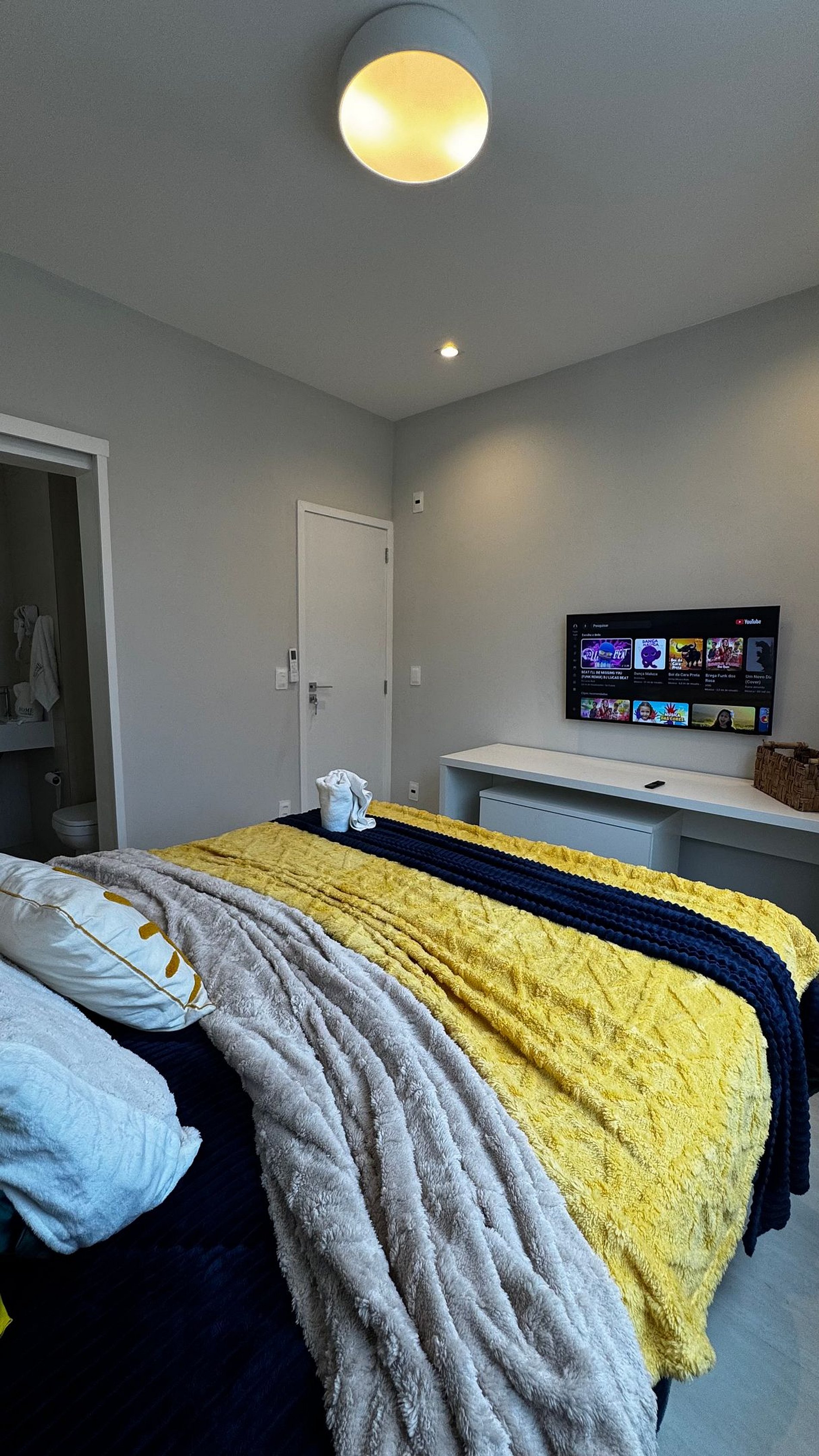 Relaxe em uma confortável cama de casal, em um ambiente climatizado com ar-condicionado, Smart TV para seus momentos de descanso e uma mesa de trabalho ideal para quem precisa manter a produtividade.