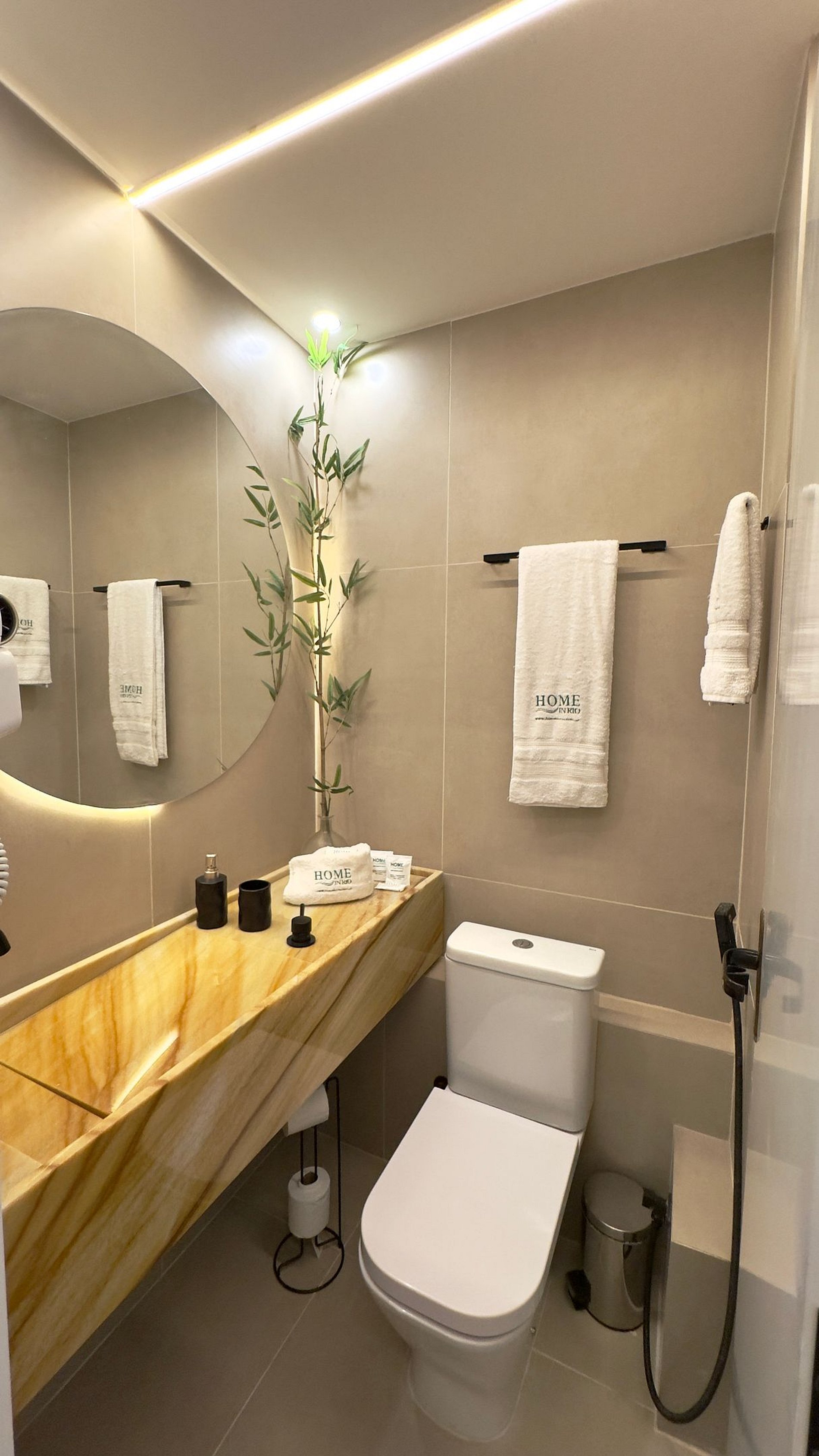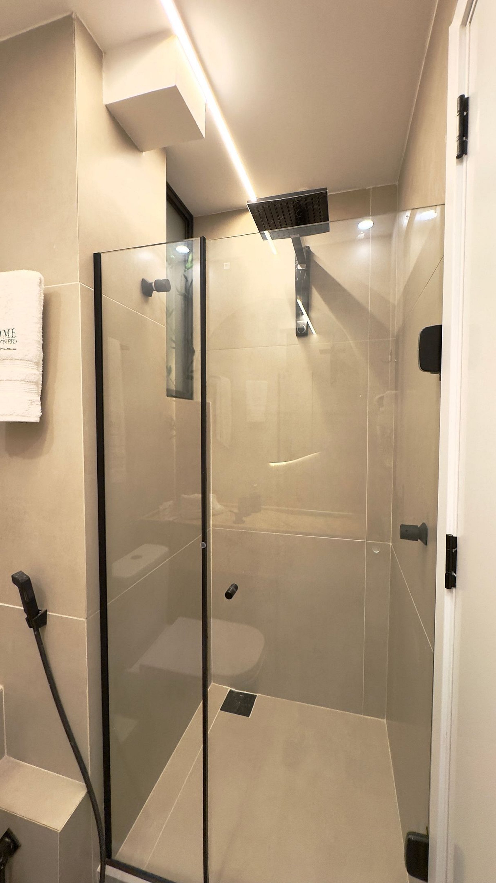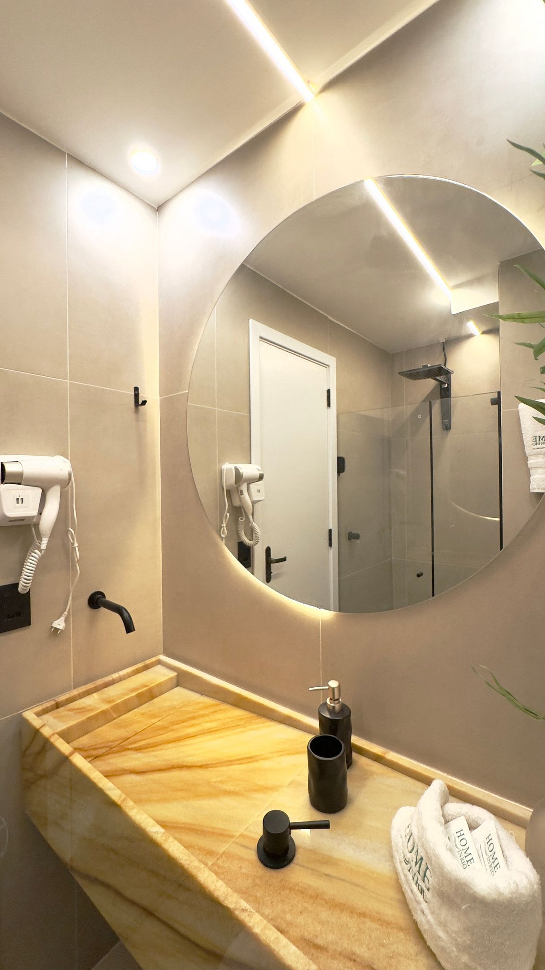 Banheiro moderno com água quente, toalhas macias e secador de cabelo à sua disposição.