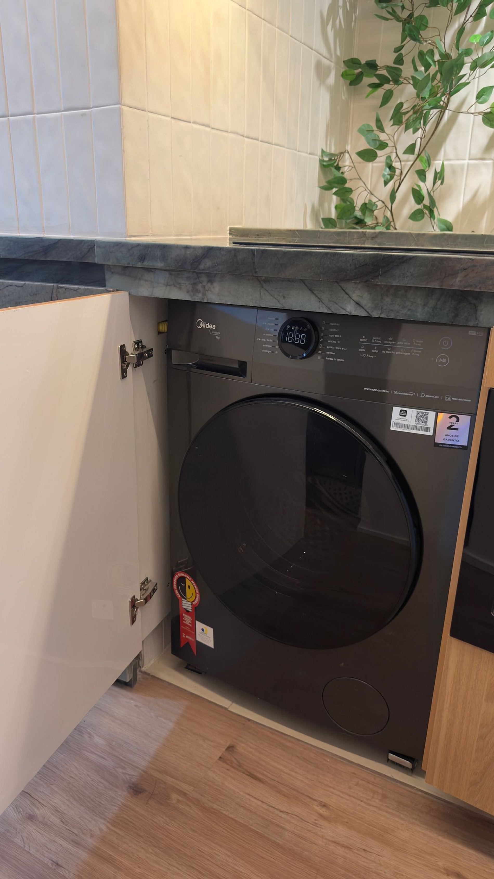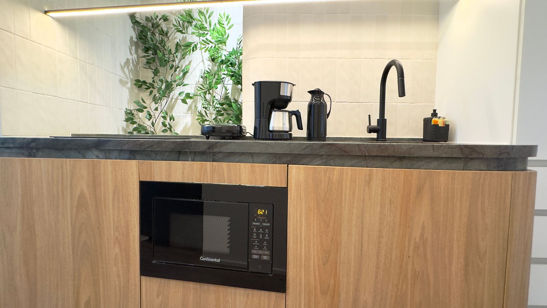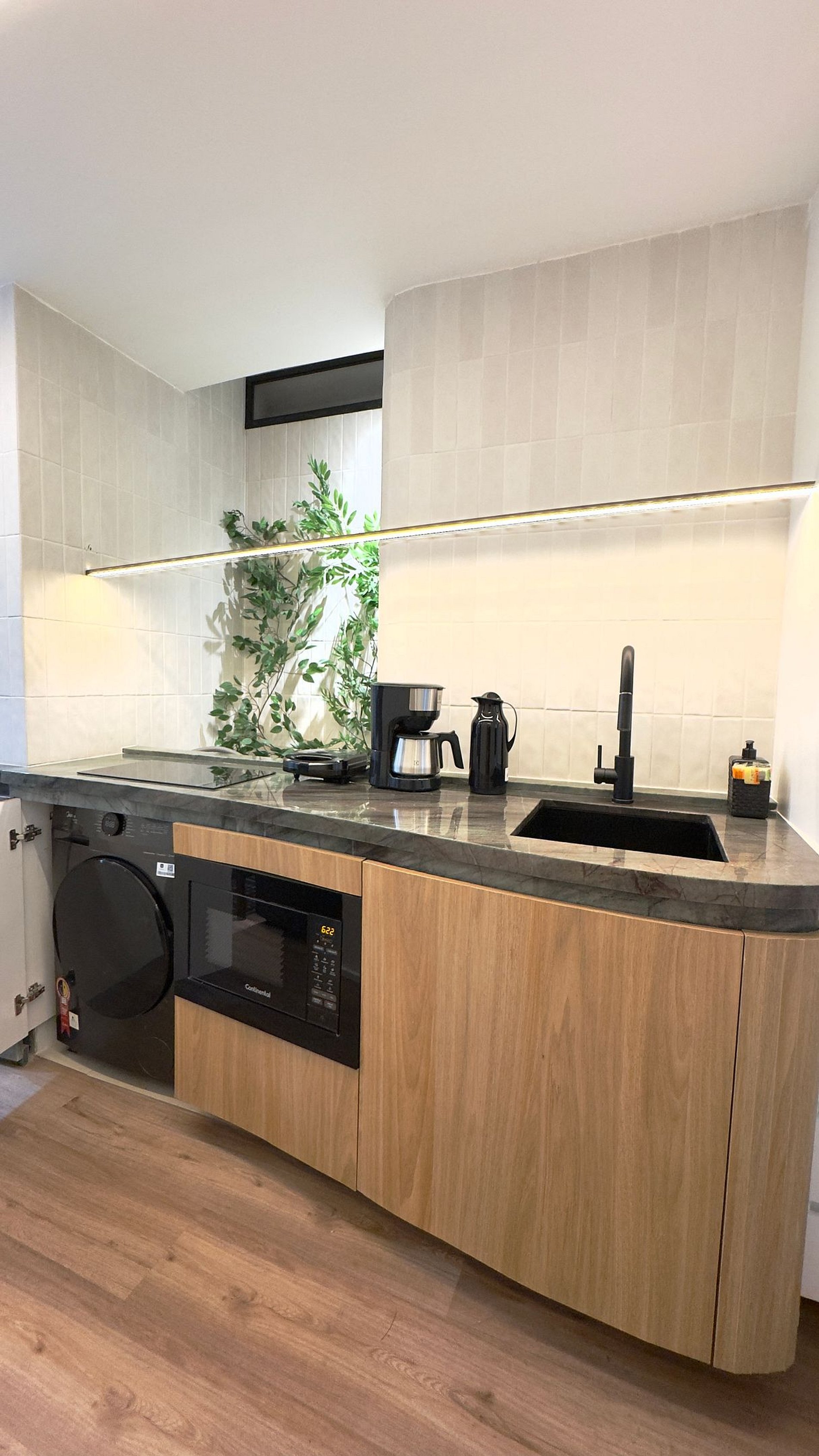 Cozinha com design moderno e funcional, equipada com forno micro-ondas, geladeira, máquina de lavar e secar roupas, além de utensílios completos para preparar suas refeições com conforto.