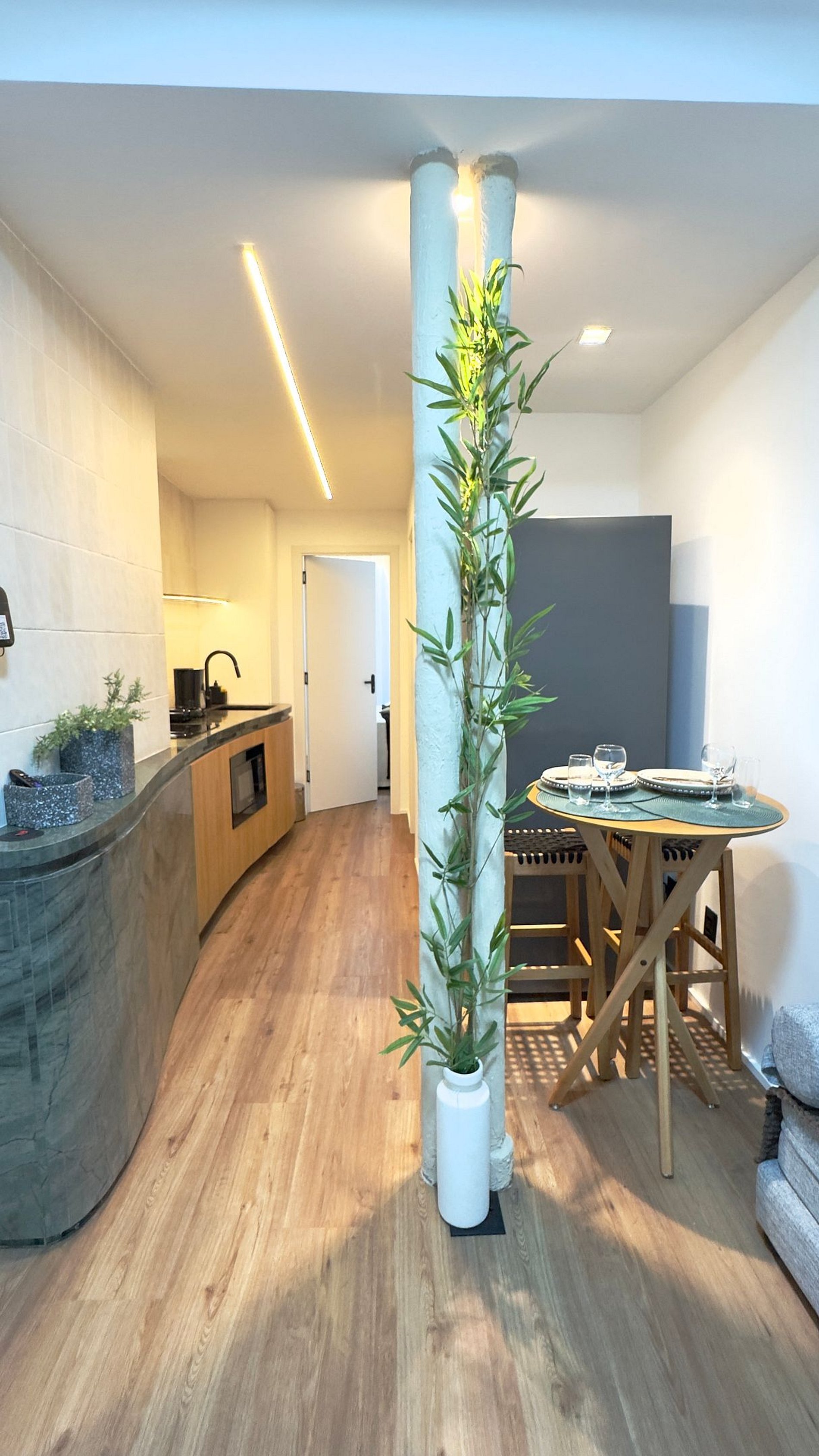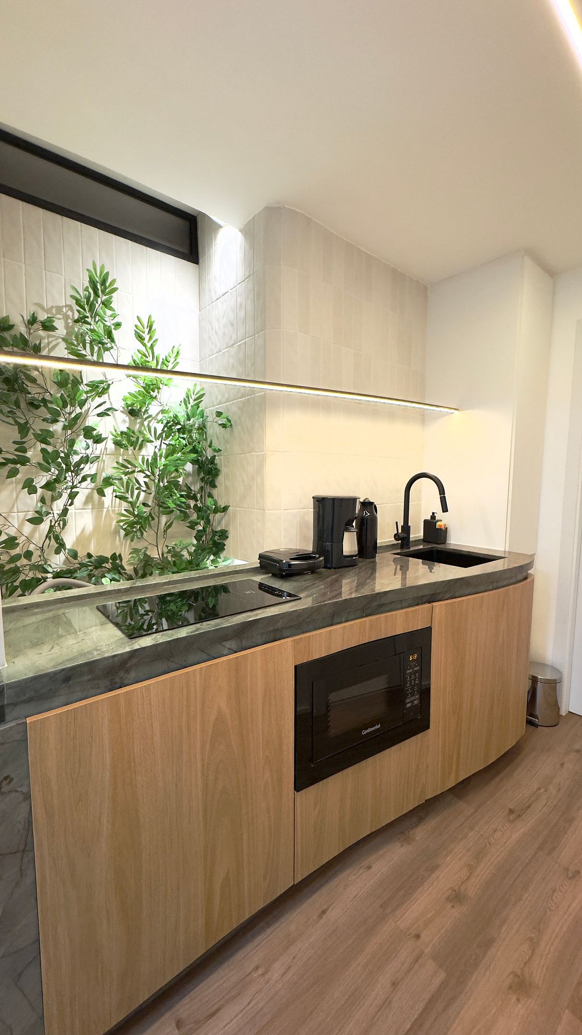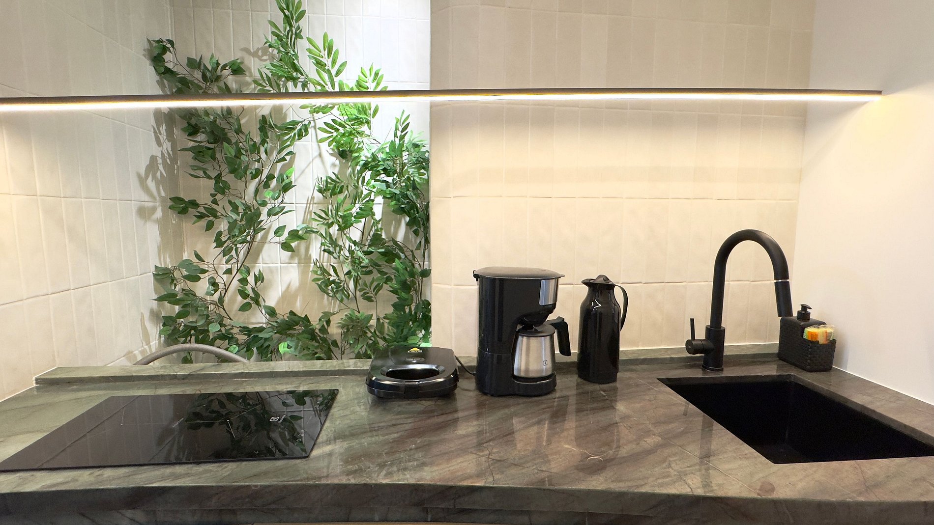 Cozinha com design moderno e funcional, equipada com forno micro-ondas, geladeira, máquina de lavar e secar roupas, além de utensílios completos para preparar suas refeições com conforto.