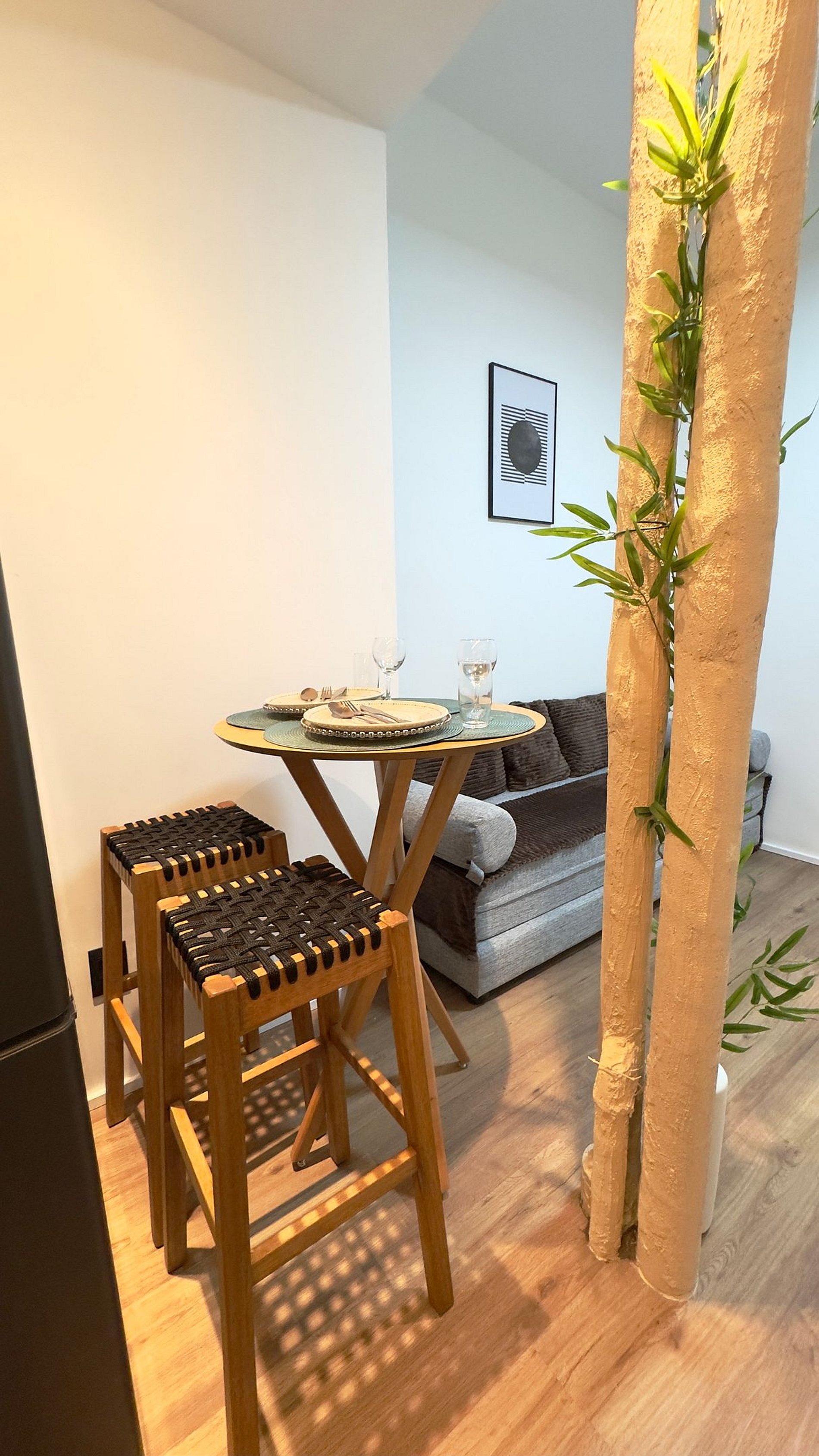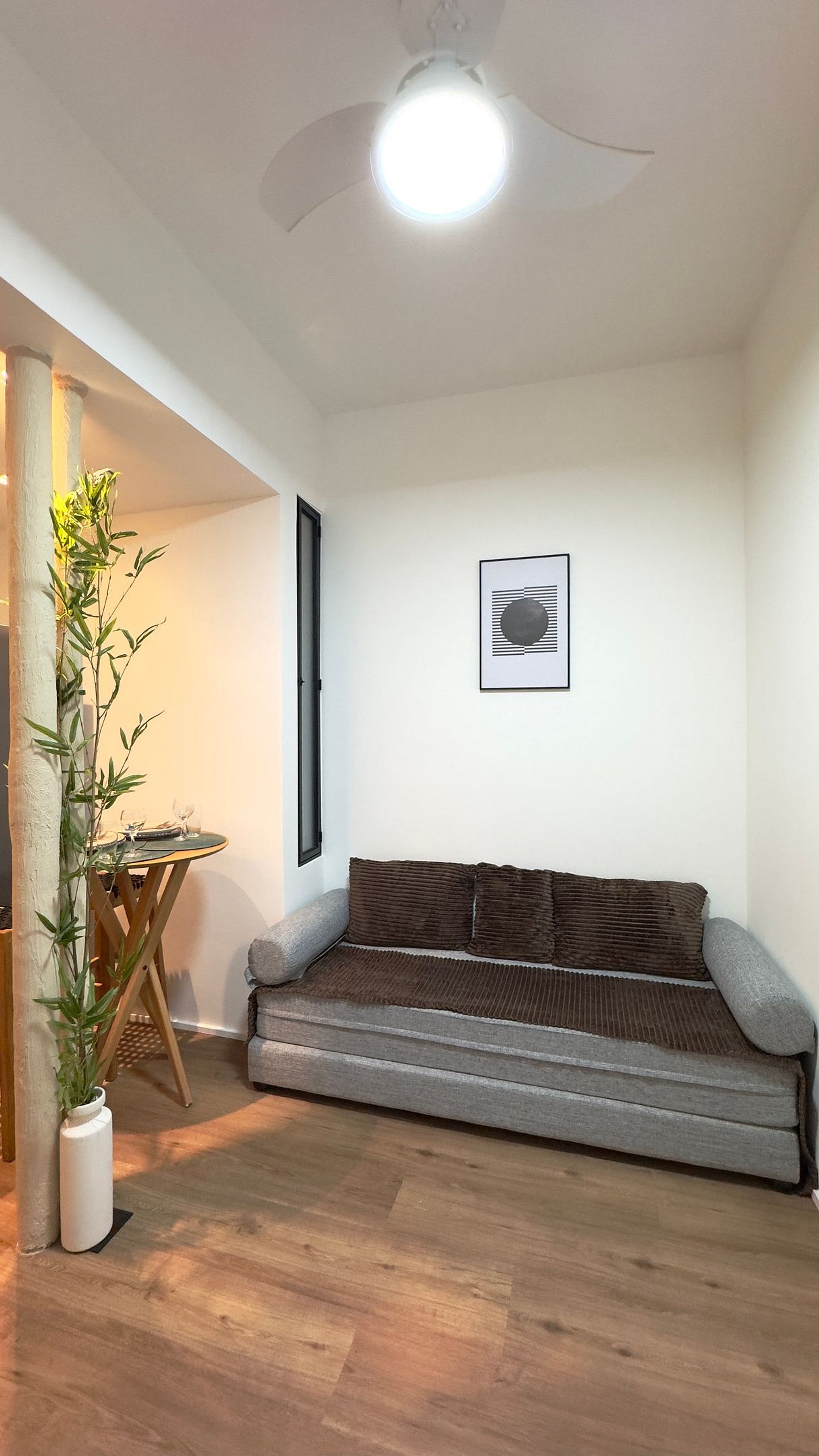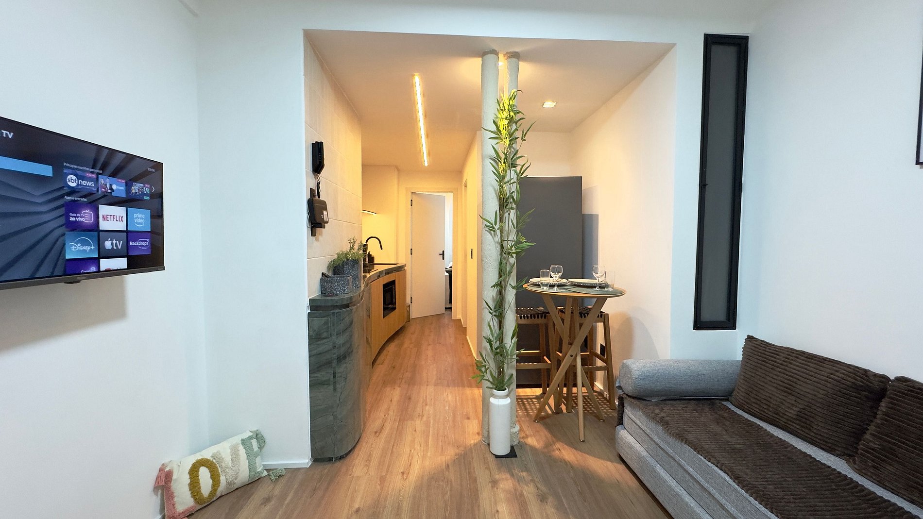 Ambiente agradável com Smart TV, sofá-cama e mesa para refeições — ideal para relaxar ou compartilhar bons momentos.