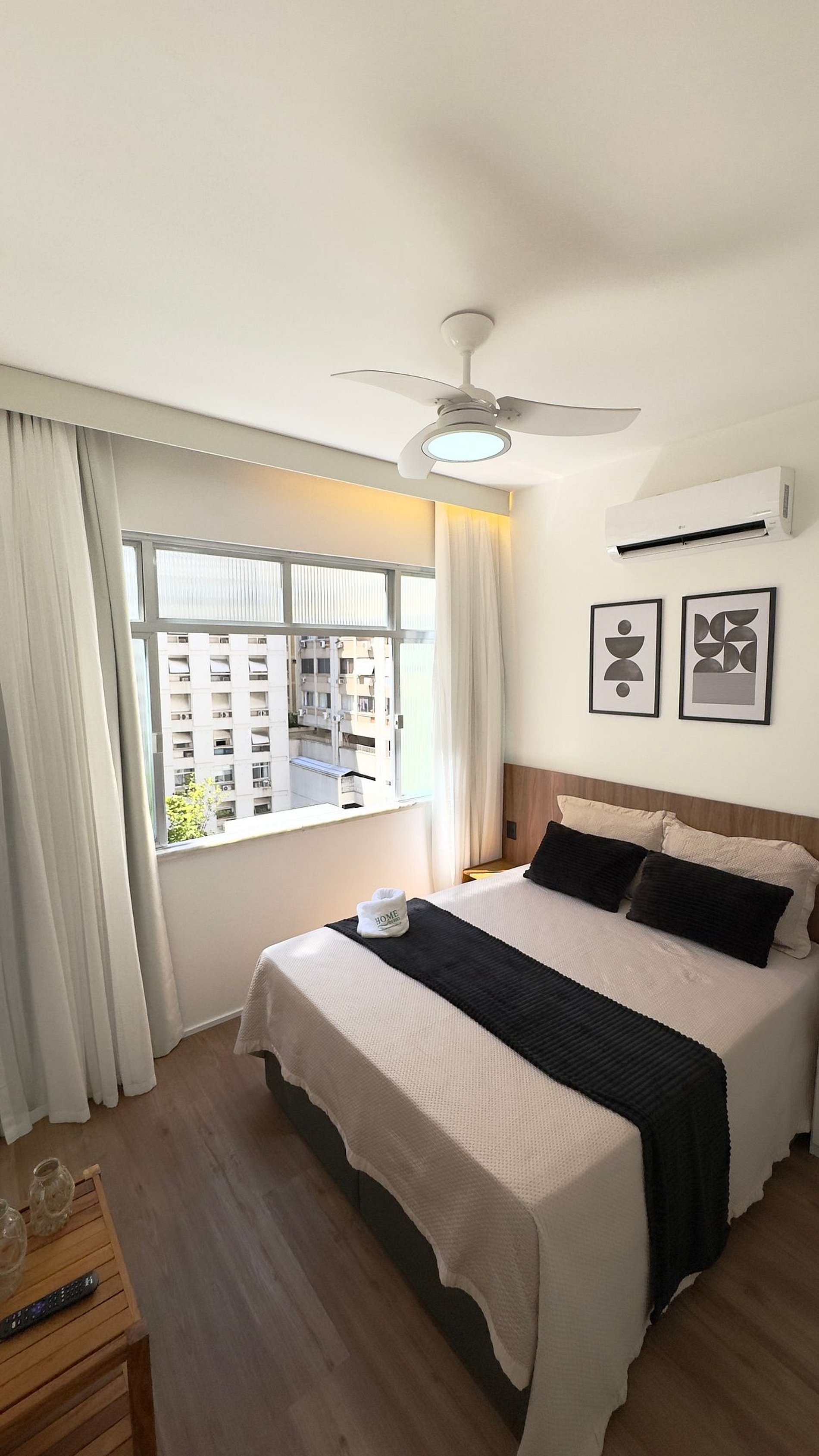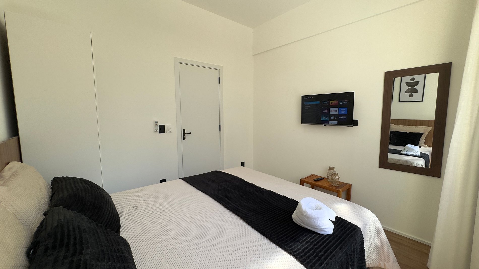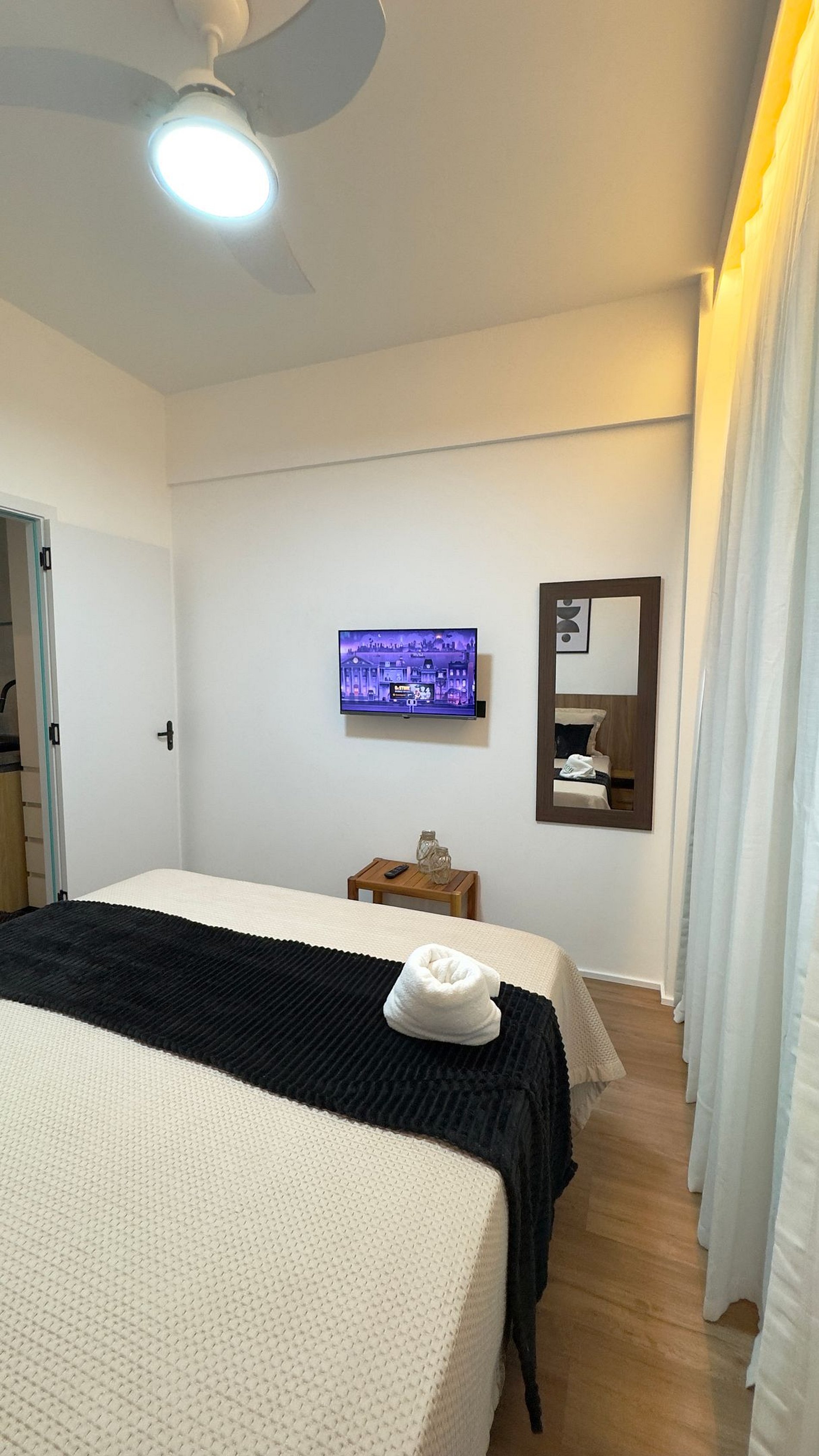 O apartamento conta com 1 quarto aconchegante, equipado com cama queen, roupas de cama de qualidade, ar-condicionado, ventilador de teto, ferro de passar e Smart TV para seus momentos de descanso.