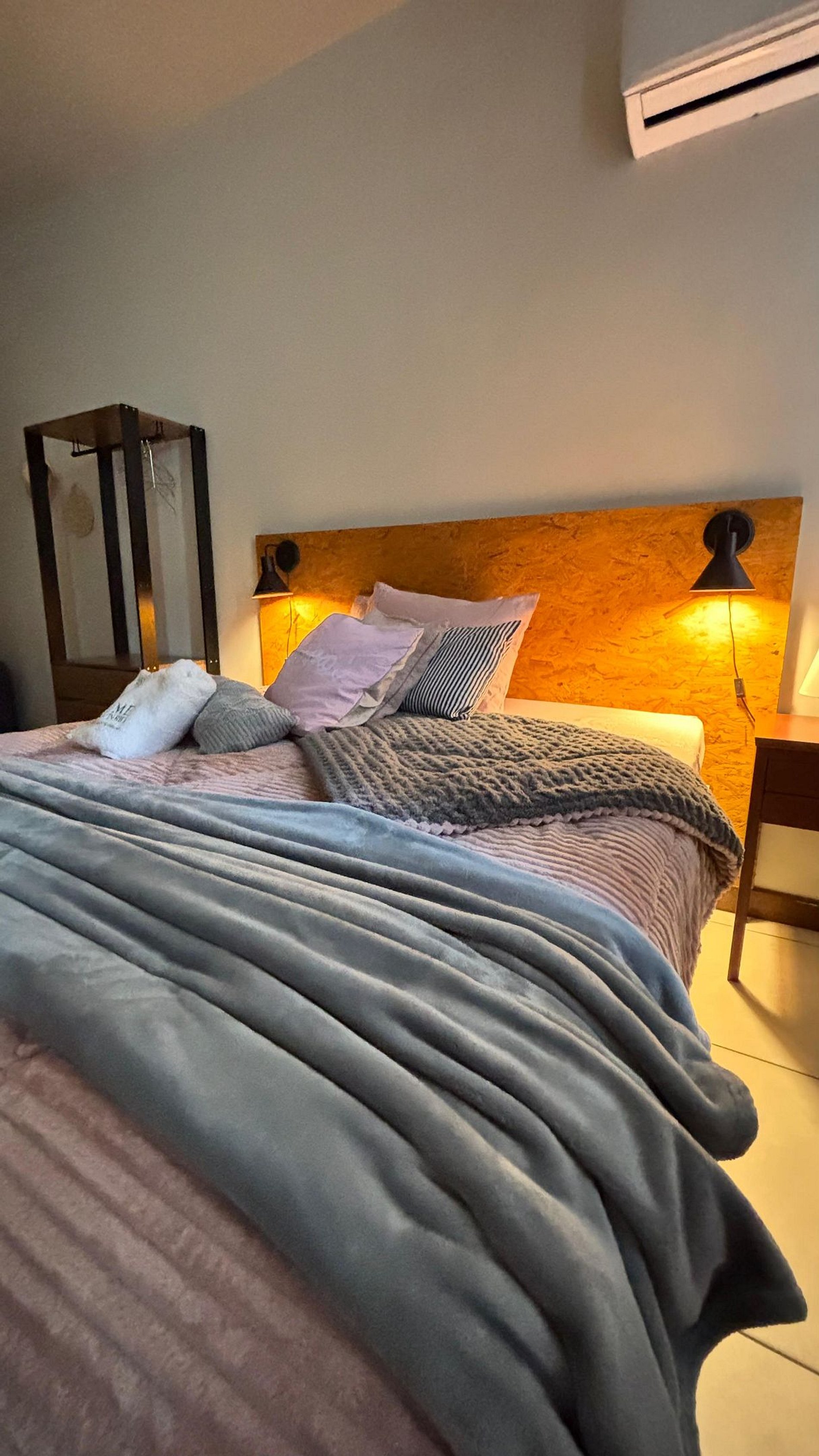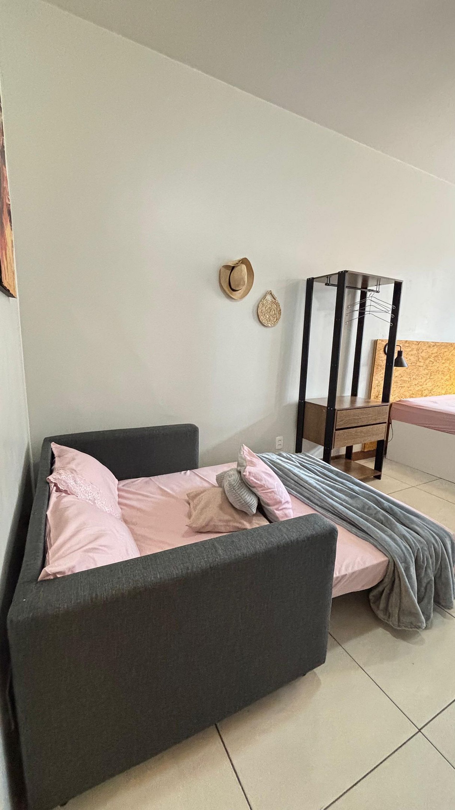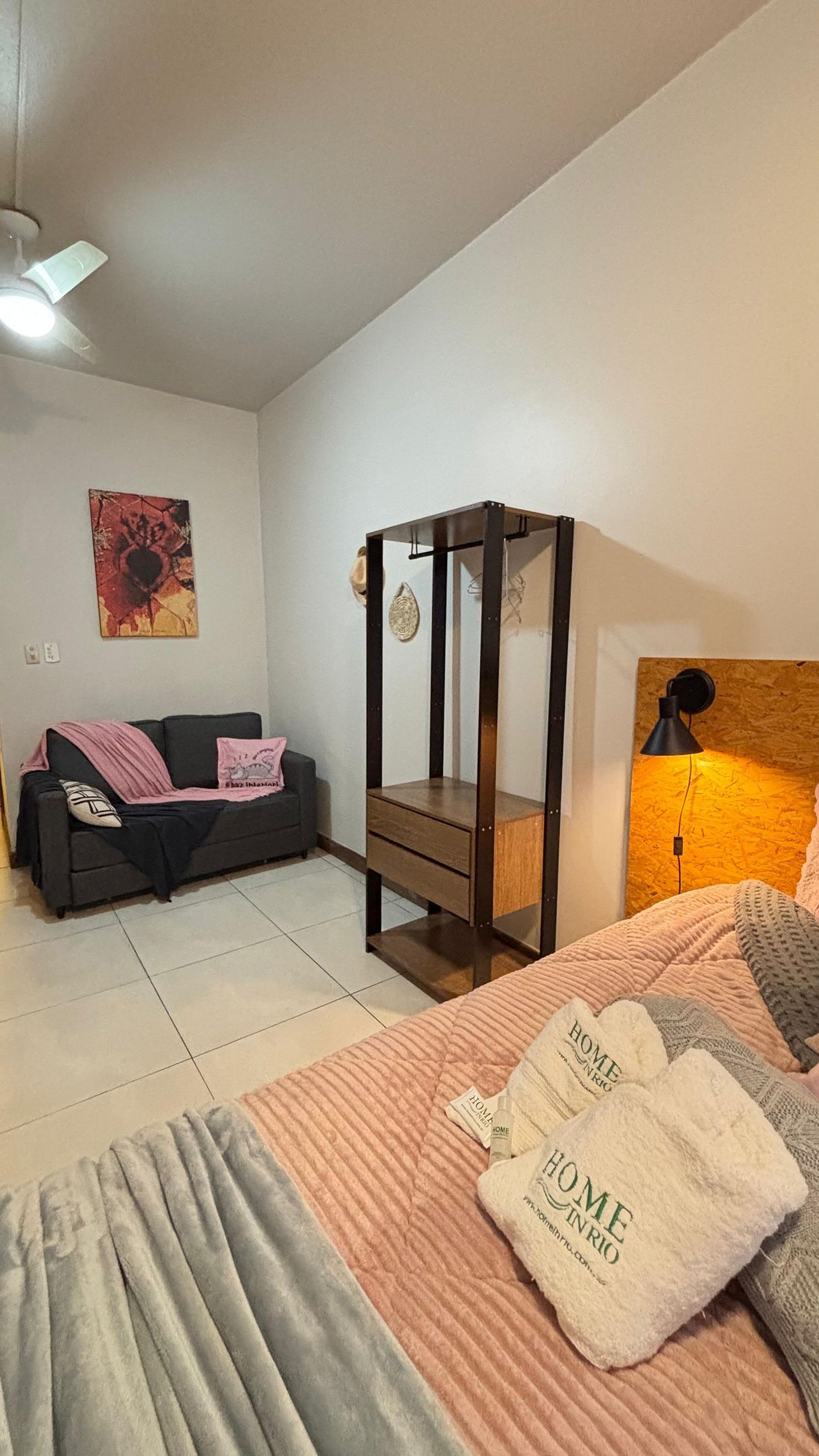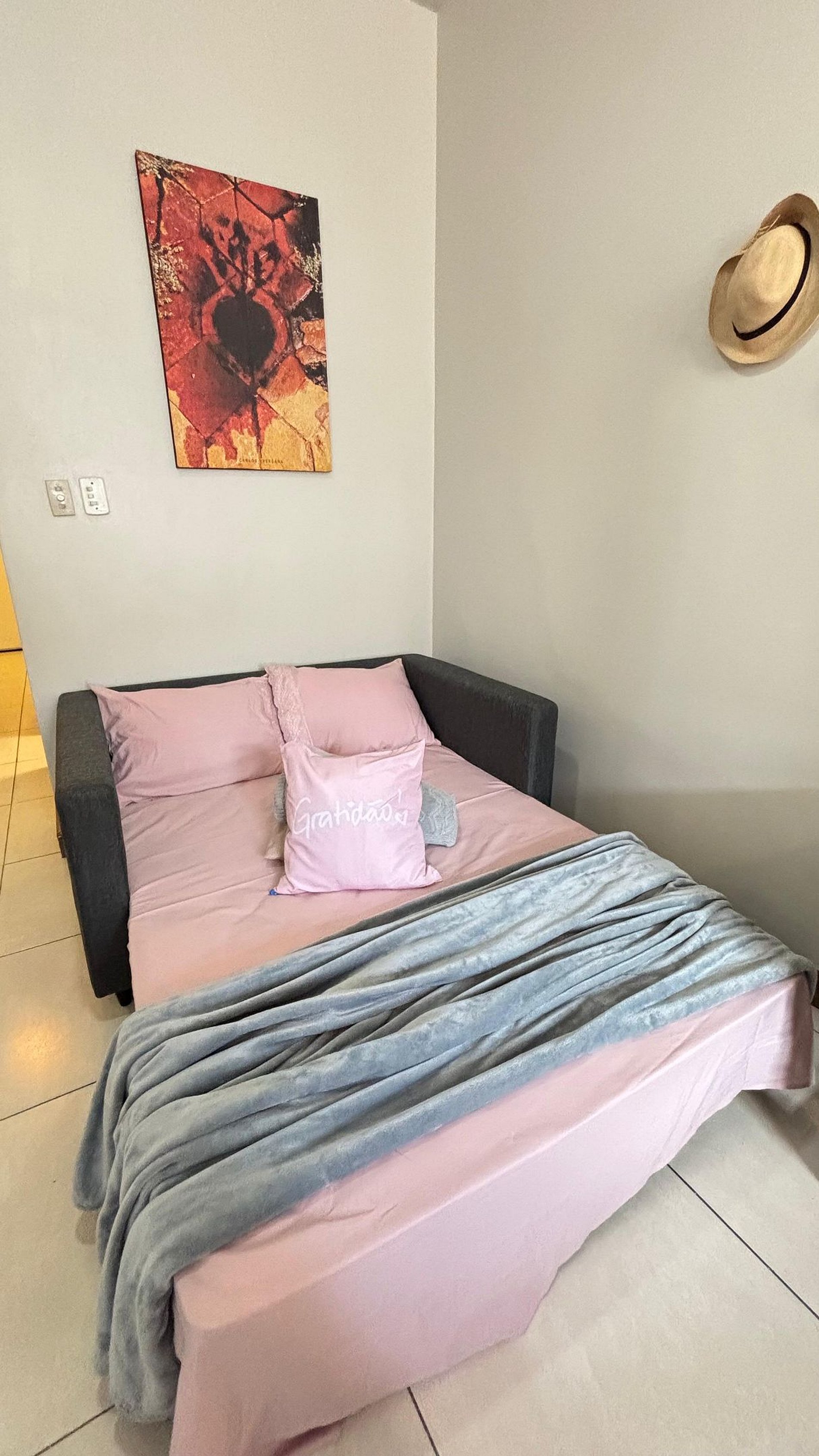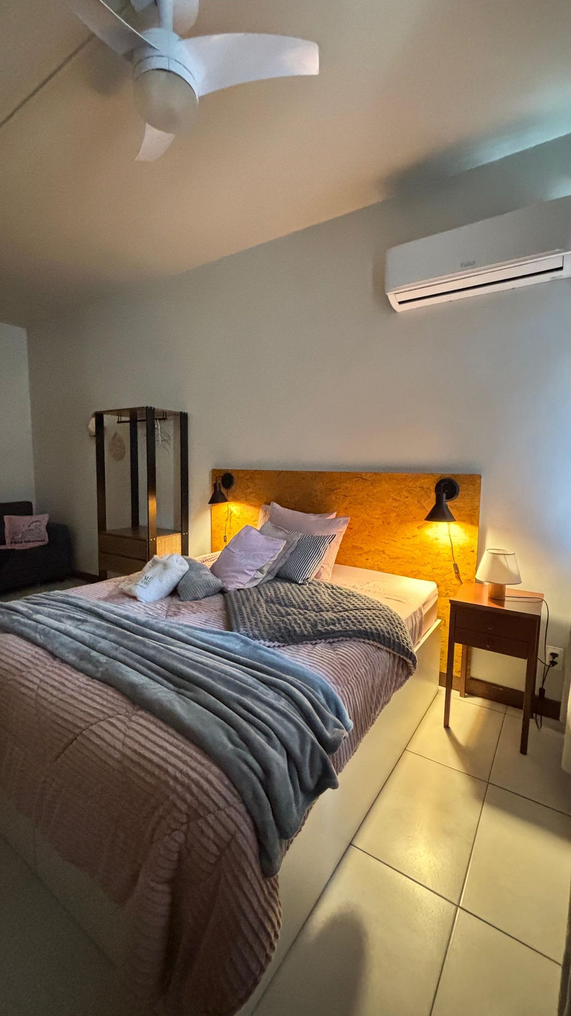 Quarto aconchegante com cama QueenSize, ar-condicionado, ventilador de teto, arara de roupas, confortável sofa-cama de casal, roupas de cama incluídas.
