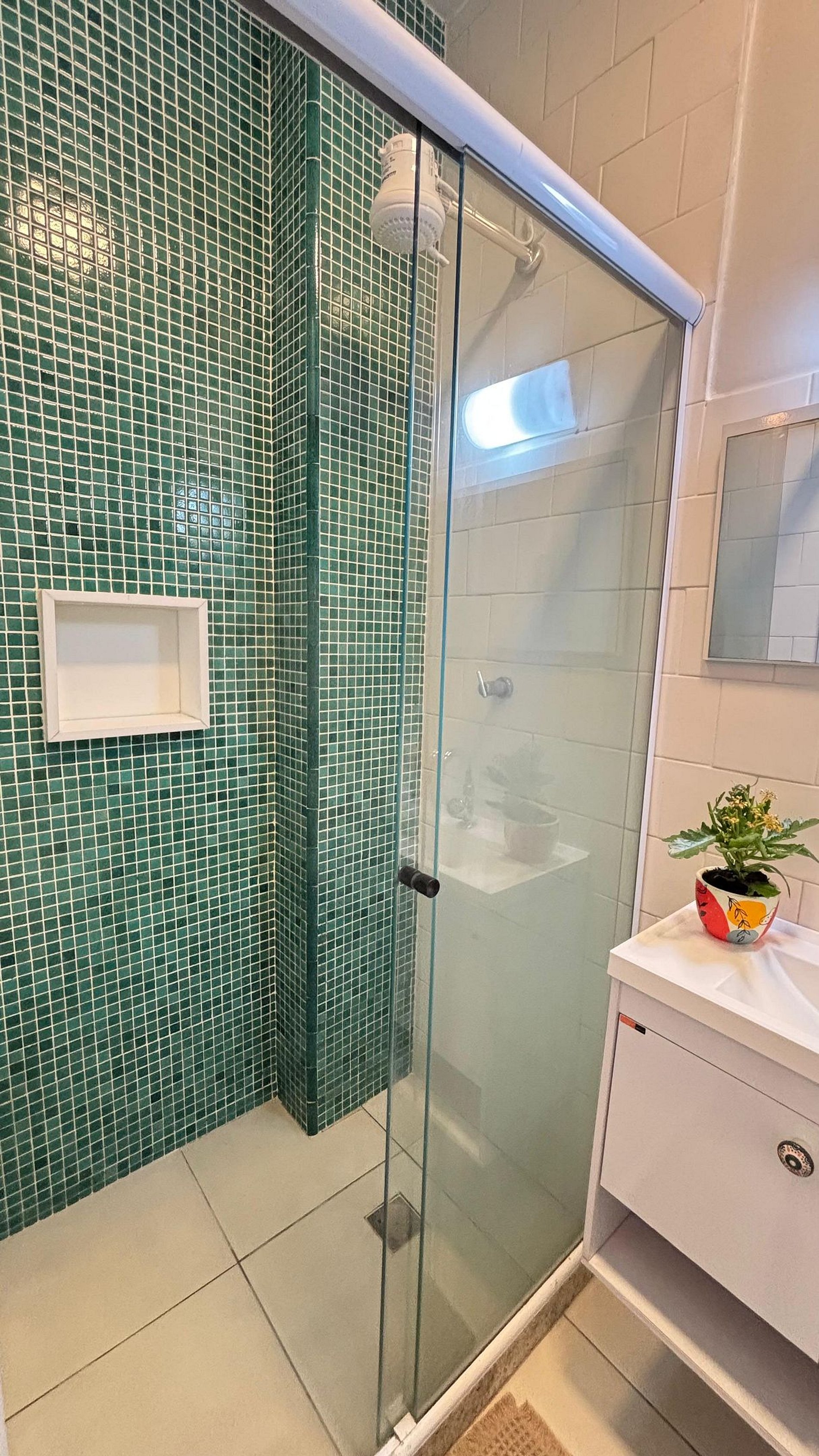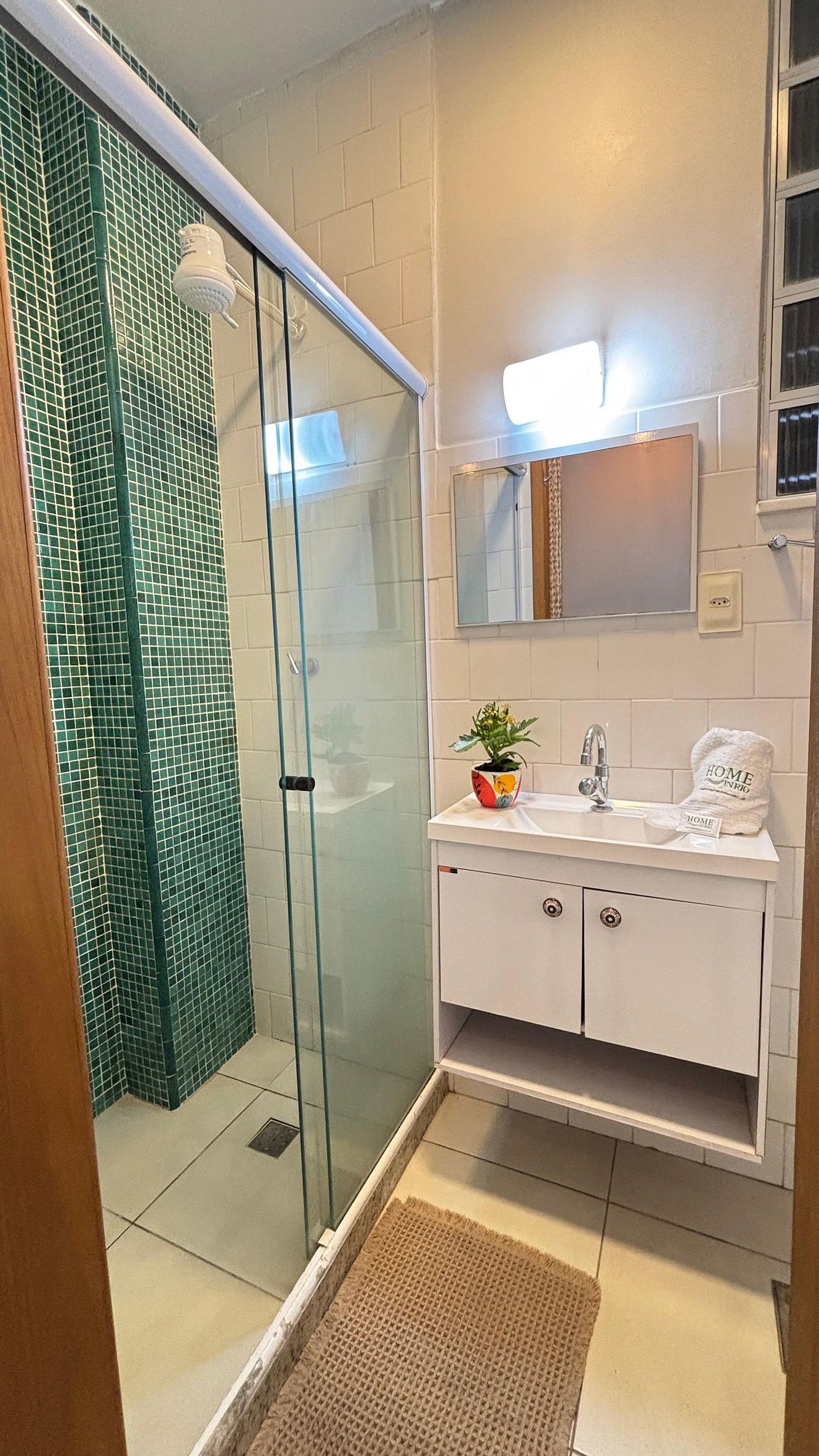 Banheiro completo com chuveiro elétrico e toalhas fornecidas, secador de cabelo.