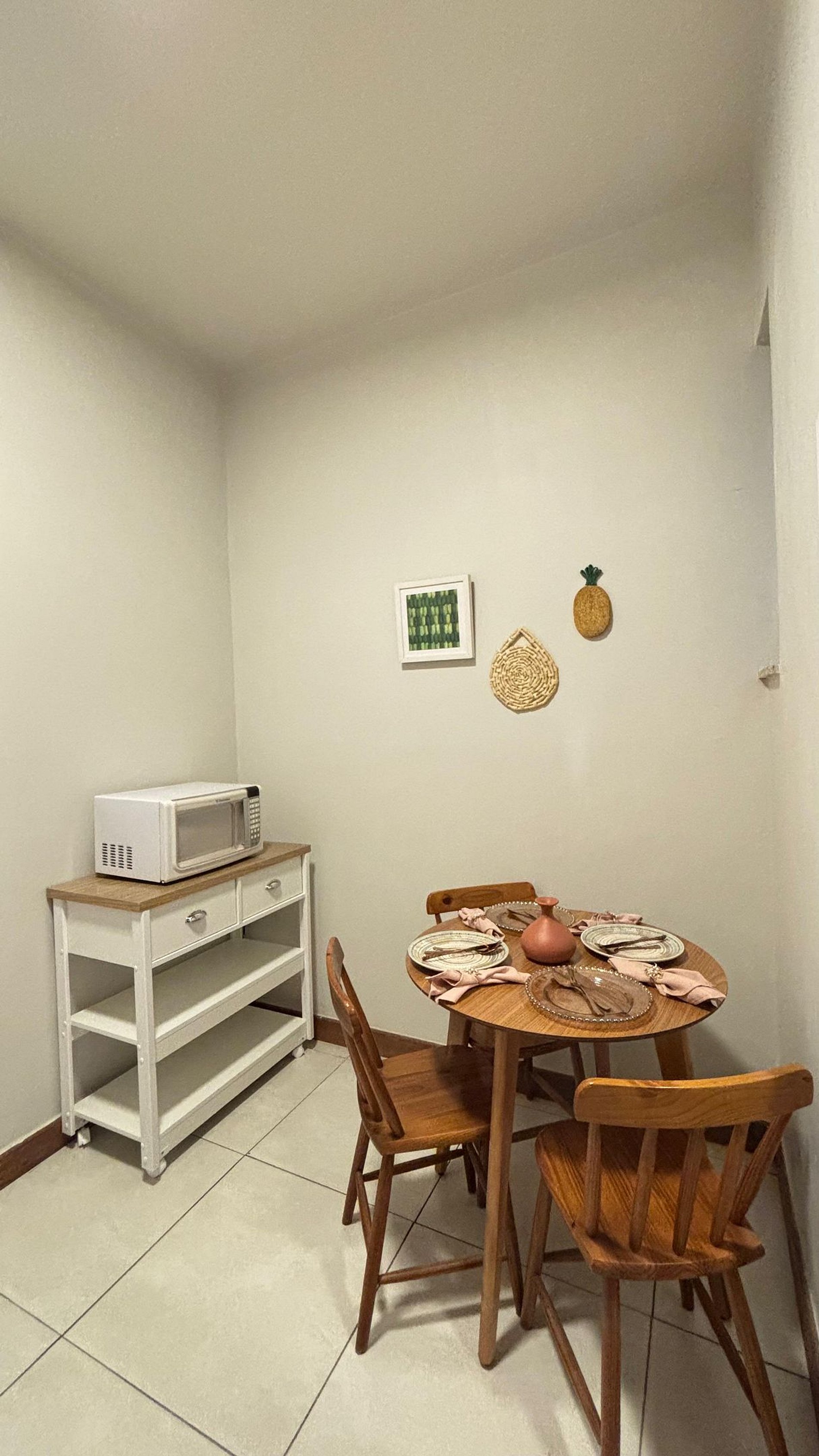 Cozinha funcional com geladeira, cooktop de indução, micro-ondas, utensílios básicos para cozinhar e mesa de jantar.