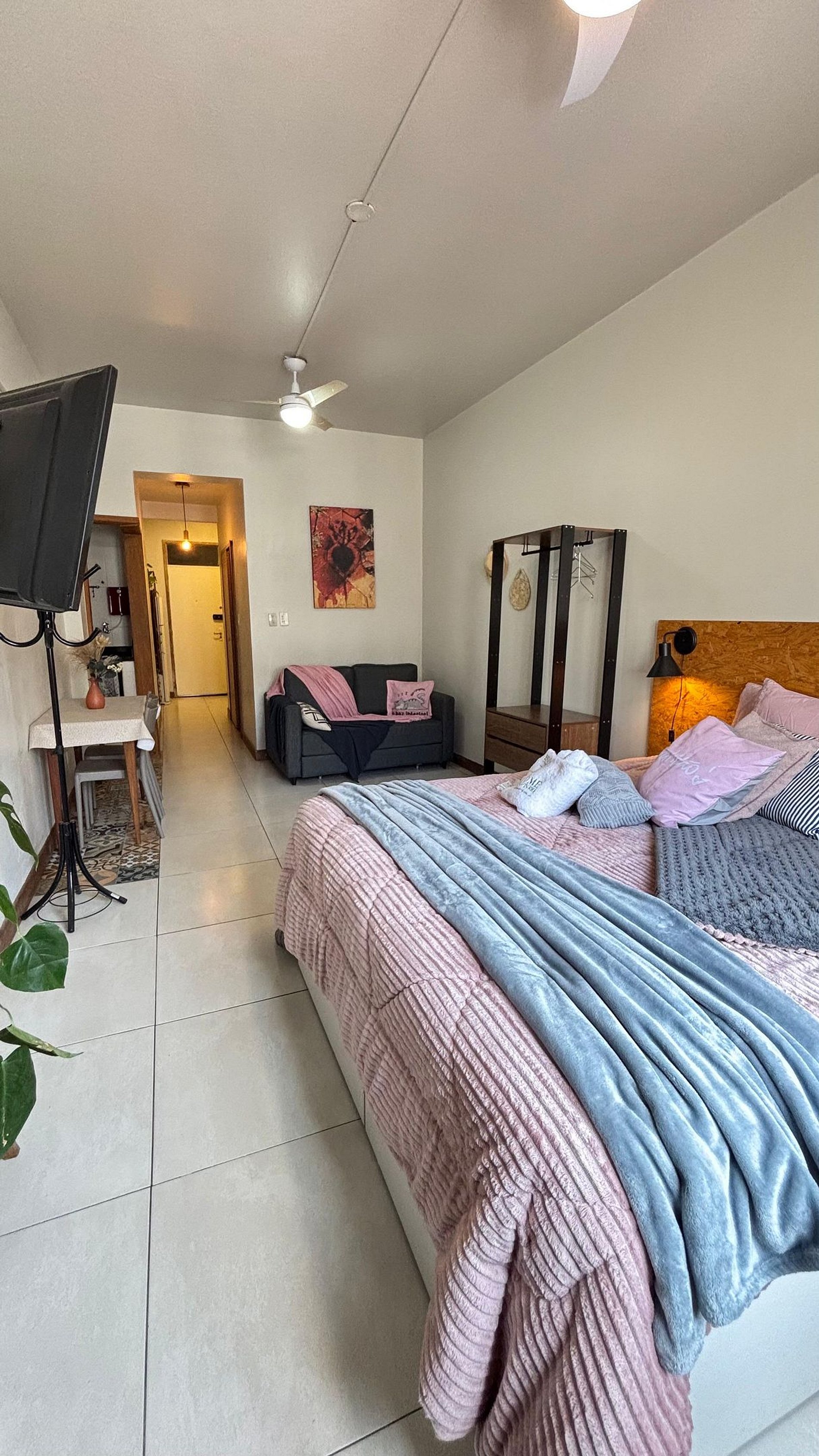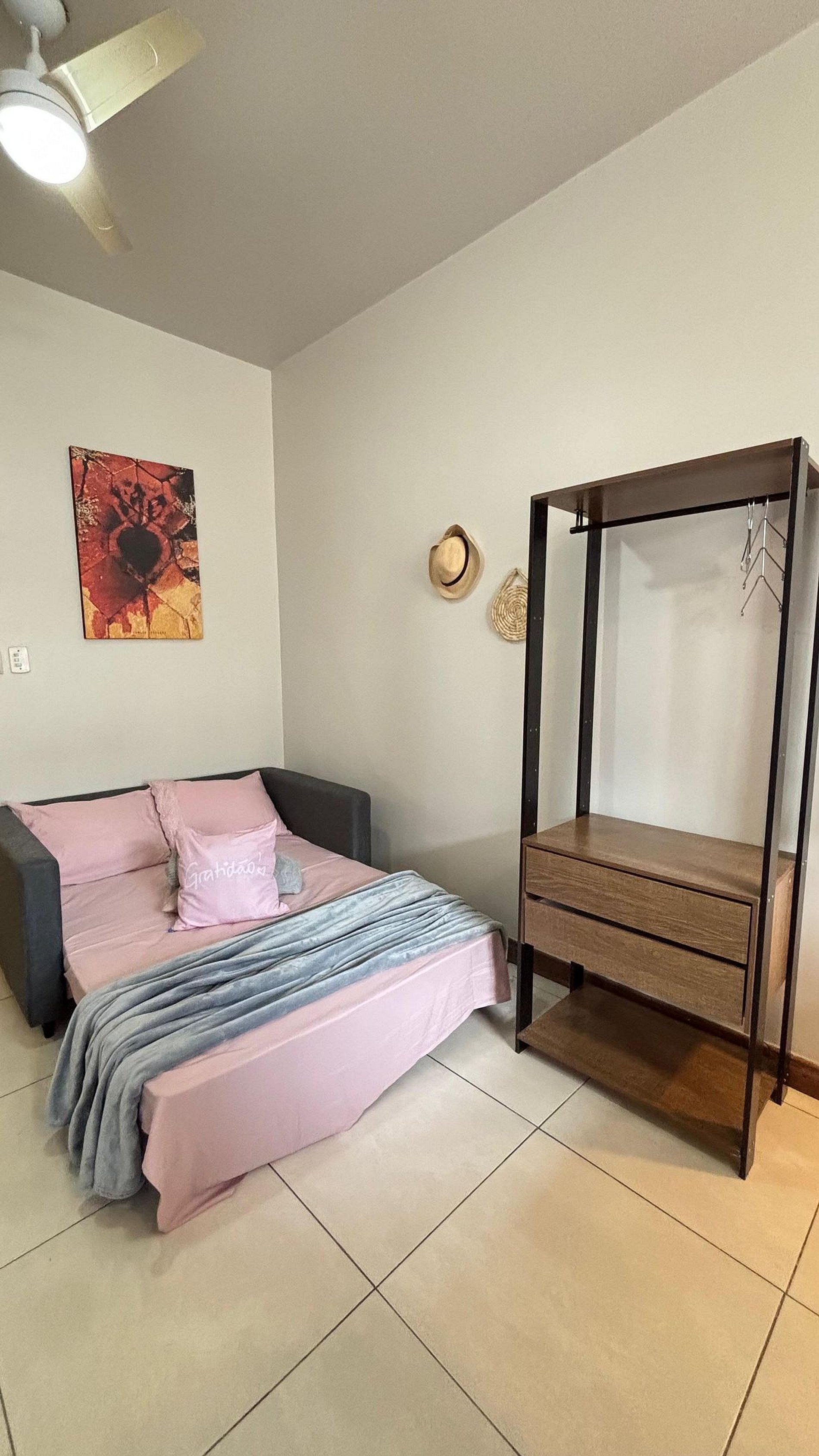 Quarto aconchegante com cama QueenSize, ar-condicionado, ventilador de teto, arara de roupas, confortável sofa-cama de casal, roupas de cama incluídas.