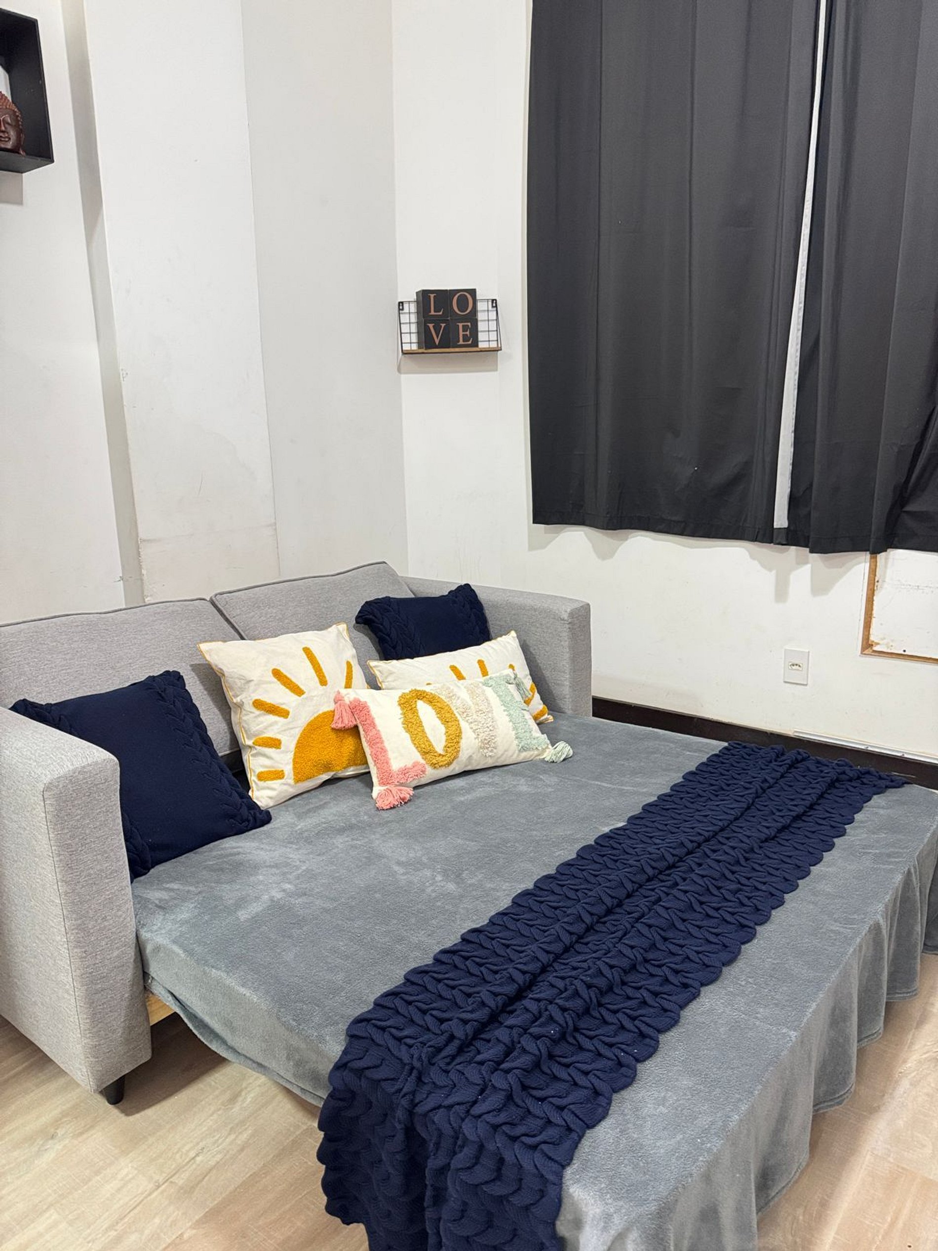 Sofá-cama que acomoda até 2 pessoas.