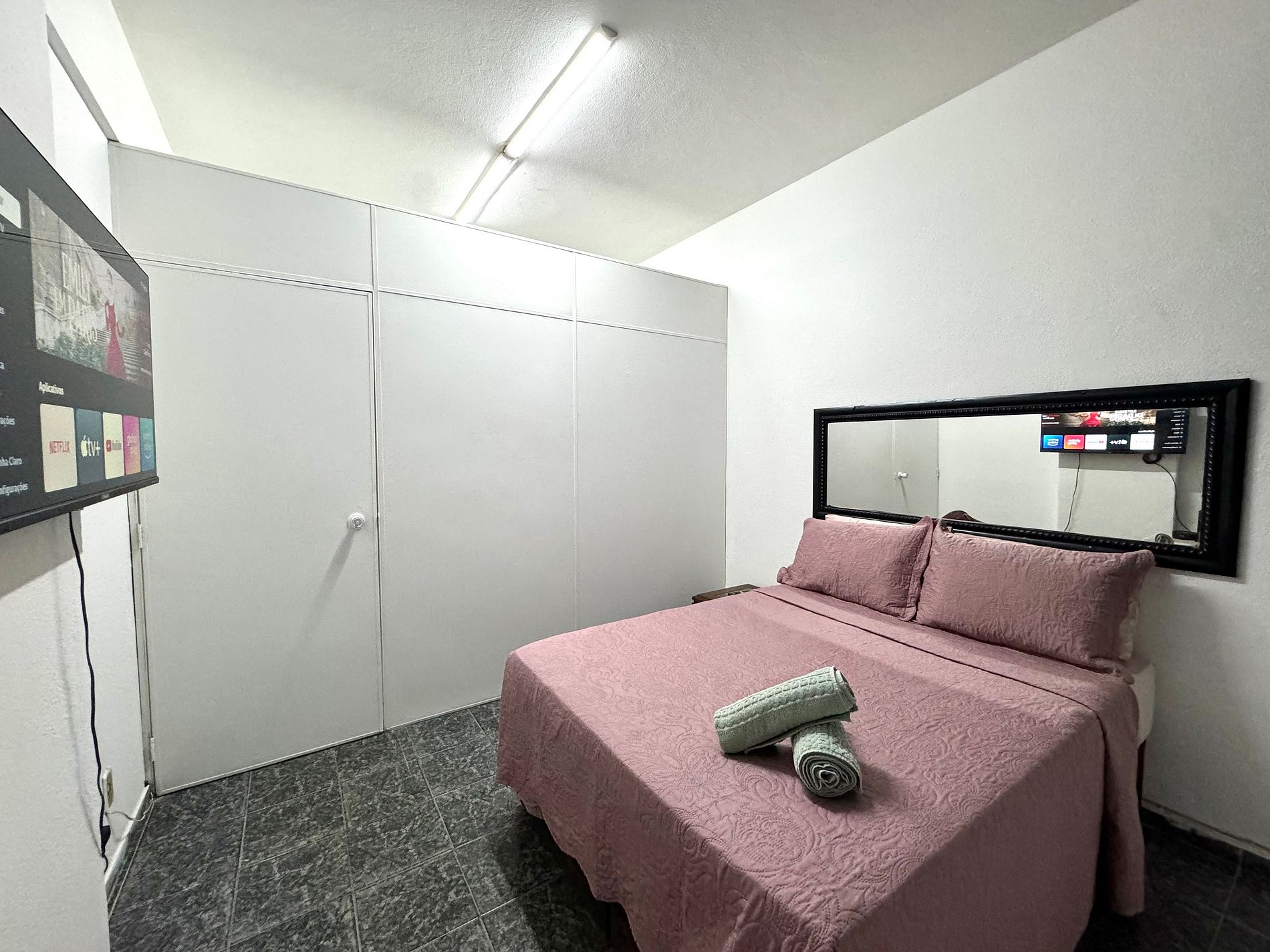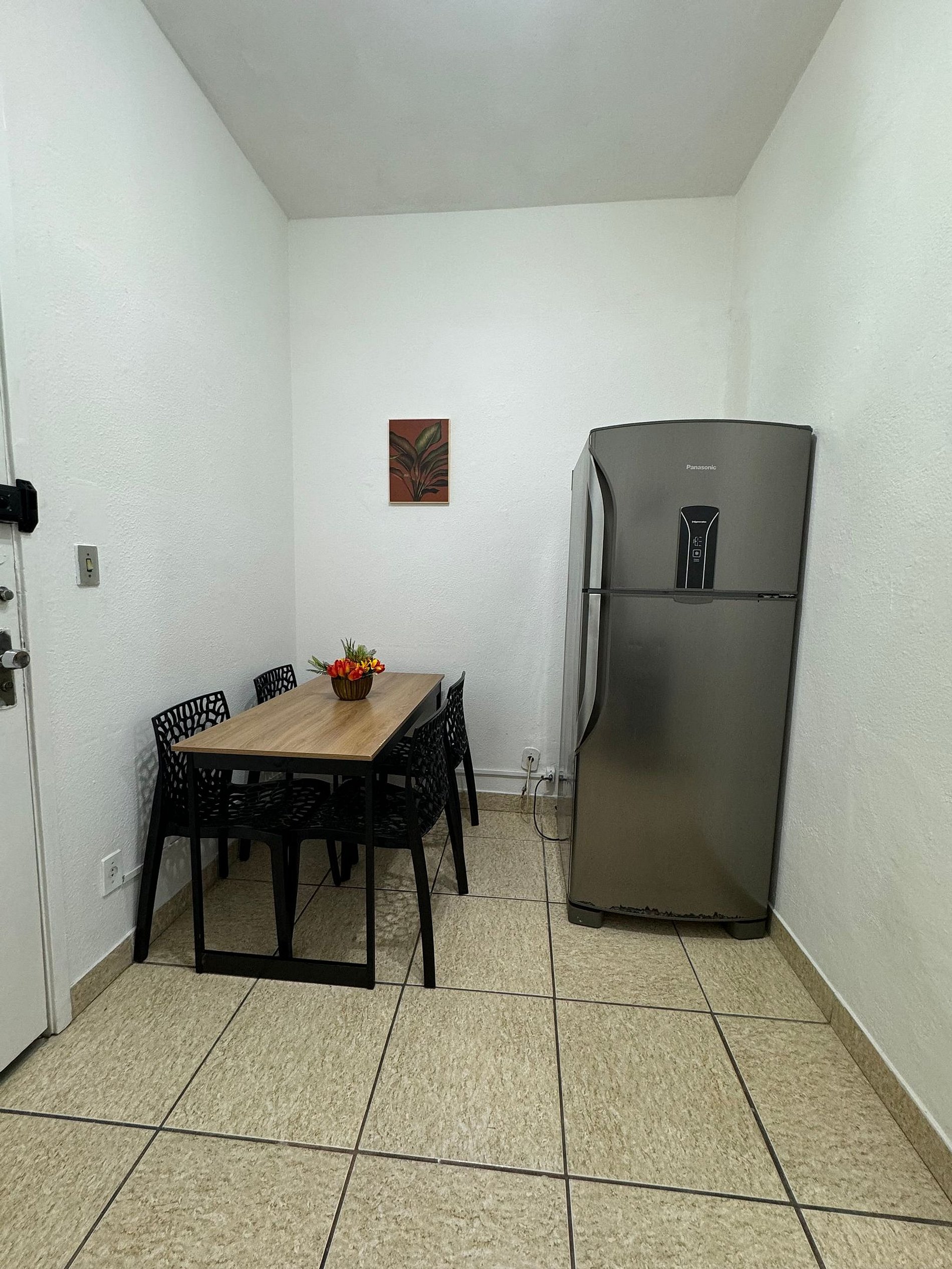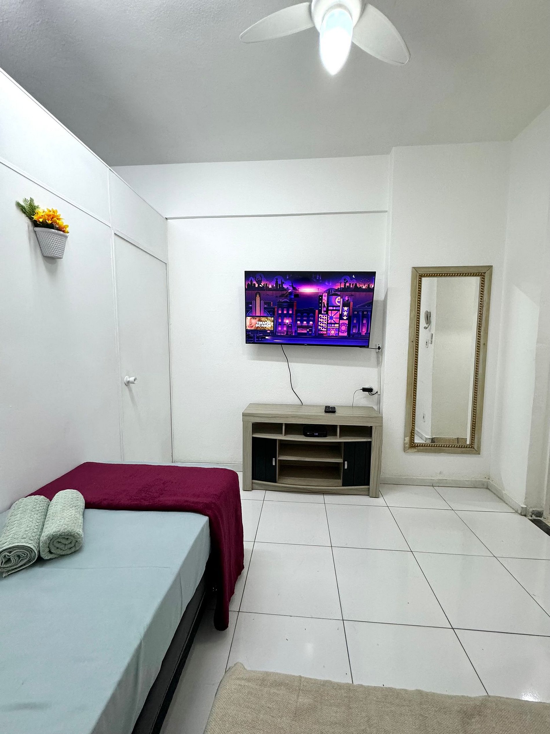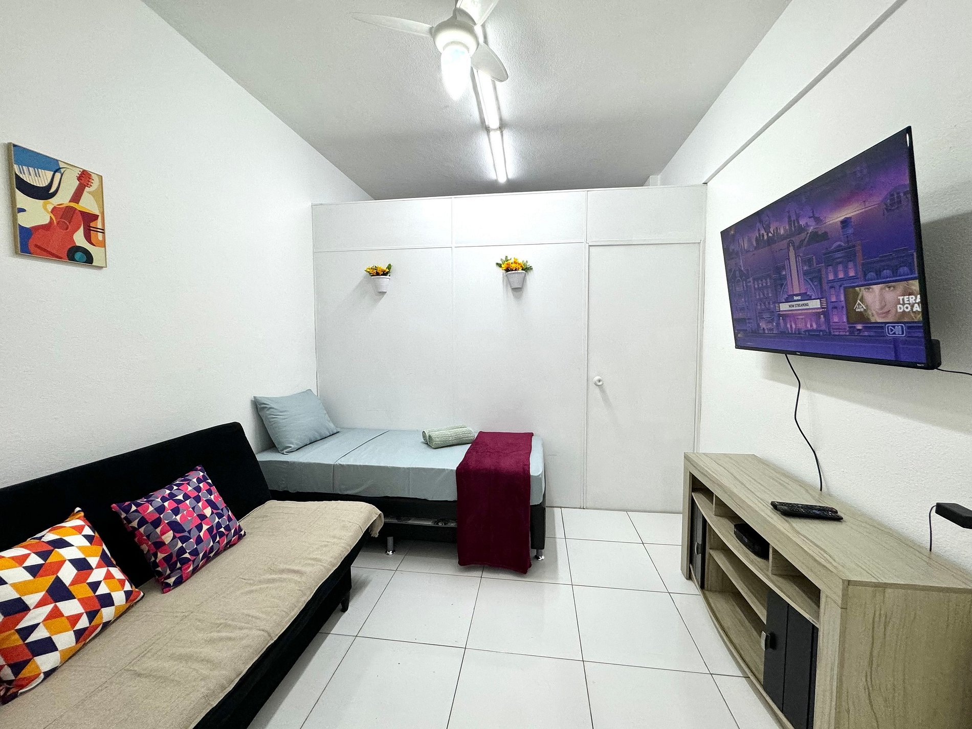 Na sala, você encontrará um sofá-cama espaçoso e uma prática bi-cama, que acomodam confortavelmente até três pessoas. Também há uma Smart TV para momentos de lazer, e um ventilador que garante boa circulação de ar nos dias mais quentes. Perfeito para relaxar após um dia explorando a cidade!