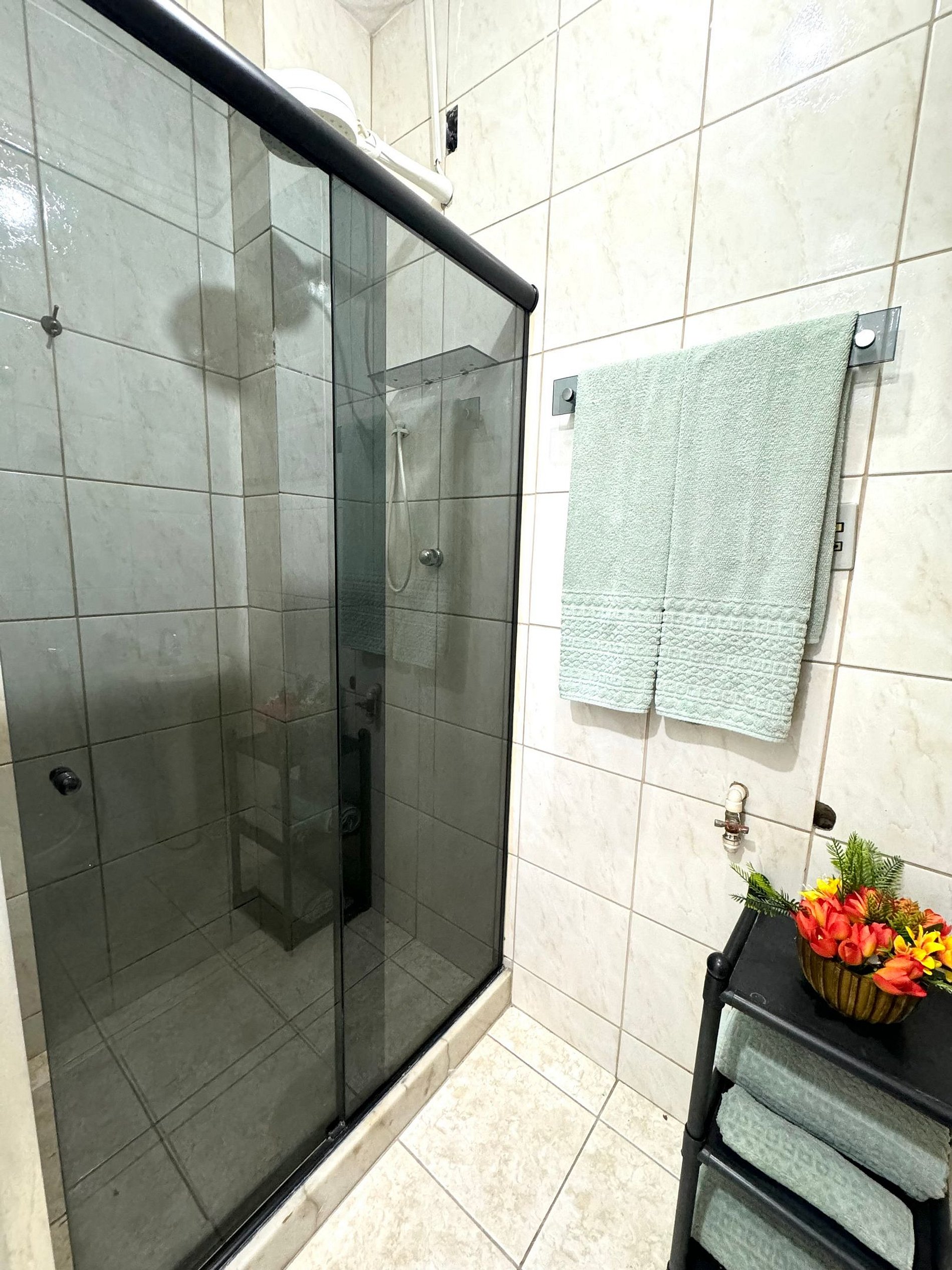 O banheiro dispõe de chuveiro elétrico com ótima pressão de água, secador de cabelo, toalhas limpas e itens básicos para higiene. Tudo pensado para oferecer conforto e praticidade durante sua estadia.