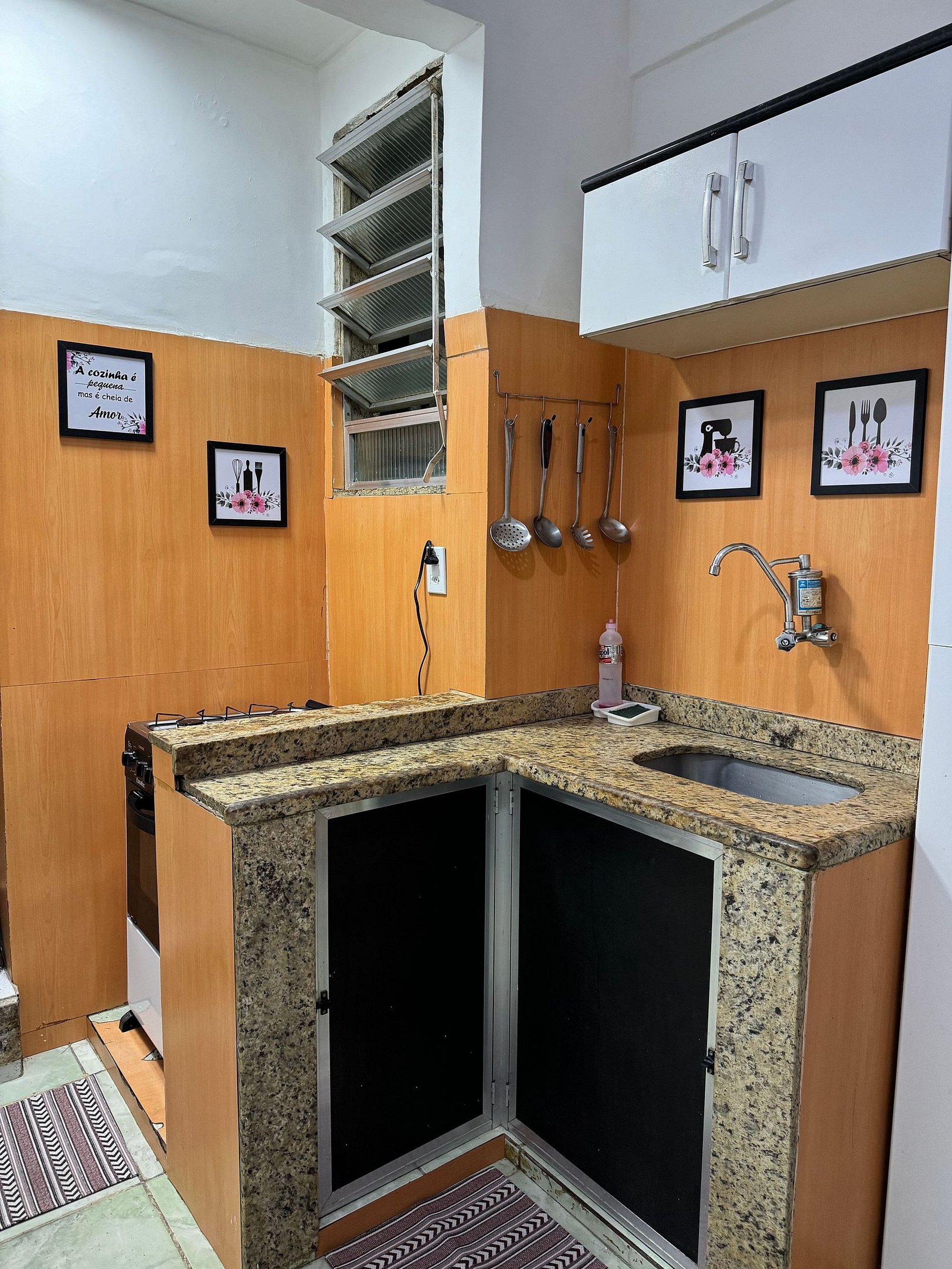 Geladeira, micro-ondas e utensílios completos para cozinhar