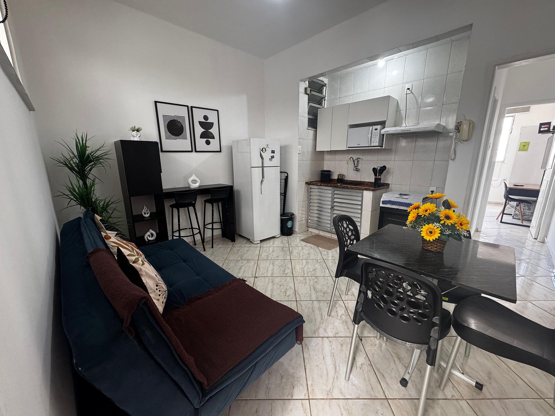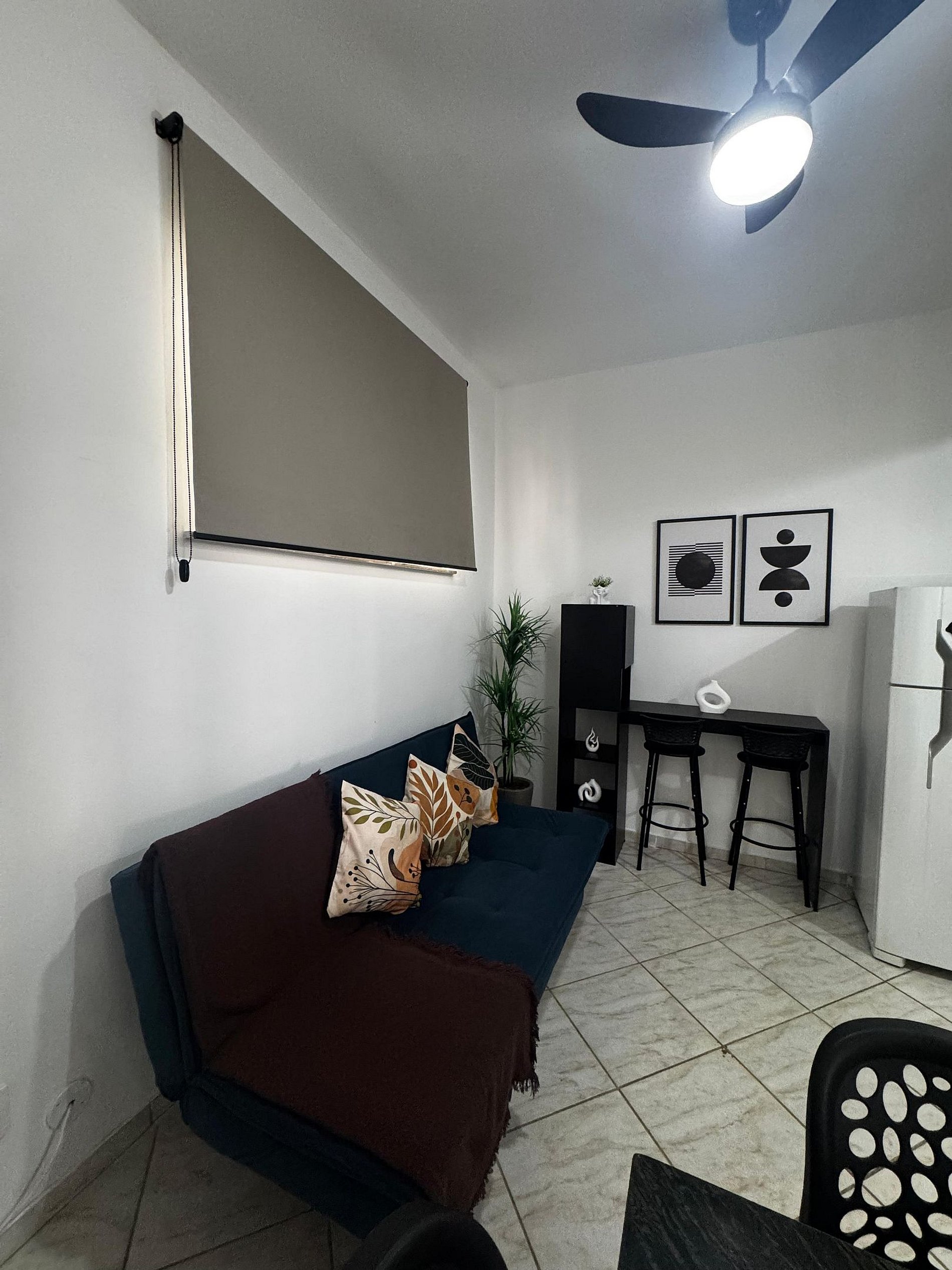 O ambiente da sala é bem iluminado e ideal para relaxar. Possui um sofá-cama de casal confortável, que acomoda mais 1 pessoas, e um espaço para refeições agradável, perfeito para um jantar ou um lanche rápido.