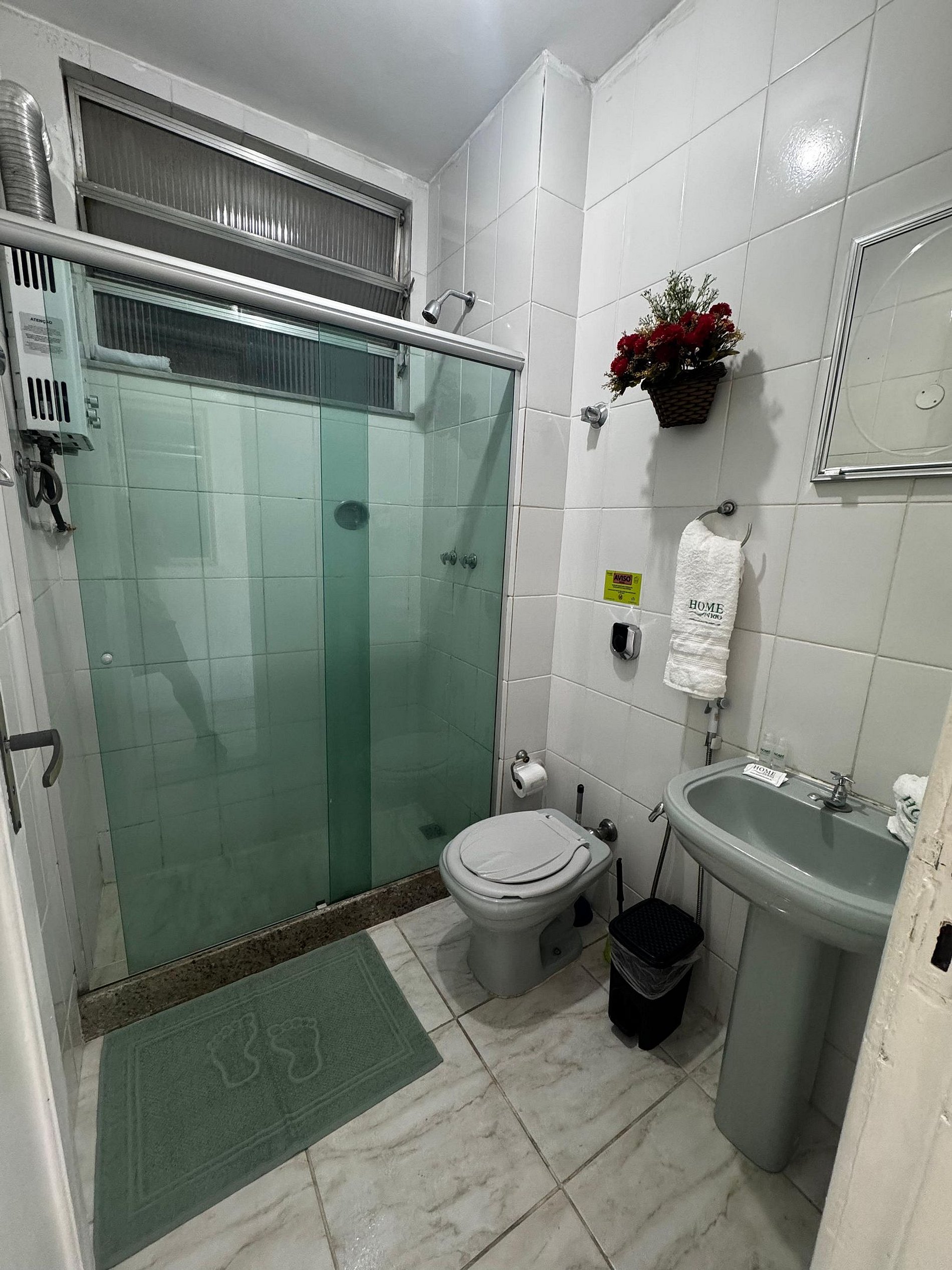 Banheiro privativo equipado com chuveiro com aquecedor a gás, toalhas limpas, secador de cabelo e um ambiente sempre higienizado e bem cuidado para seu conforto.