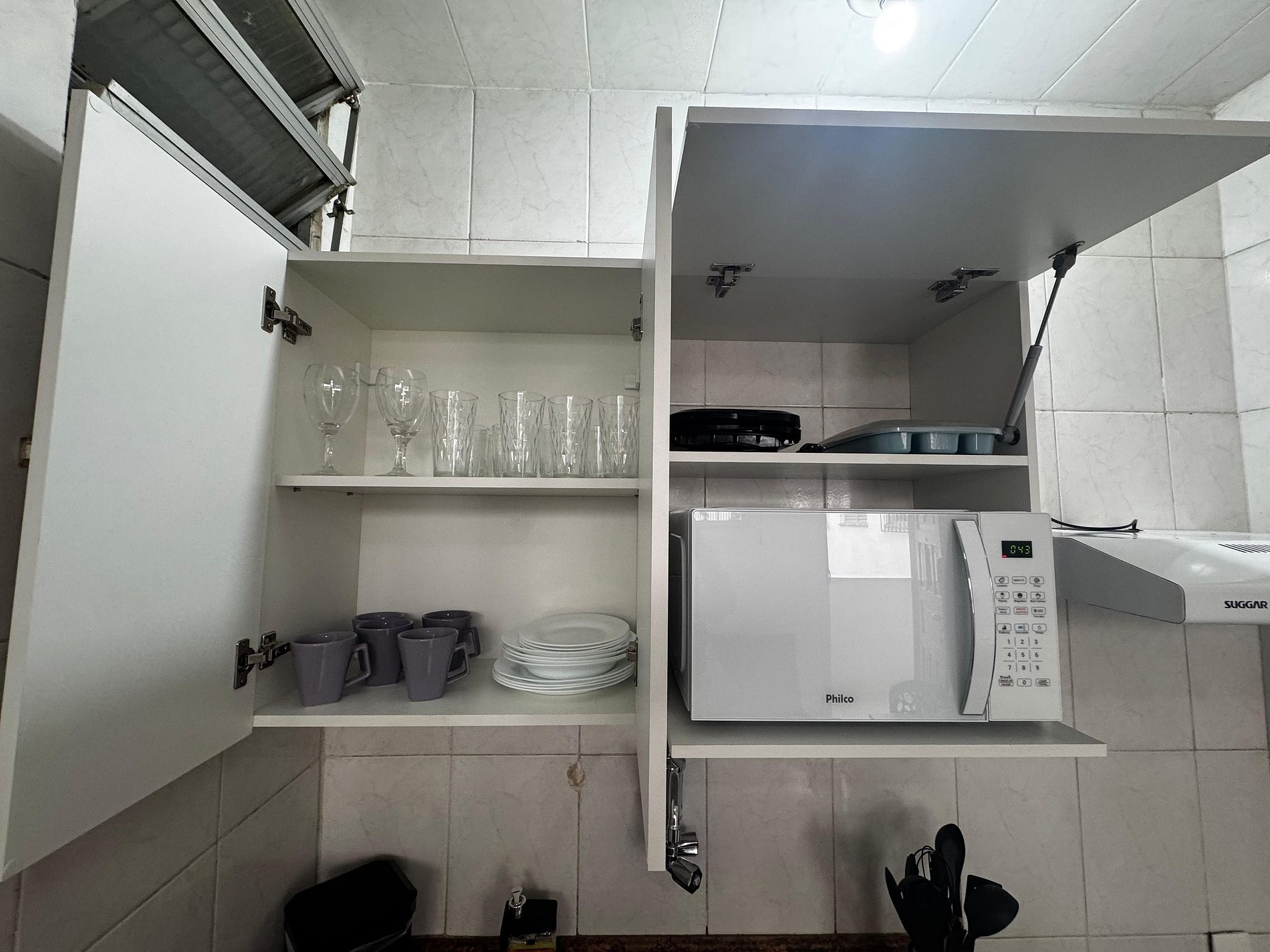 Conta com fogão de 4 bocas, geladeira, micro-ondas, geladeira, além de utensílios completos como panelas, pratos, talheres, copos e outros itens essenciais para cozinhar com praticidade.