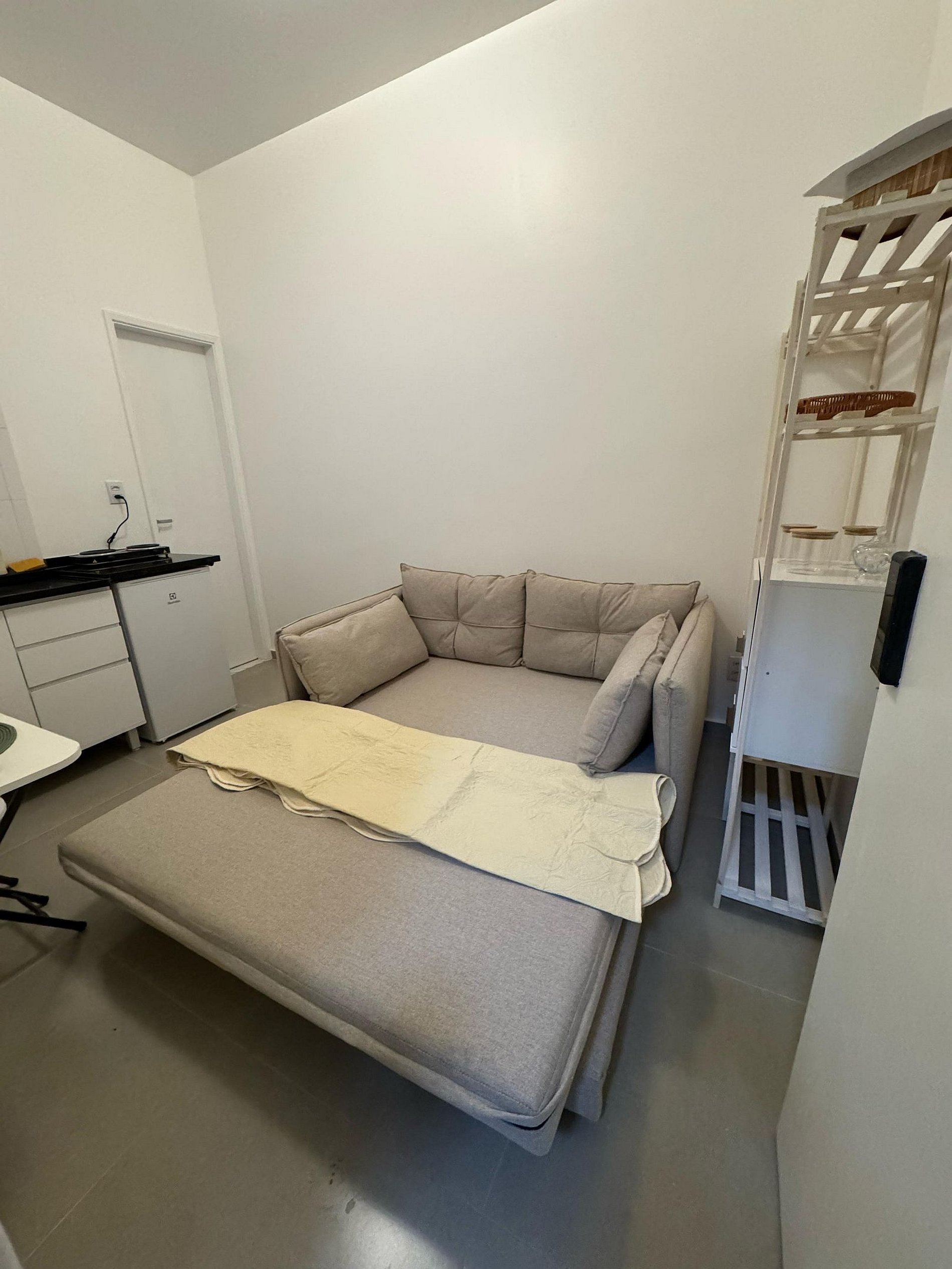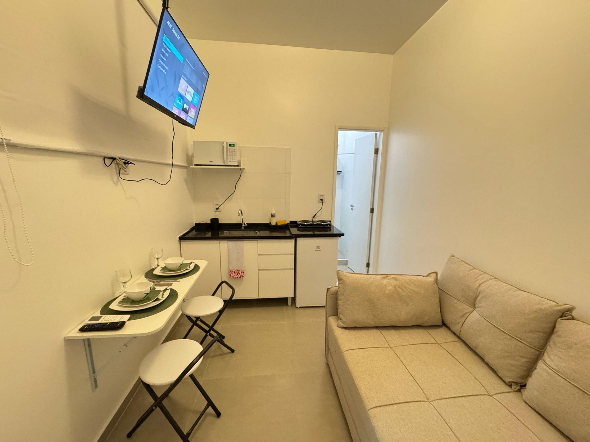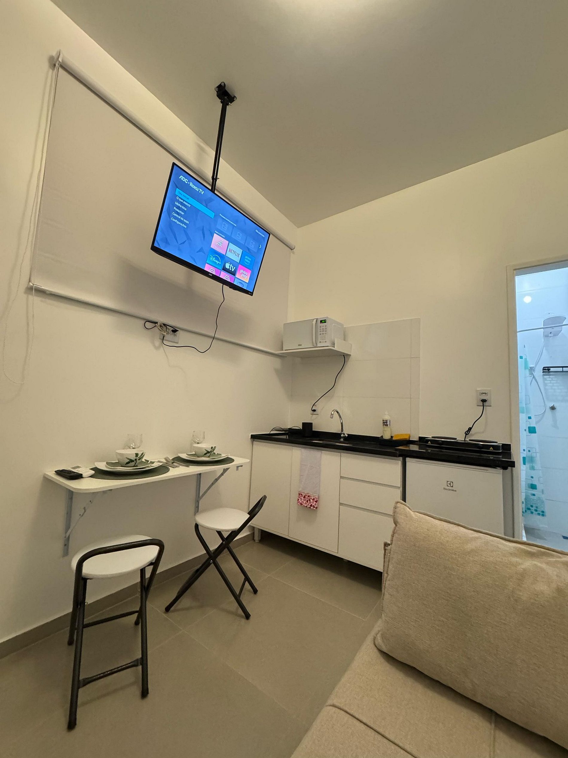 Studio com um sofá cama confortável, TV, banheiro com chuveiro elétrico, Microondas.