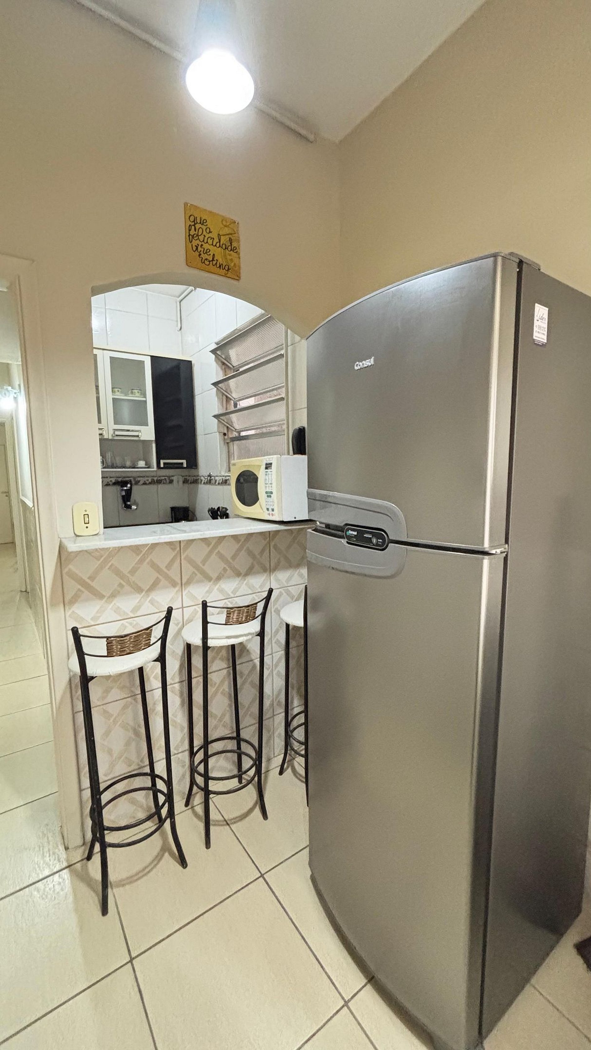 Geladeira, fogão e micro-ondas para preparar suas refeições com facilidade.