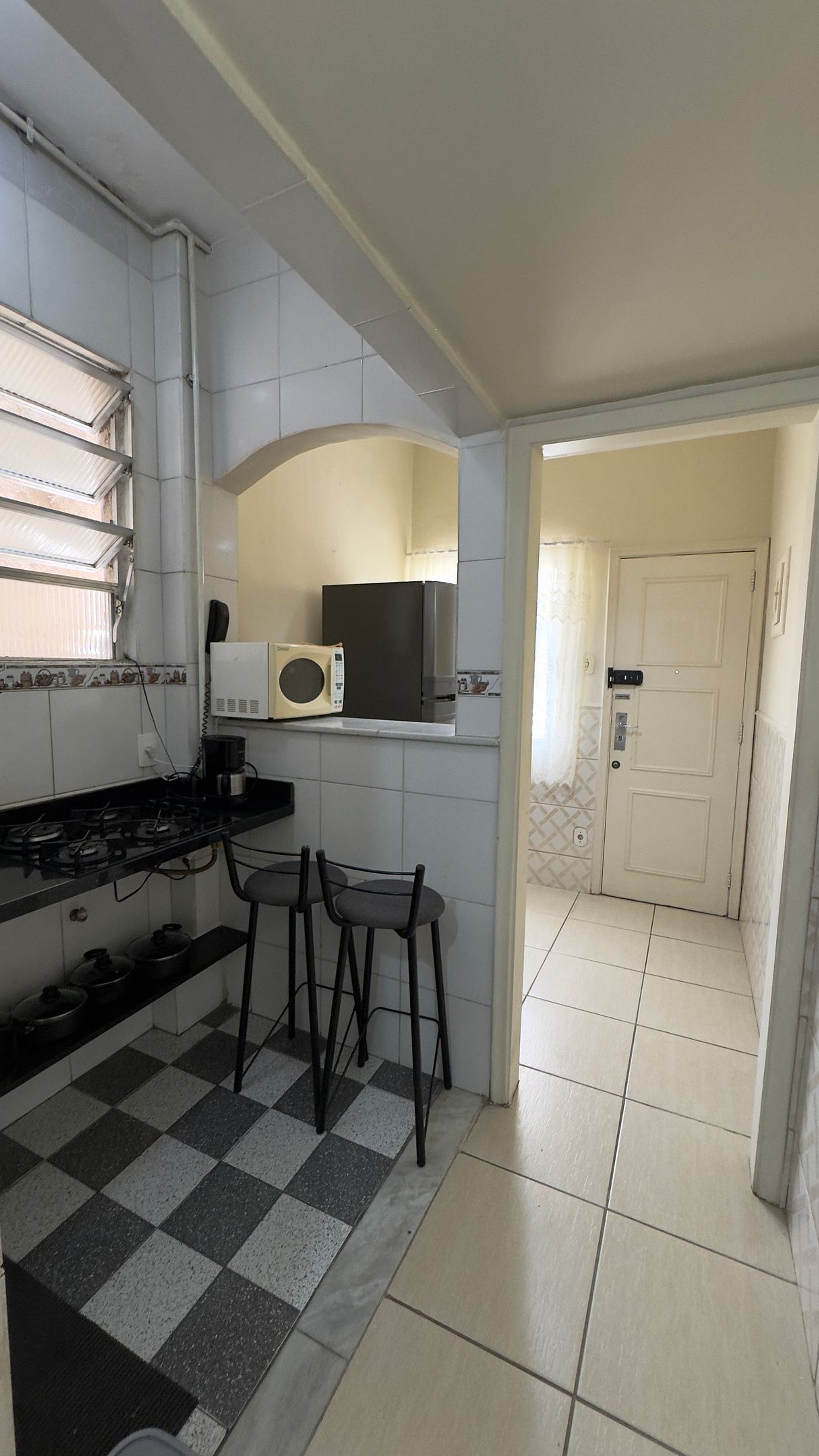 Geladeira, fogão e micro-ondas para preparar suas refeições com facilidade.