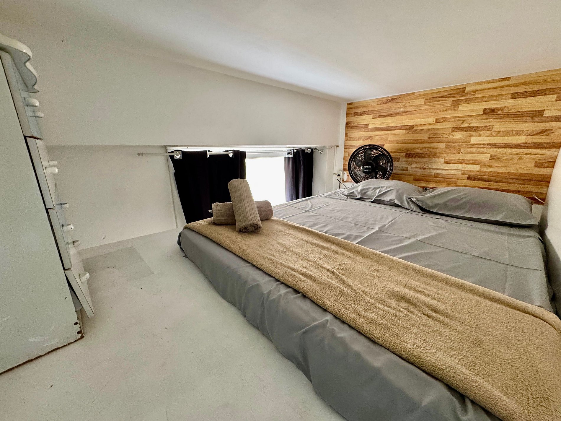 Mezanino Aconchegante medindo 1,10mt de altura O mezanino é um charme à parte: equipado com um colchão de casal, ventilador, roupas de cama e armários, é um espaço versátil ideal tanto para relaxar quanto para acomodar hóspedes extras com conforto.