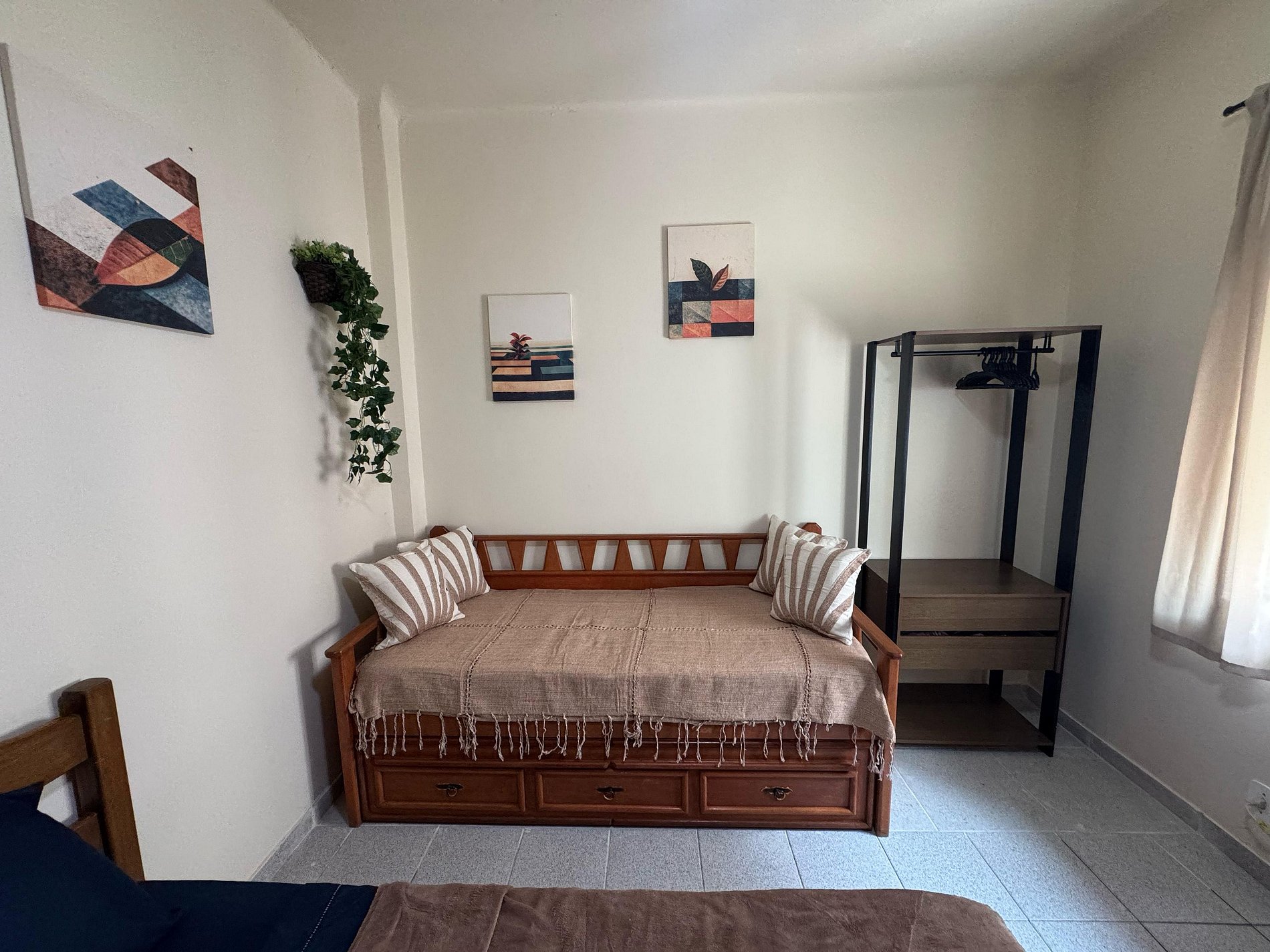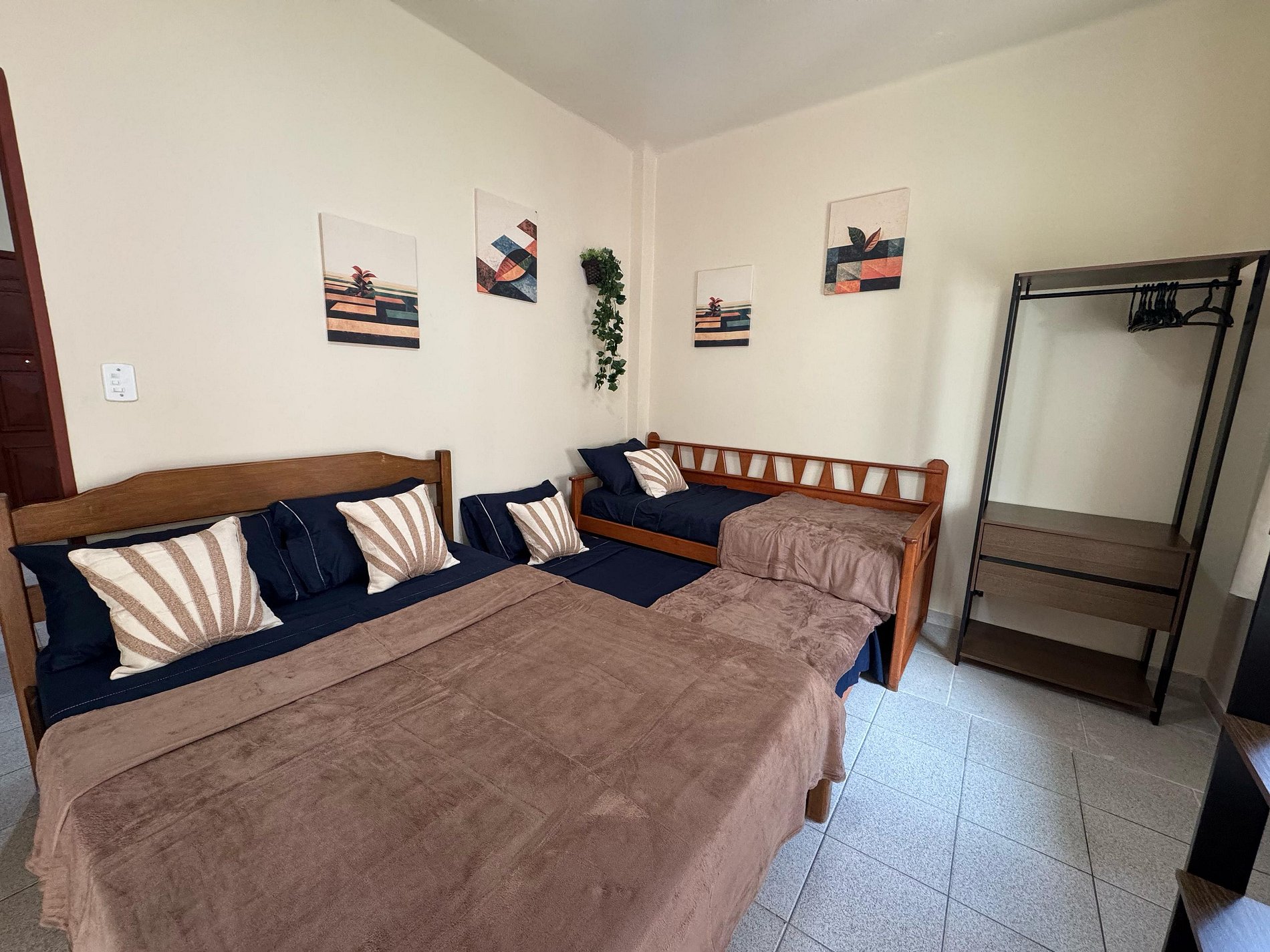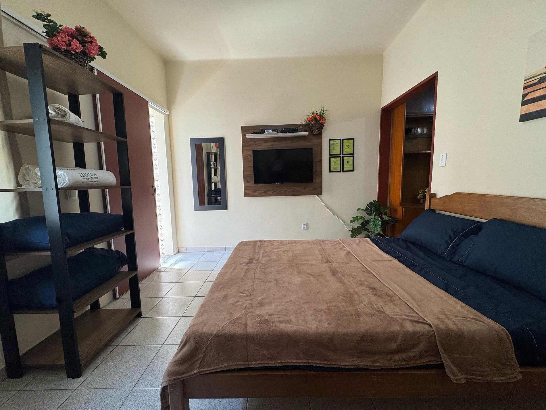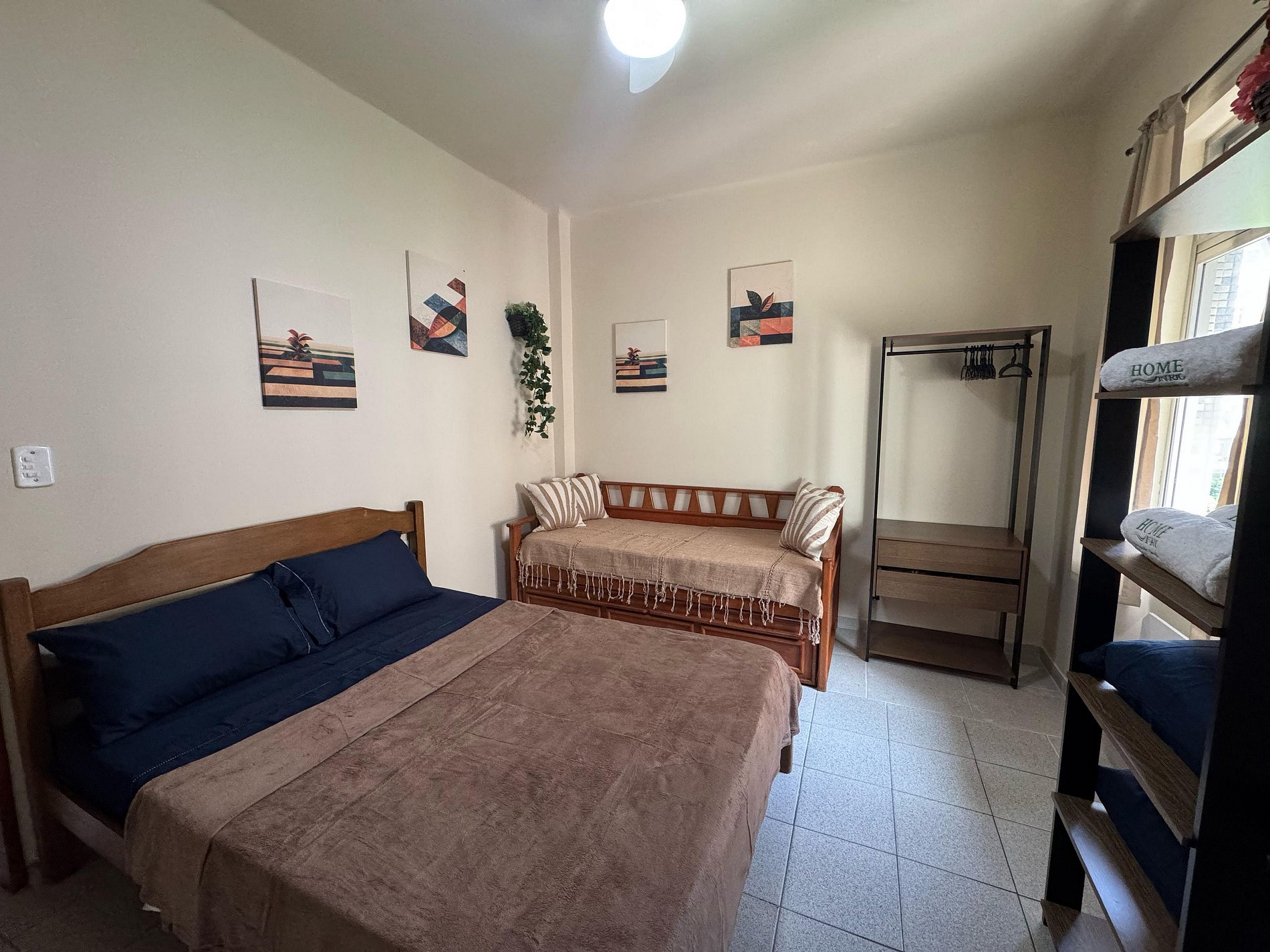 Quarto Confortável O quarto conta com uma cama de casal,uma bi-cama, enxoval limpo e de qualidade, além de um ambiente climatizado para noites tranquilas de descanso.