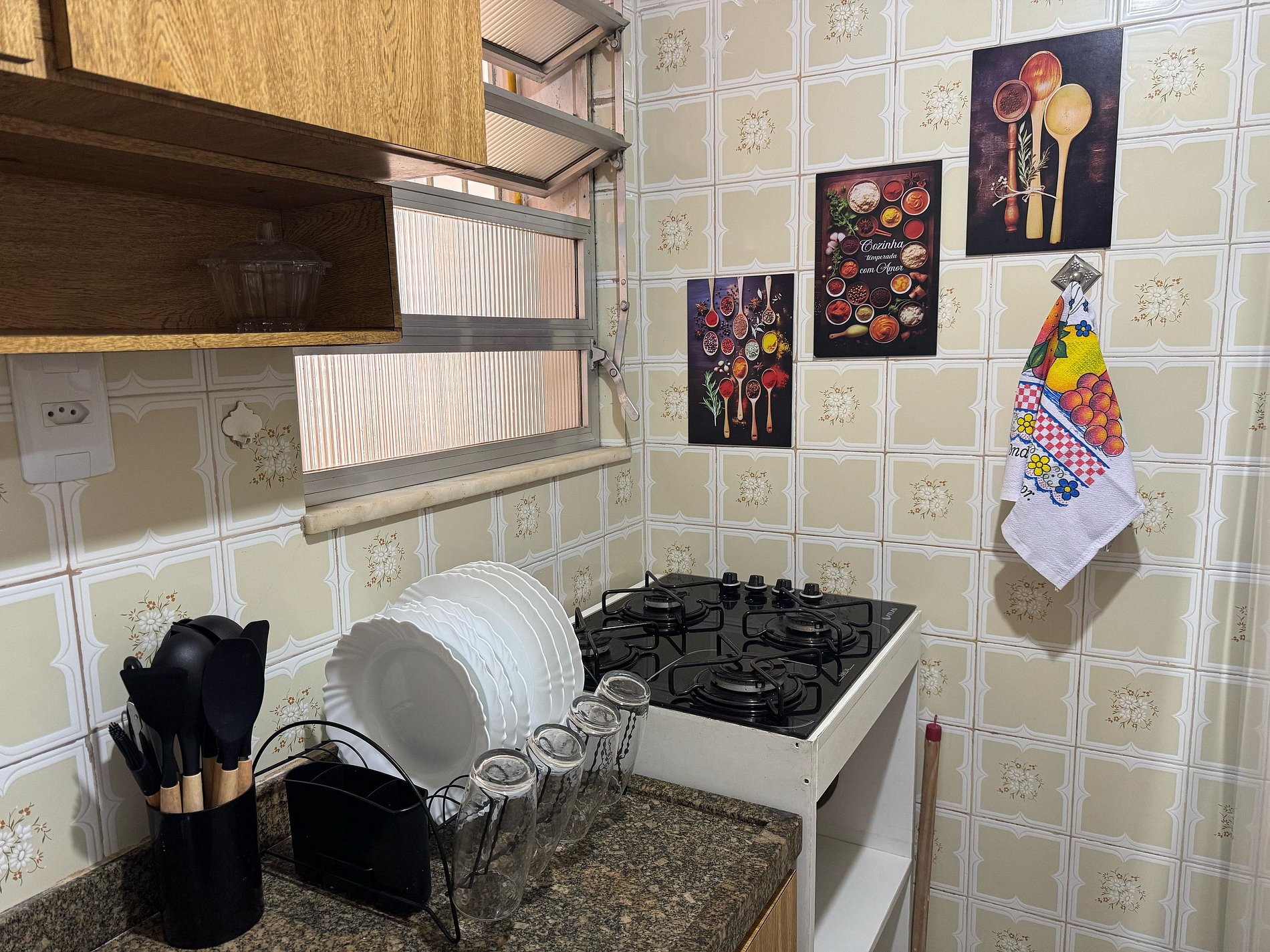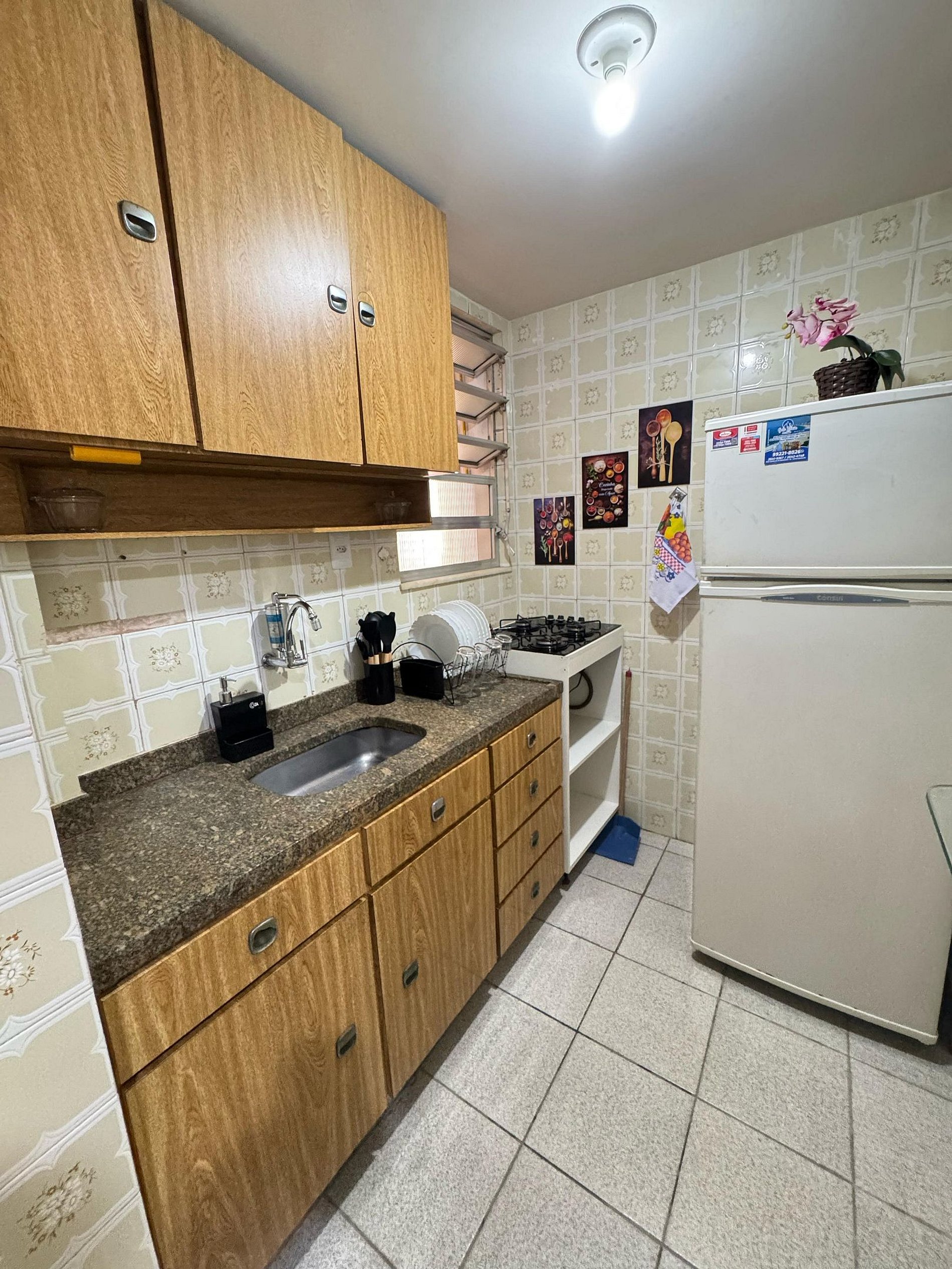 Cozinha Compacta e Funcional está equipada com utensílios básicos para preparar refeições simples: fogão, geladeira, cefeteira,panelas, pratos, talheres e copos.