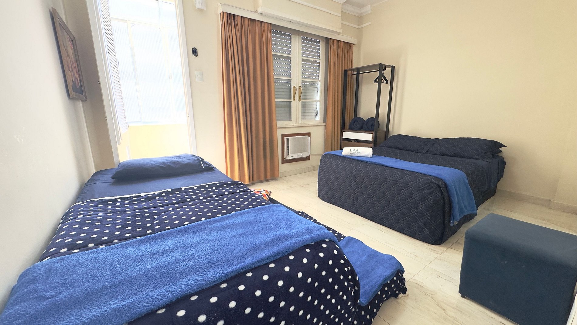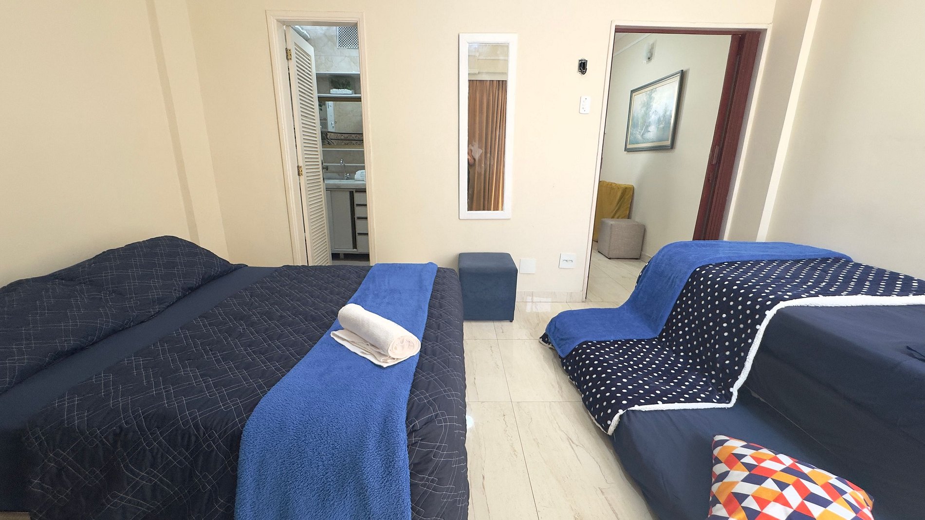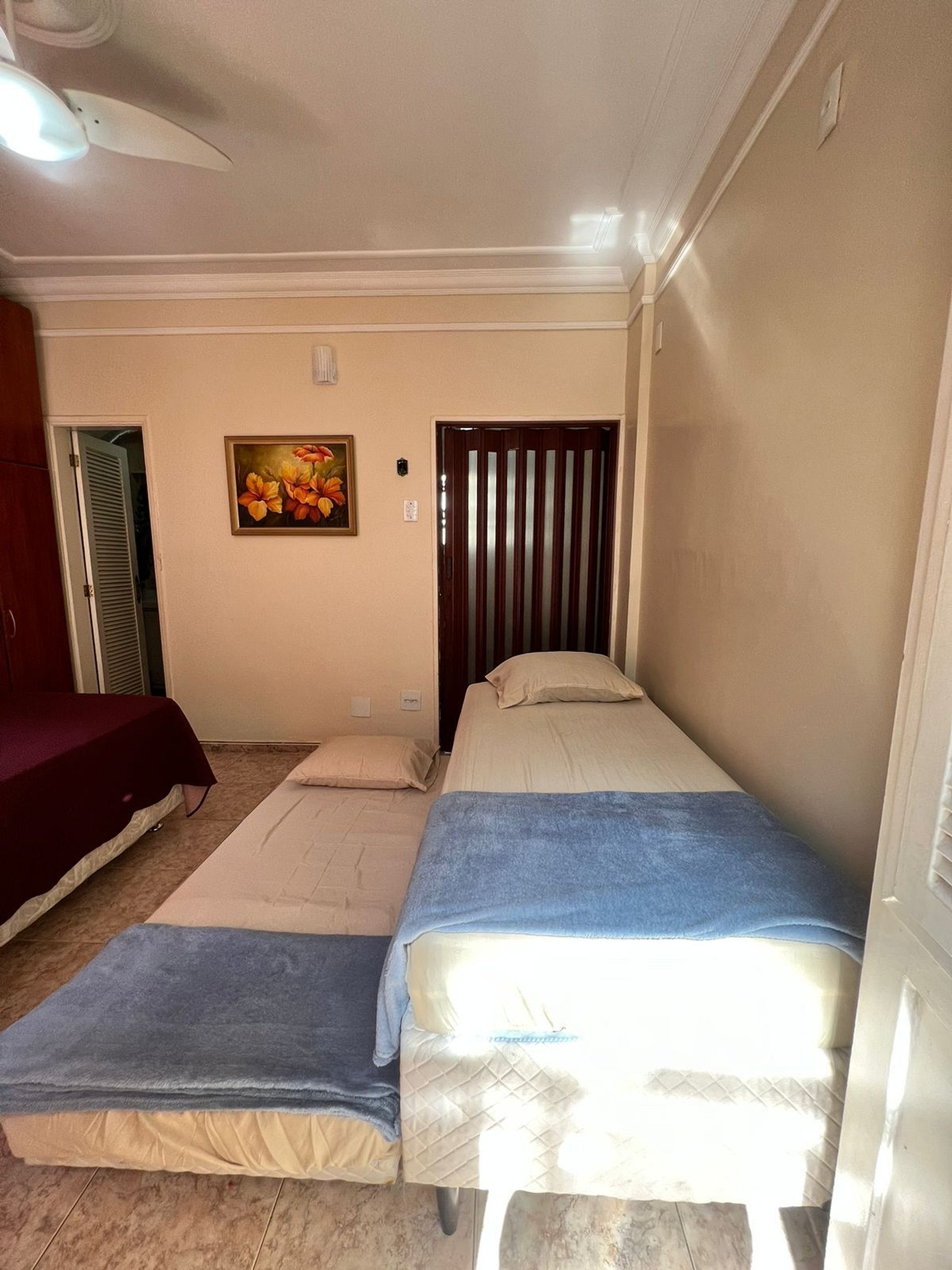 Acomodação confortável com 1 cama de casal e 2 camas de solteiro, perfeito para diferentes formações de grupo.