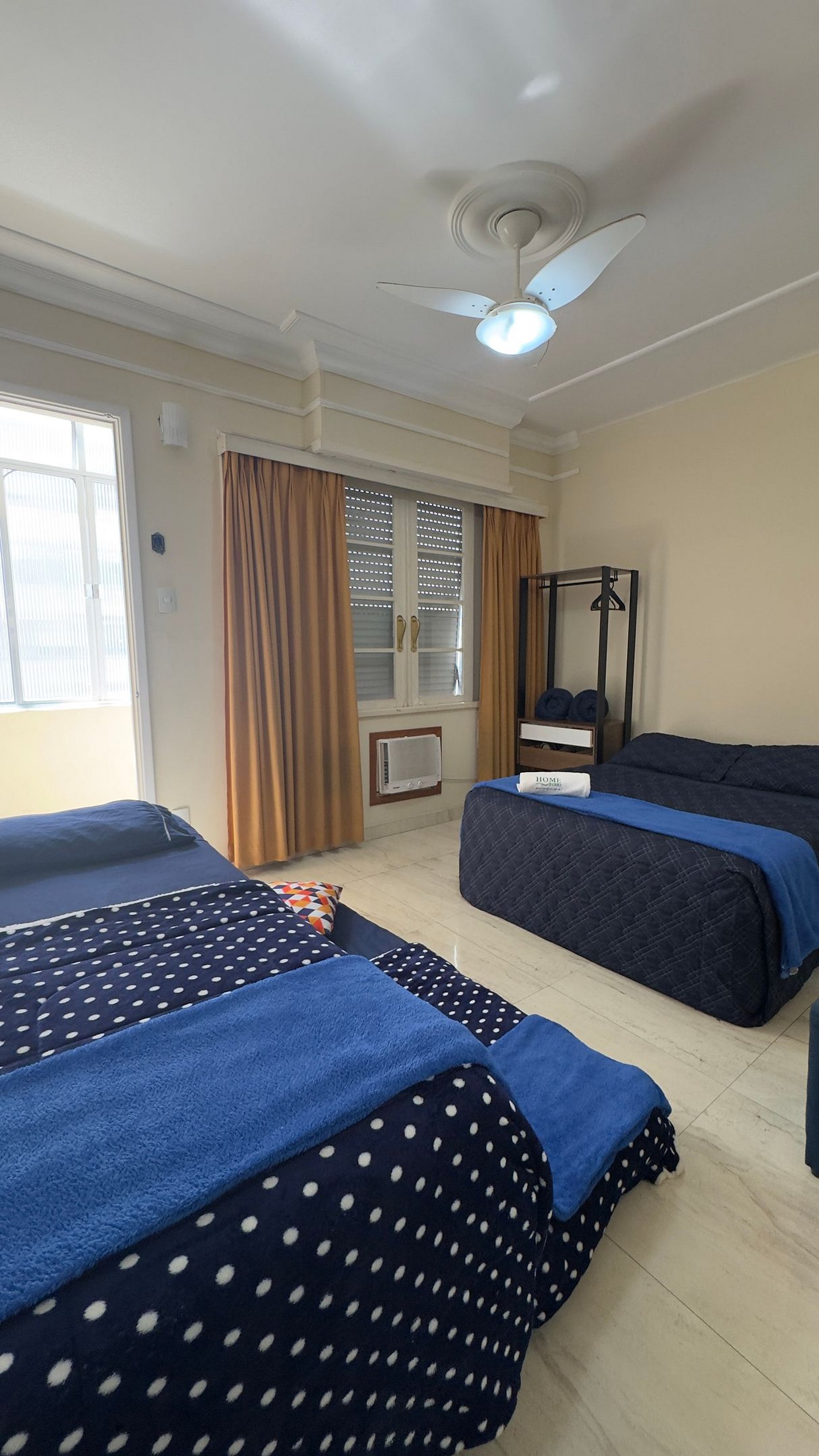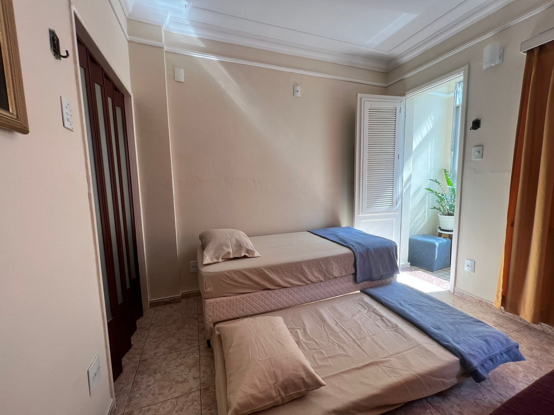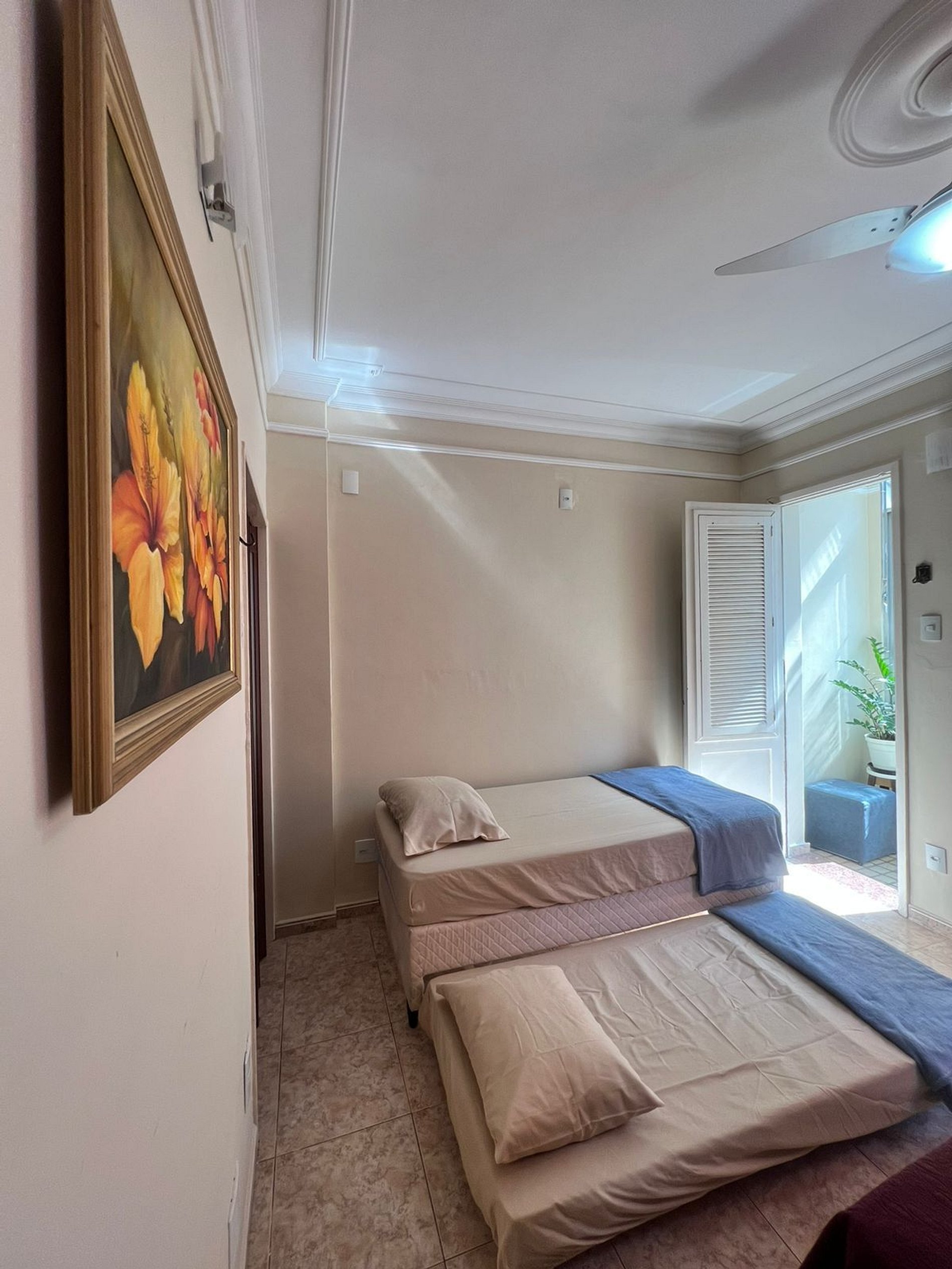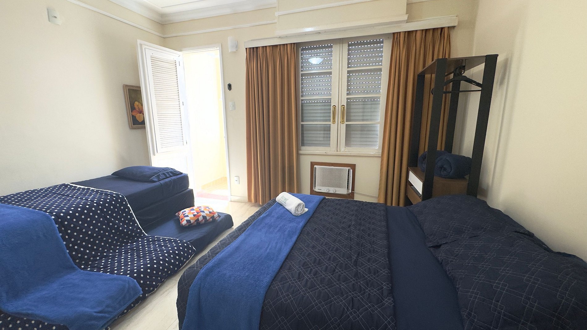 Acomodação confortável com 1 cama de casal e 2 camas de solteiro, perfeito para diferentes formações de grupo.