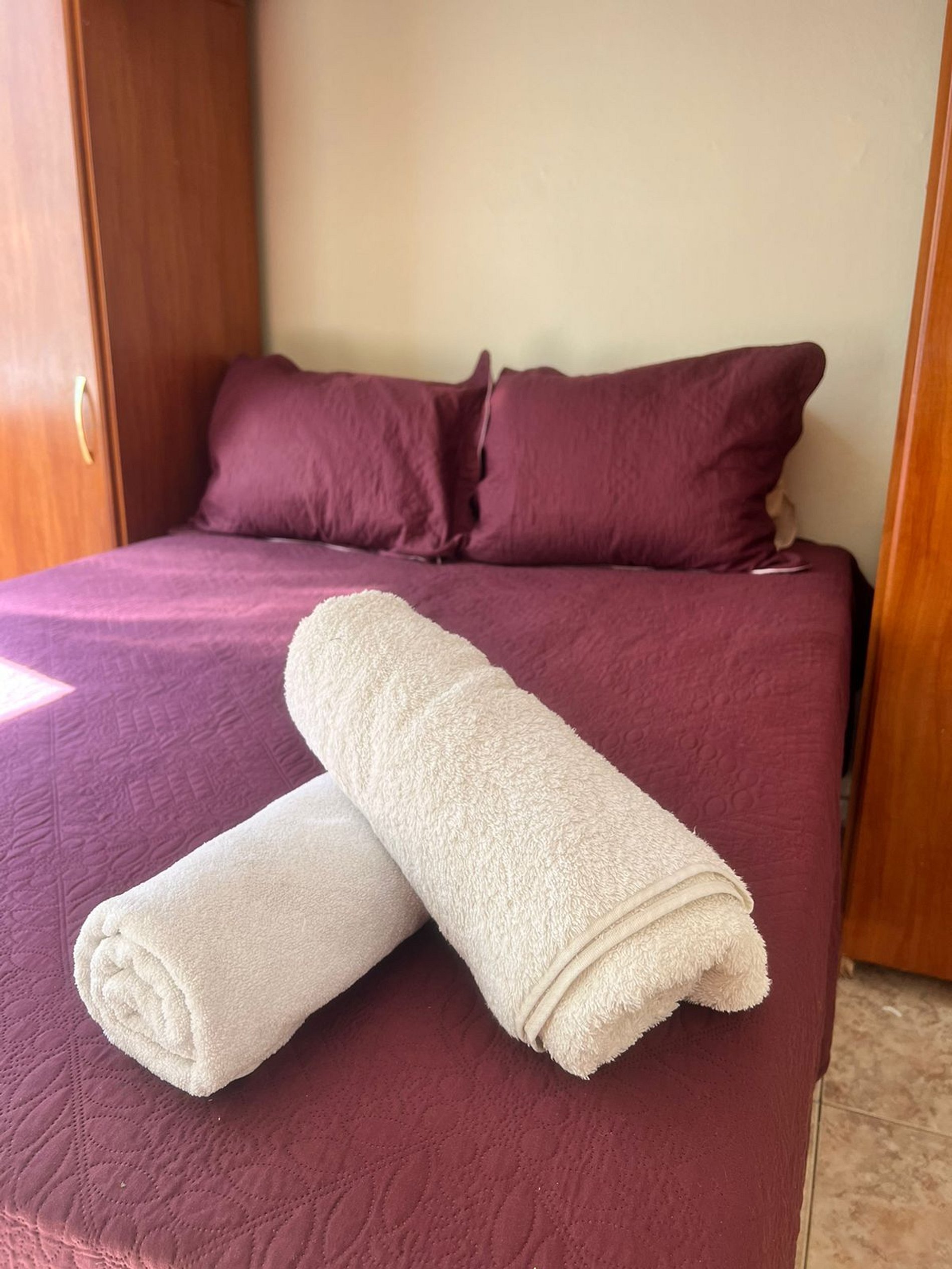 Acomodação confortável com 1 cama de casal e 2 camas de solteiro, perfeito para diferentes formações de grupo.