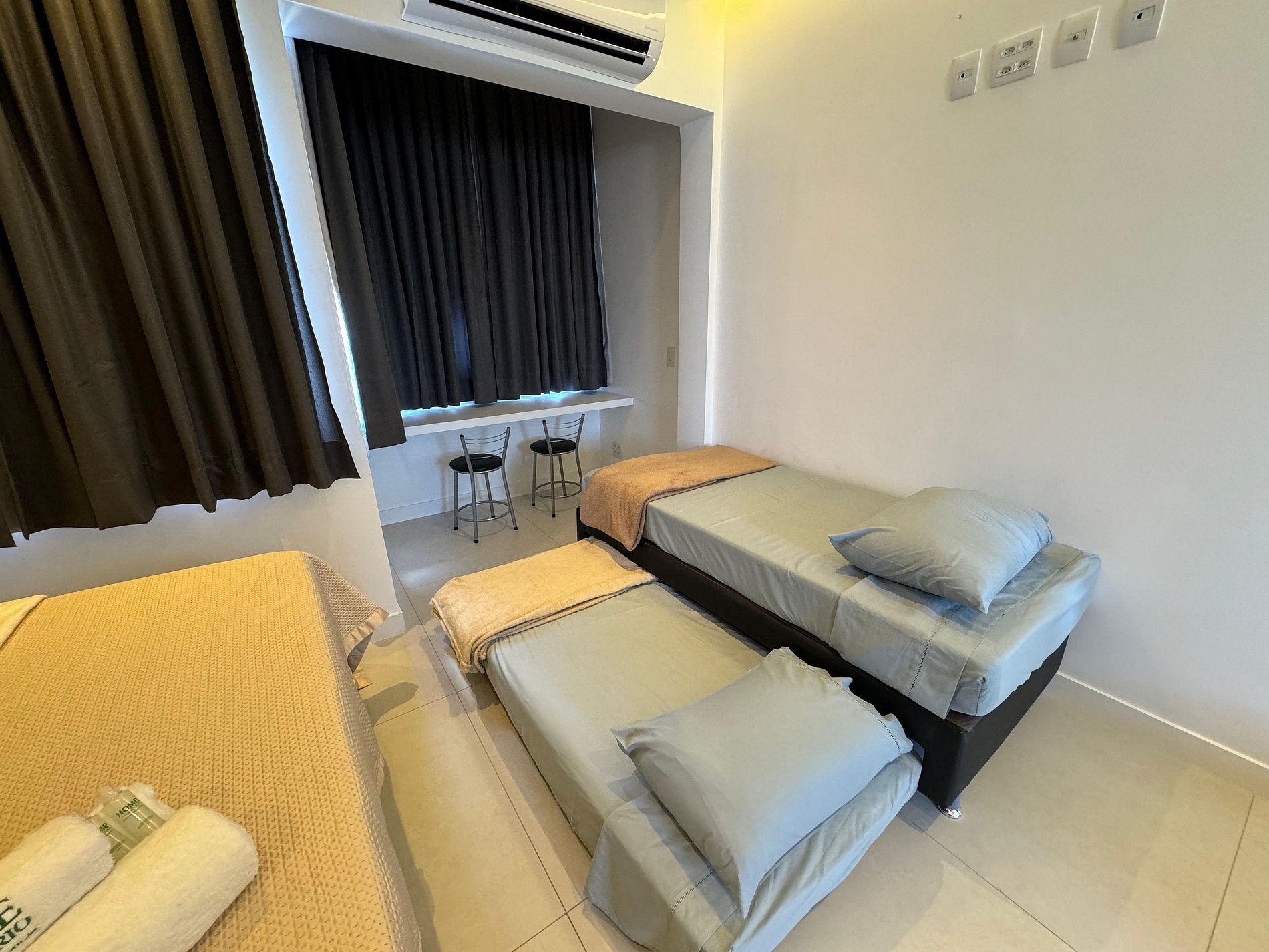 O quarto acomoda confortavelmente até três pessoas com uma cama de casal e uma bi-cama (duas camas de solteiro empilháveis). Equipado com ar-condicionado, cortina blackout para noites tranquilas, mesa para trabalho com boa iluminação, além de roupas de cama limpas e macias tudo pensado para o seu conforto.